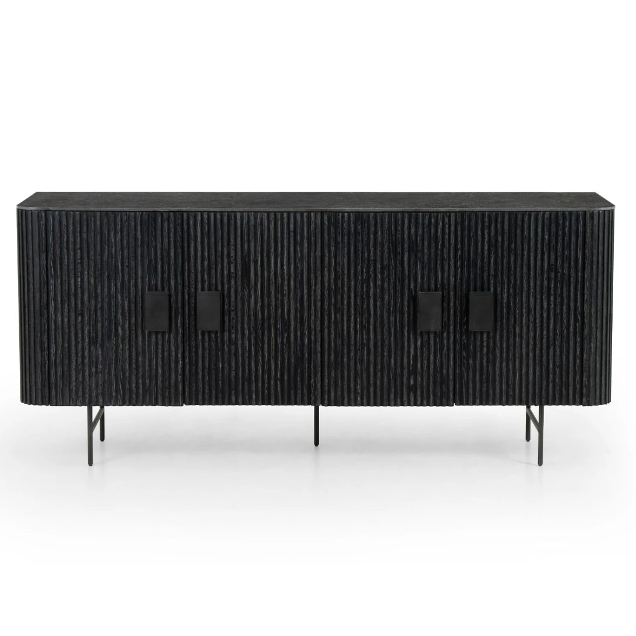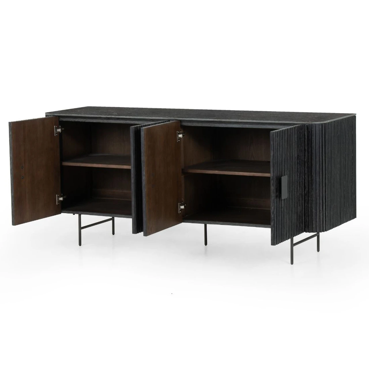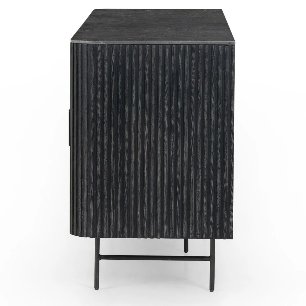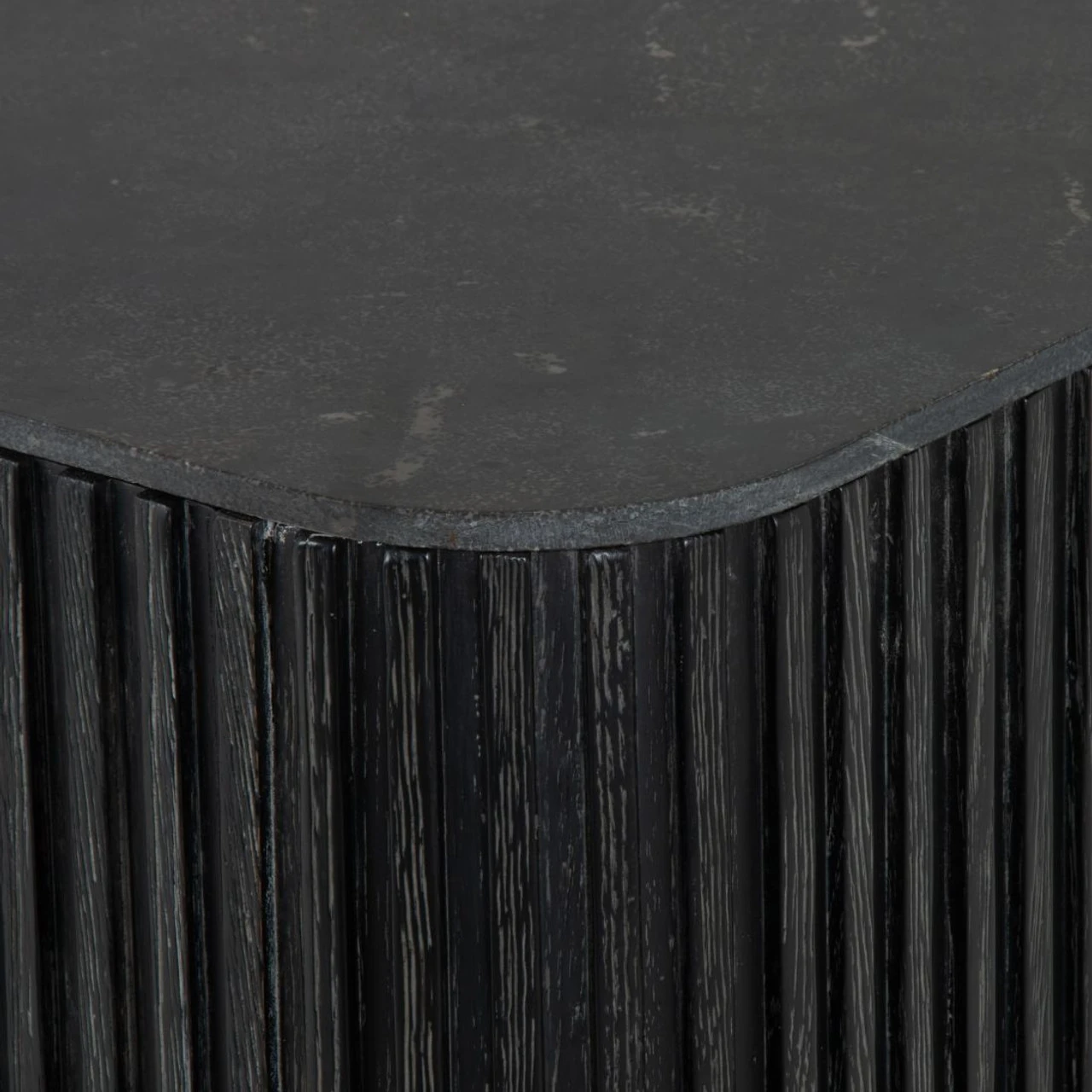 A clean mid-century form, modernized by mixed materials. Black oak casing is whitewashed for a ceruse-like look, with vertical reeding for rich texture. A smooth bluestone top adds a sophisticated element of surprise, while oversize iron hardware hints fresh edge. Posterior cutouts for cord management.
