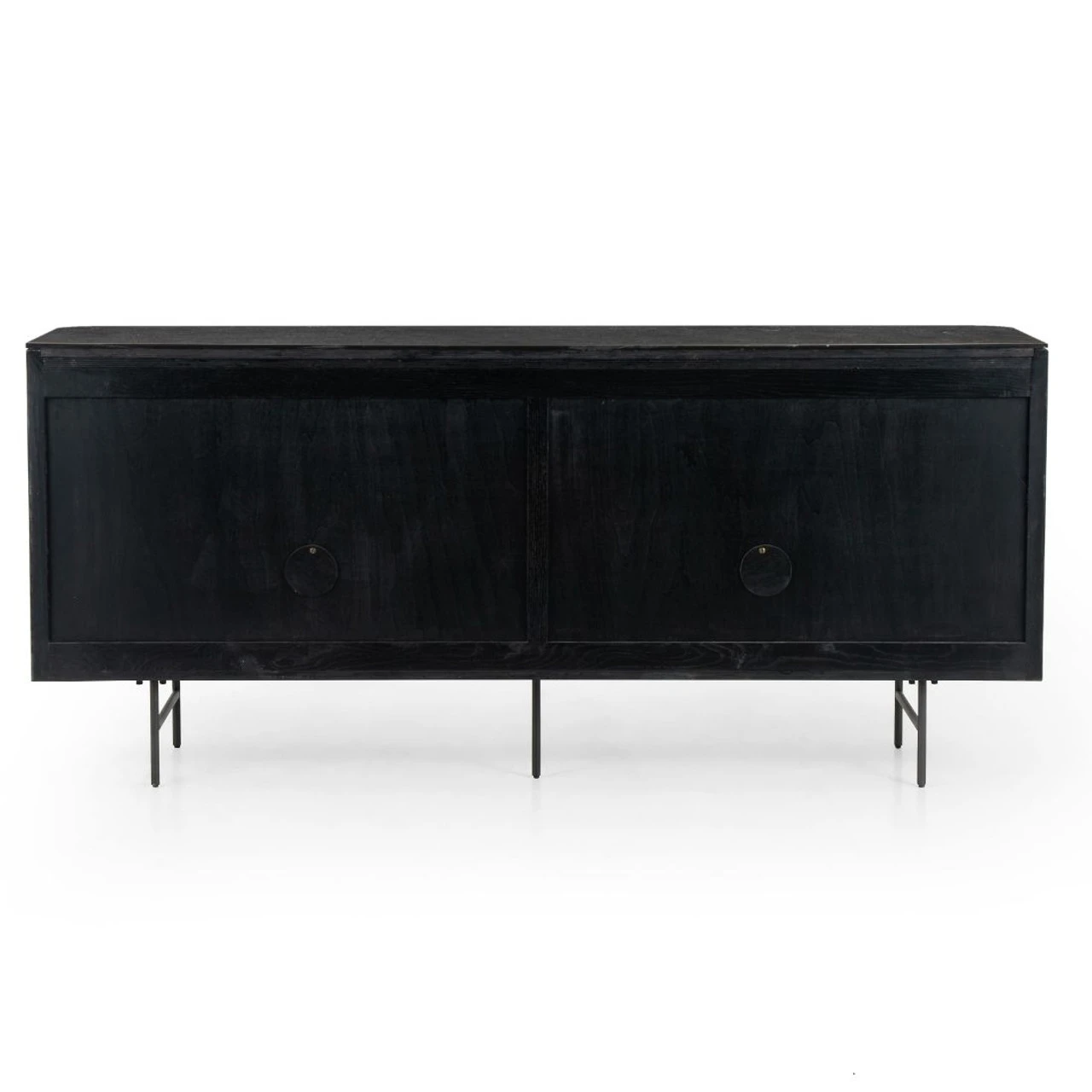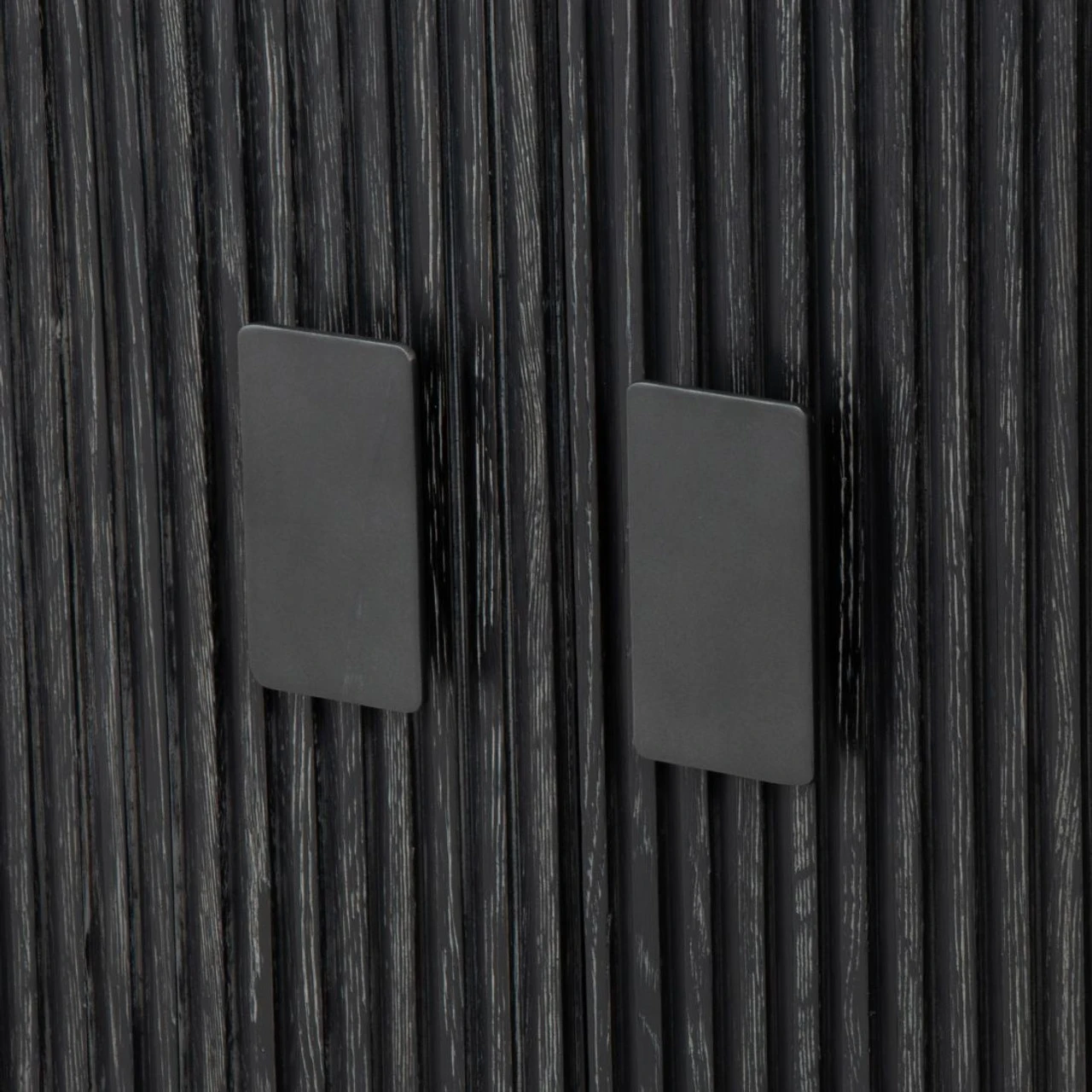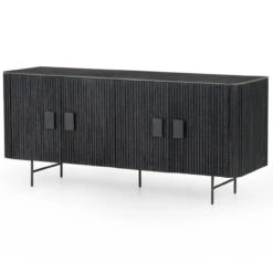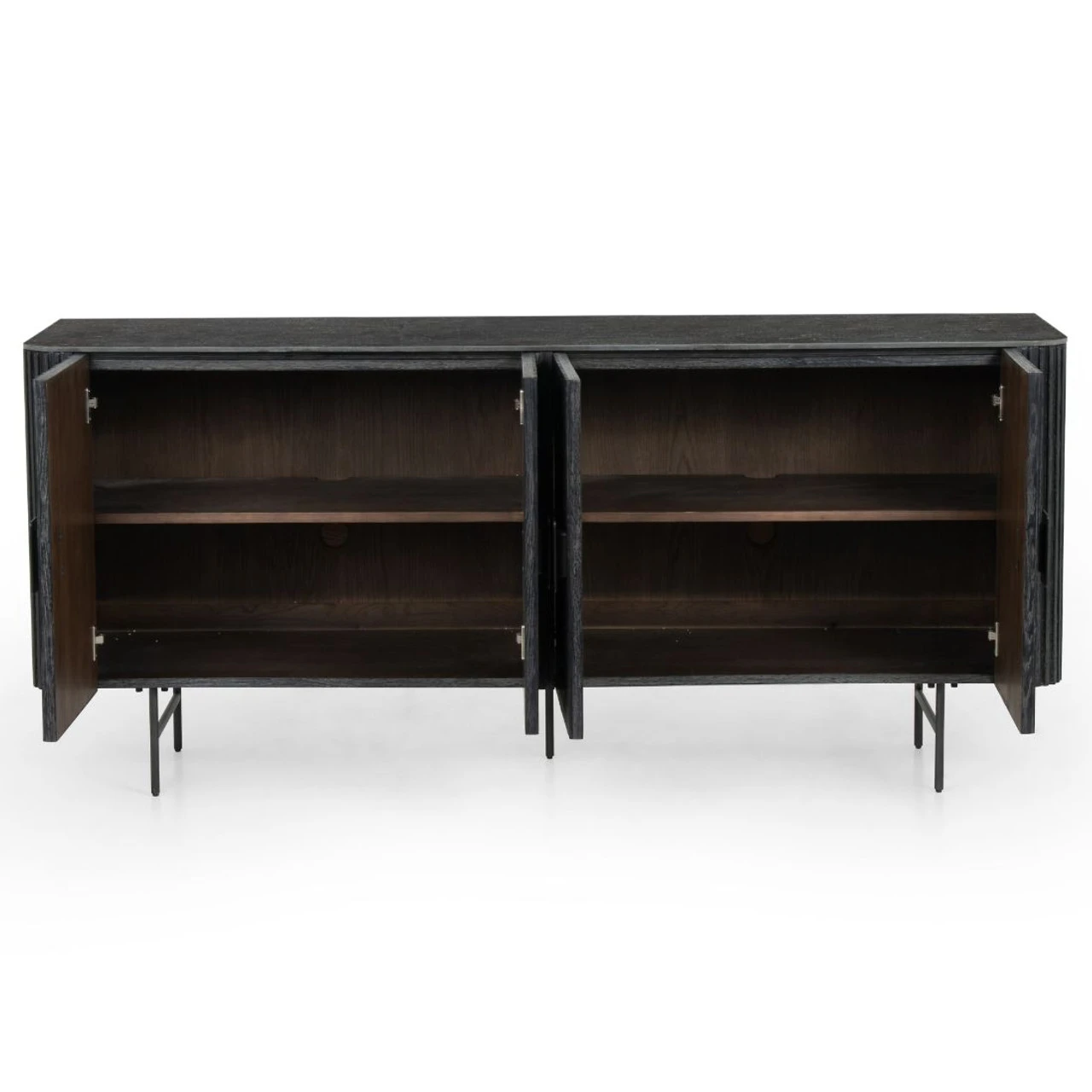 A clean mid-century form, modernized by mixed materials. Black oak casing is whitewashed for a ceruse-like look, with vertical reeding for rich texture. A smooth bluestone top adds a sophisticated element of surprise, while oversize iron hardware hints fresh edge. Posterior cutouts for cord management.