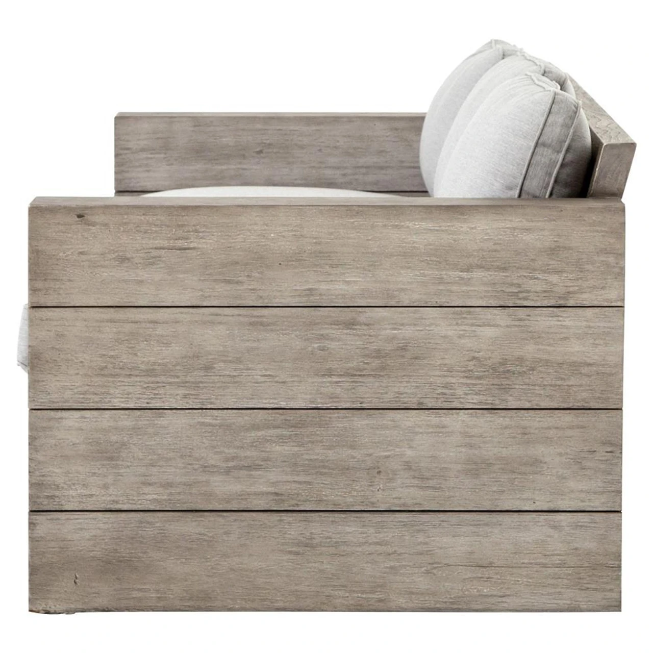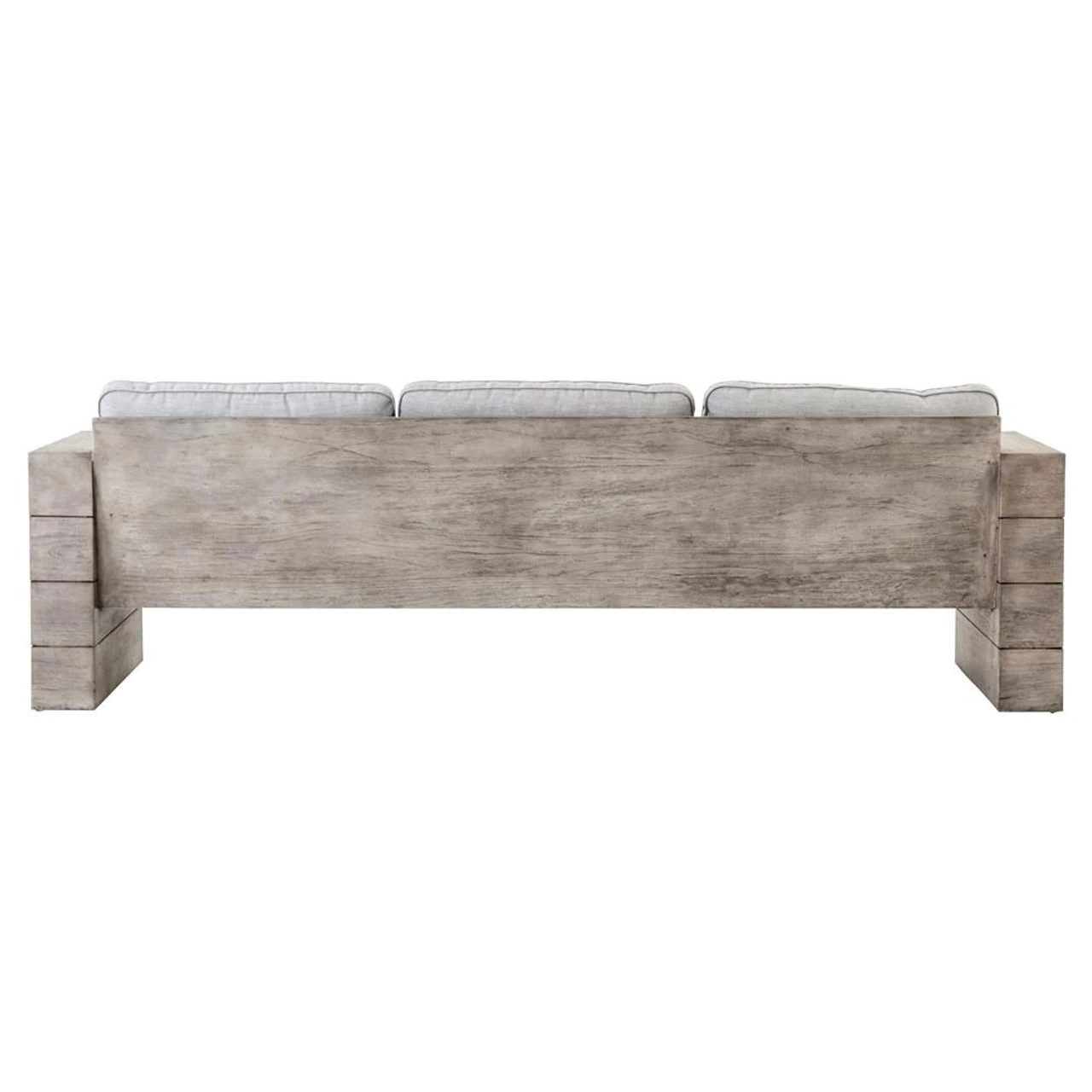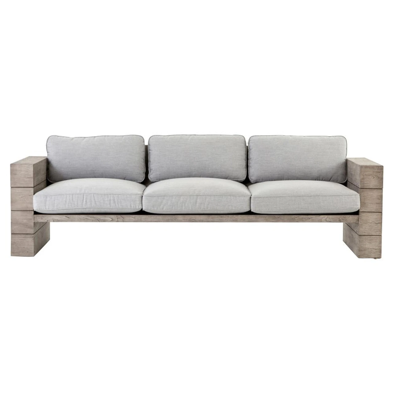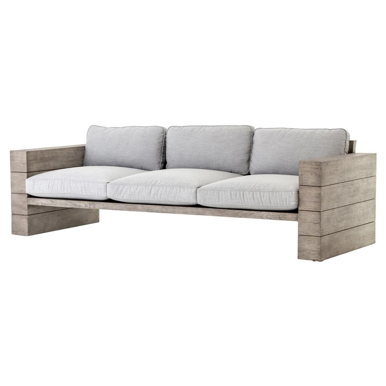 Clean and angular for modern effect. Oversized planks of weathered grey teak frame wide, low-styled sofa seating. Acrylic cushions take on a canvas granite hue for a neutral look. With its soft and modern minimalist design, our teak wood outdoor sofa makes an elegant addition to any outdoor space.