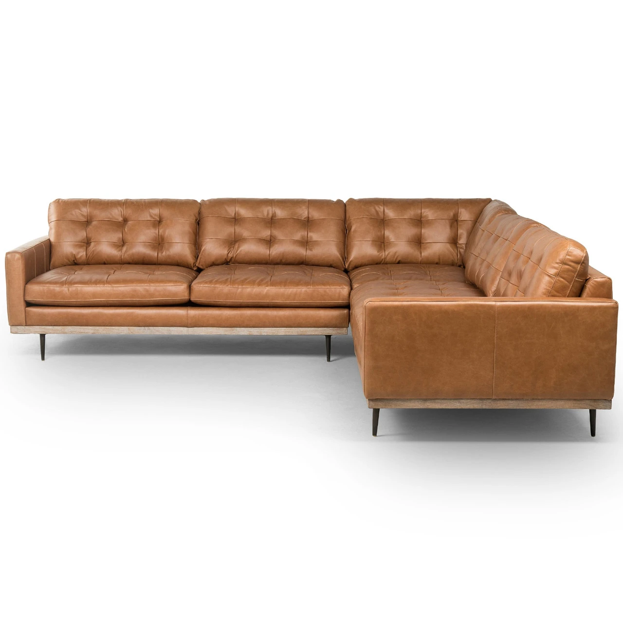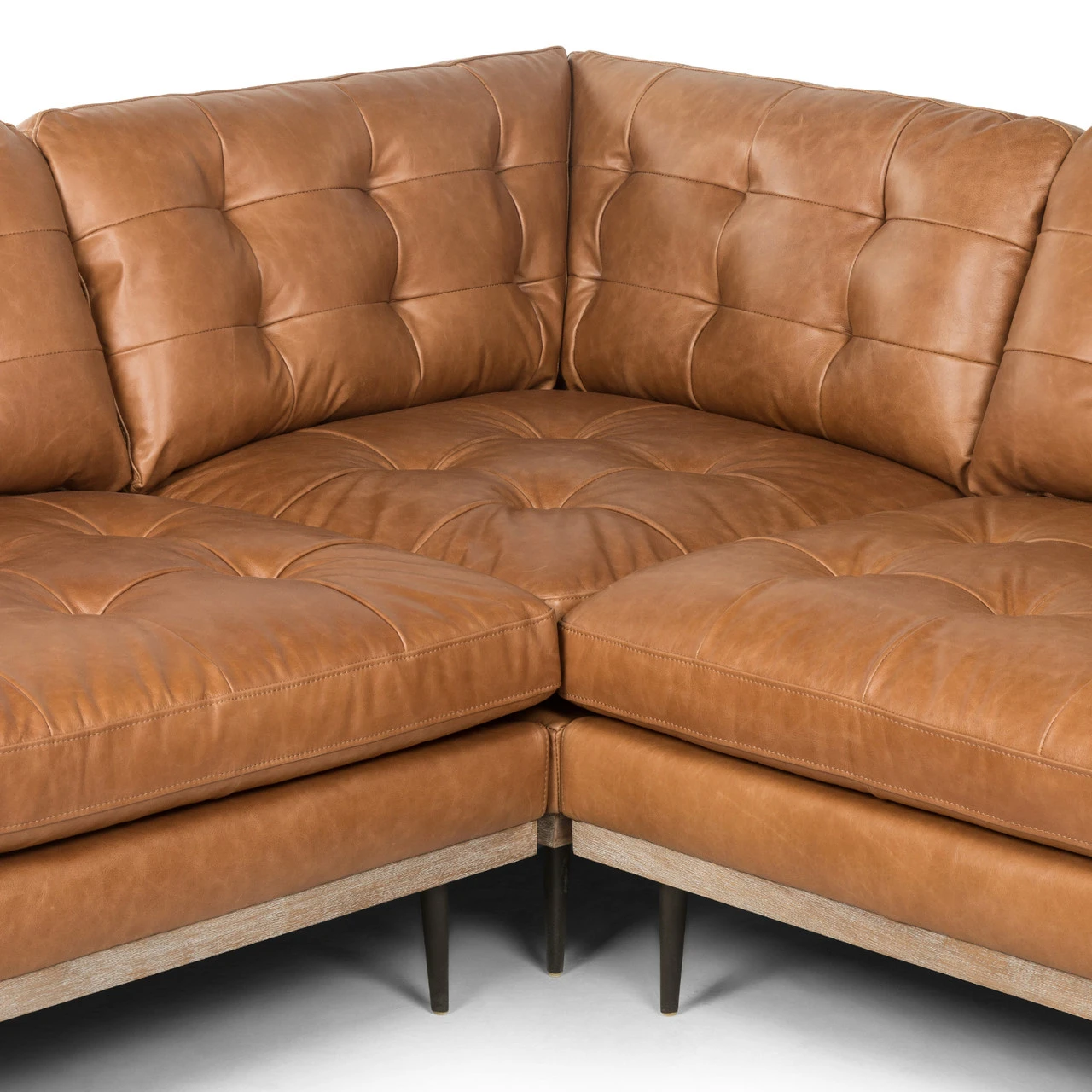 Low-leaning style meets mid-century vibes. Upholstered in a butterscotch top-grain leather, with button tufting for textural comfort. Wrap-around framing and cone-tapered legs bring fine finishing touches to the three-piece sectional.
