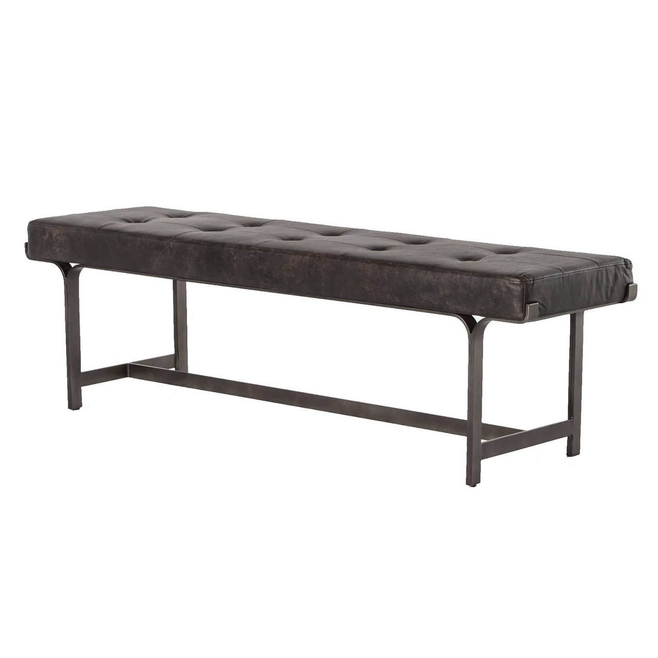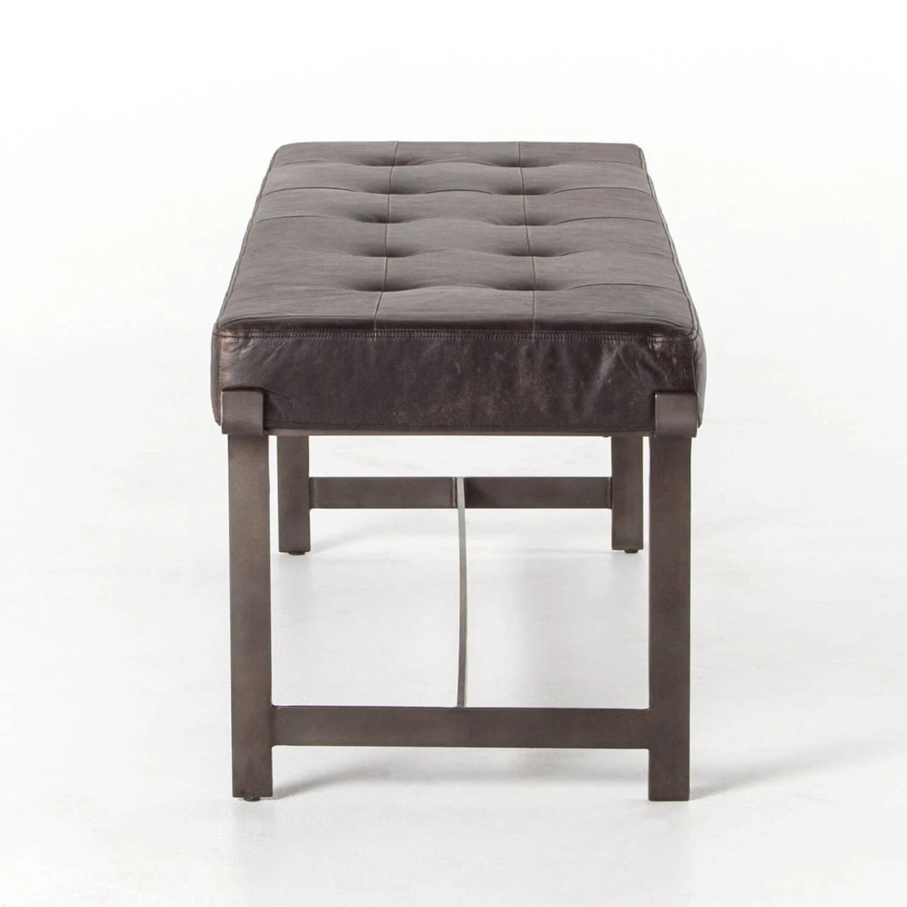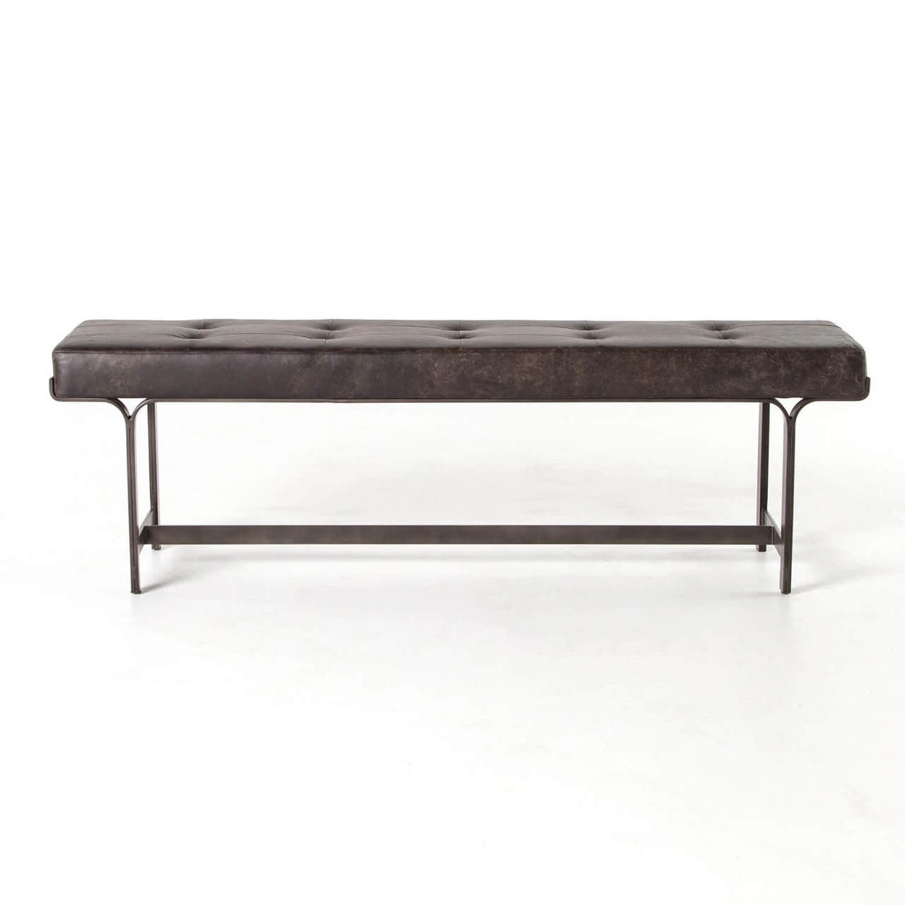 Stately bench is covered in soft, ebony waxed leather with traditional tufting and supported by a simple iron base. Striking at the foot of a bed or anywhere an extra seat is needed.