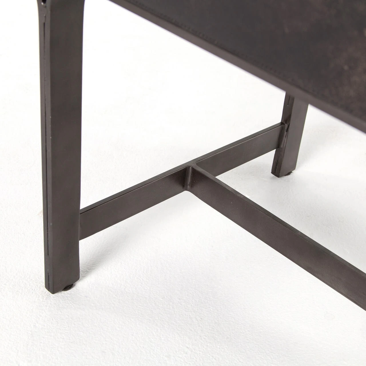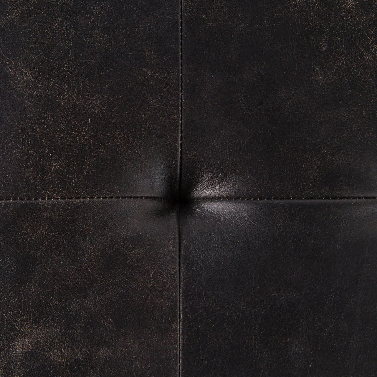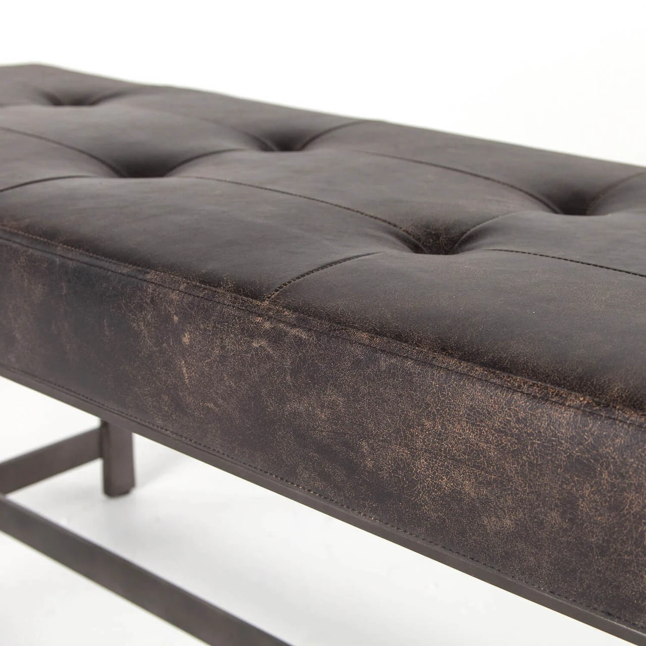 Stately bench is covered in soft, ebony waxed leather with traditional tufting and supported by a simple iron base. Striking at the foot of a bed or anywhere an extra seat is needed.