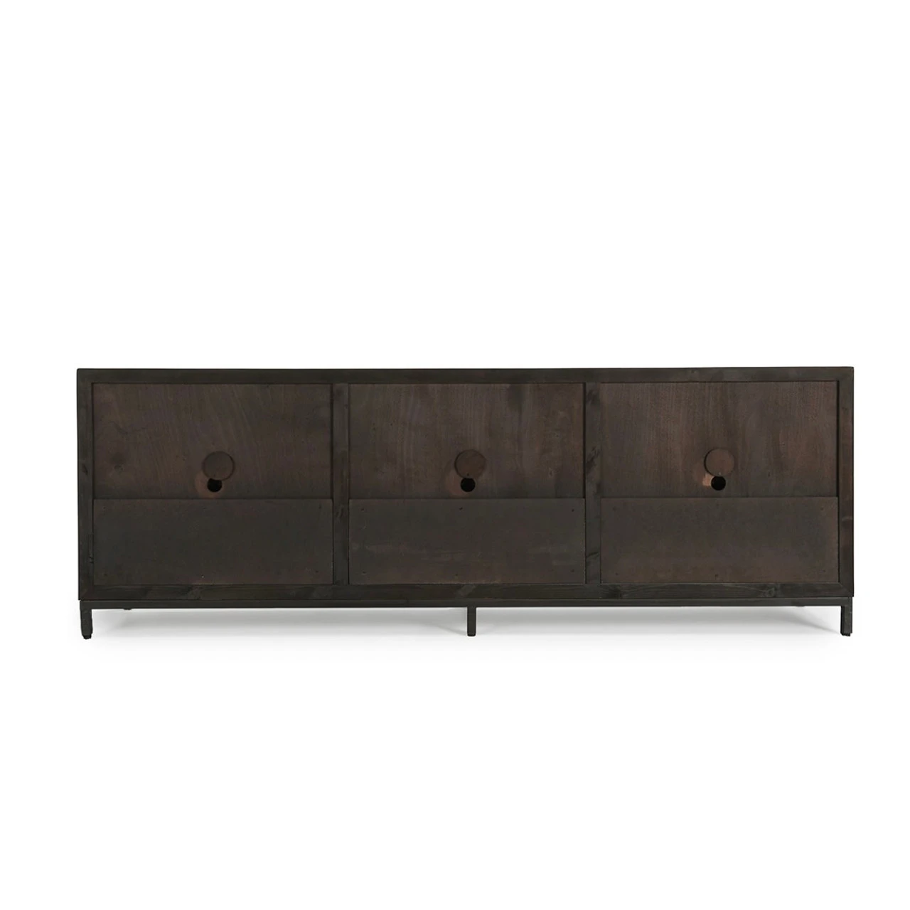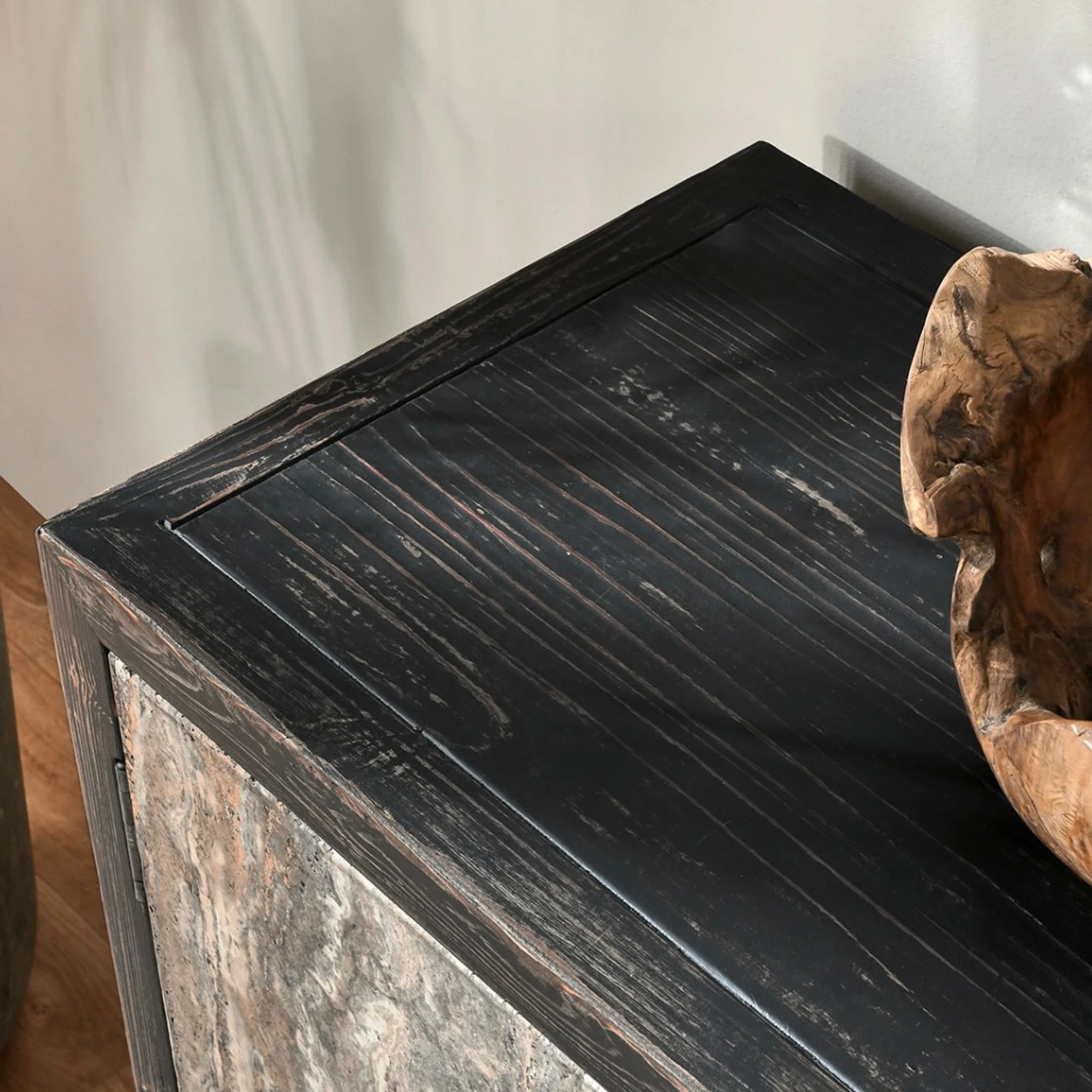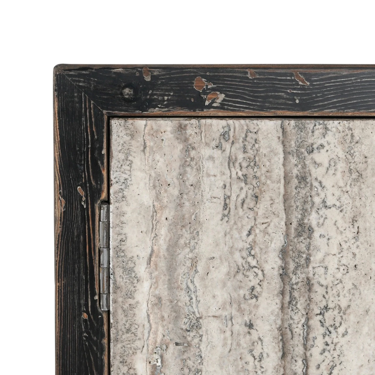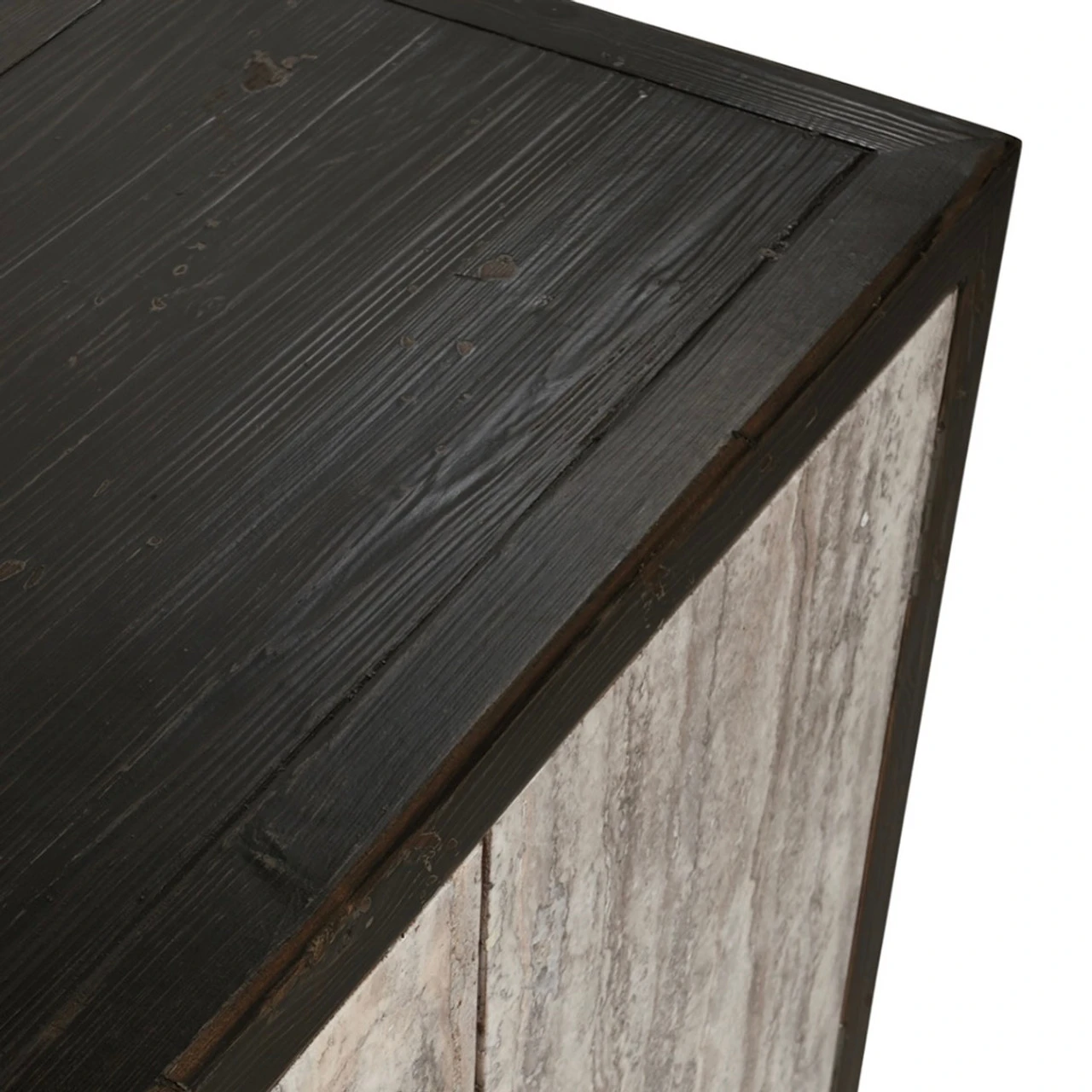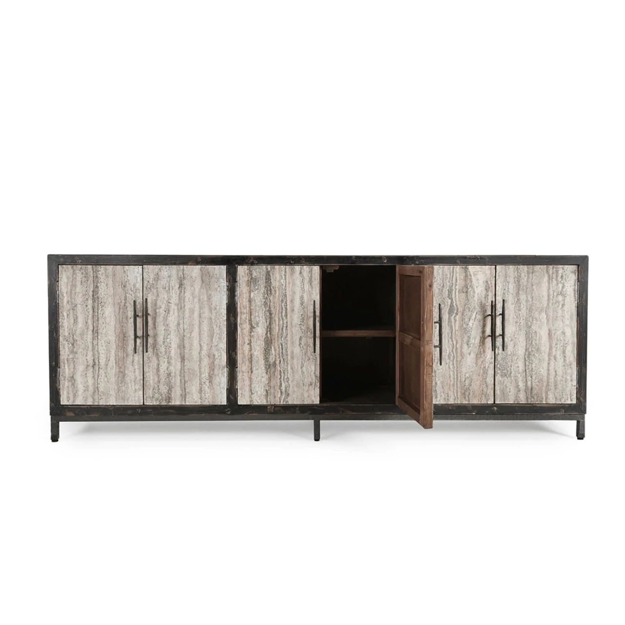 Smooth travertine doors contrast against the reclaimed pine wood frame of this handsome sideboard. Each piece of travertine is hand-selected, choosing them for their unique colors and veining patterns. These natural variations are expected and contribute to the sideboard’s organic aesthetic. No two are exactly alike.