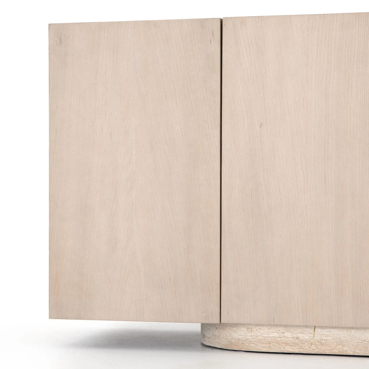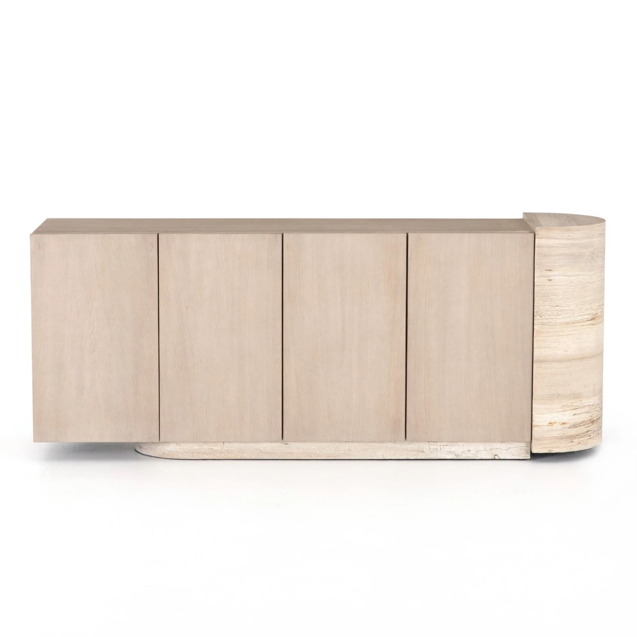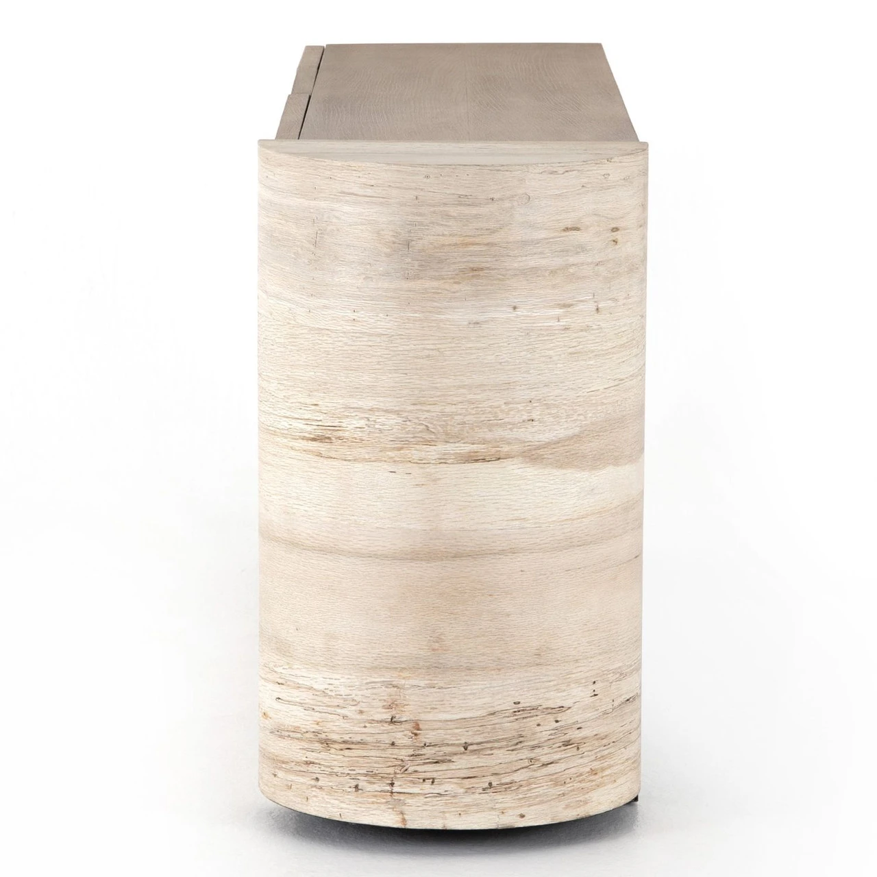 Organic in tone, sculptural in spirit. Inspired by bold Eighties-era design, a raised half-cylinder pedestal and curved plinth-style base of bleached spalted oak flanks one side of this imaginative sideboard, lending asymmetric intrigue to pale oak veneer casing. Push-latch doors open to partitioned spaces offering plenty of interior storage with removable adjustable shelves, plus rear cutouts for cord management.