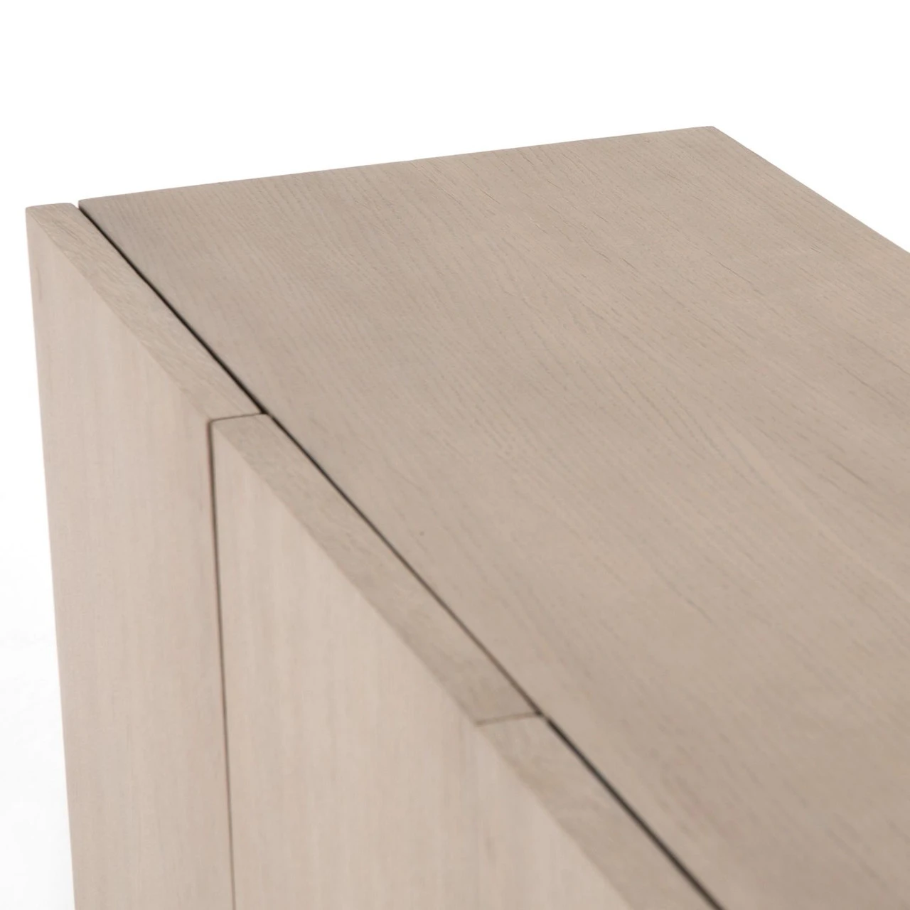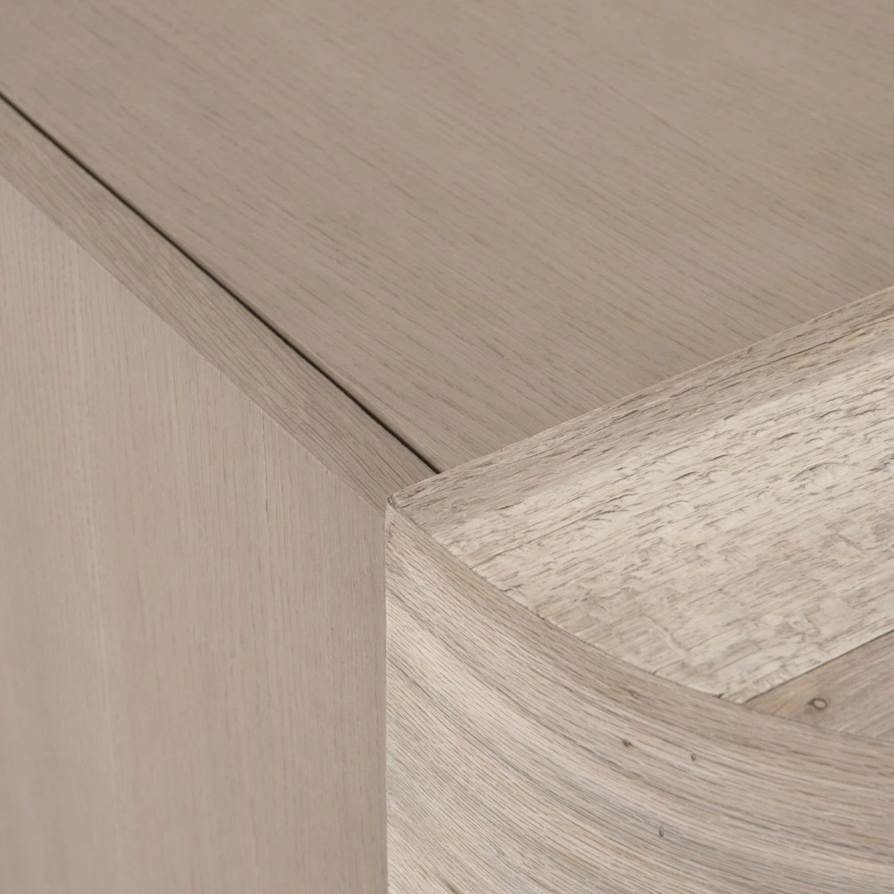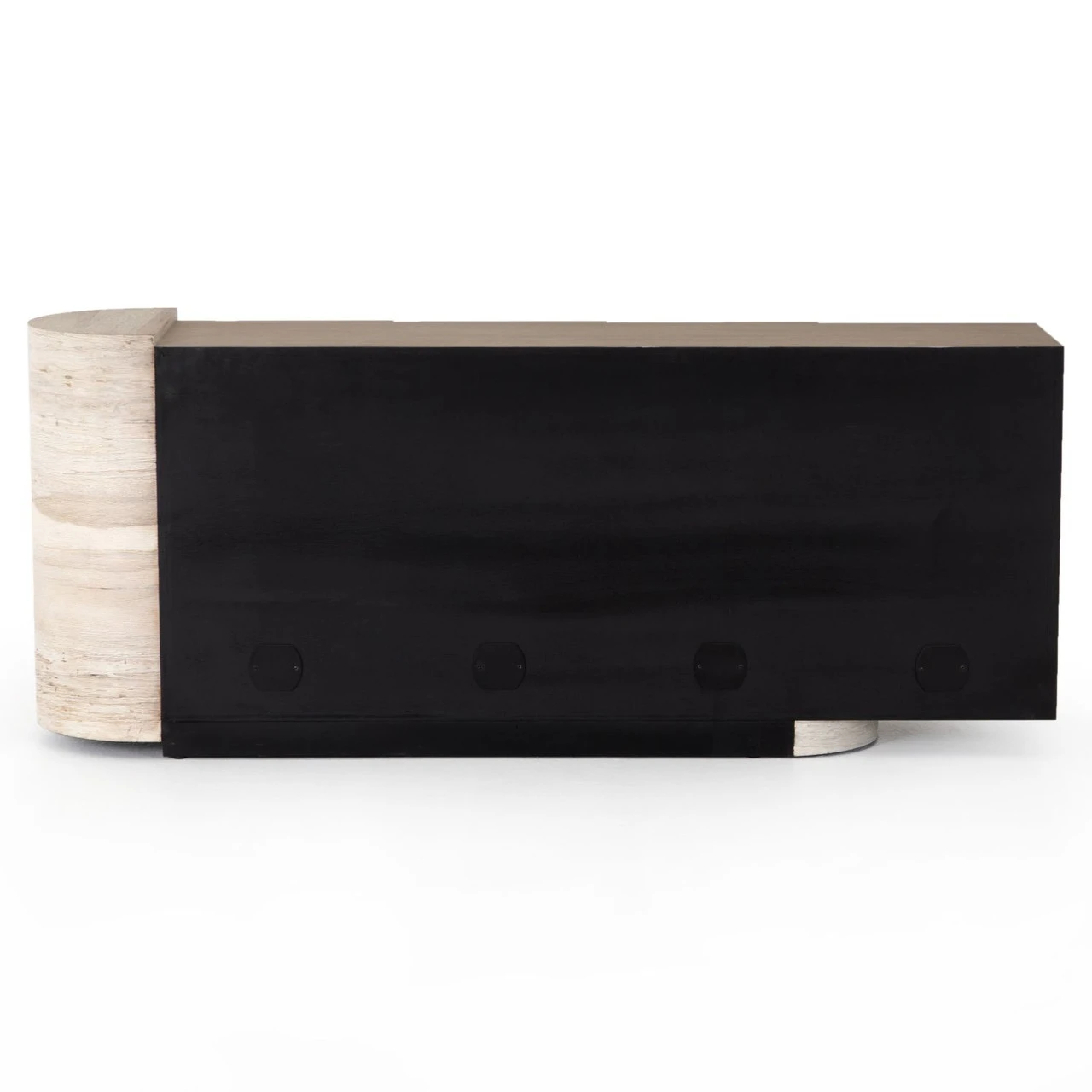 Organic in tone, sculptural in spirit. Inspired by bold Eighties-era design, a raised half-cylinder pedestal and curved plinth-style base of bleached spalted oak flanks one side of this imaginative sideboard, lending asymmetric intrigue to pale oak veneer casing. Push-latch doors open to partitioned spaces offering plenty of interior storage with removable adjustable shelves, plus rear cutouts for cord management.