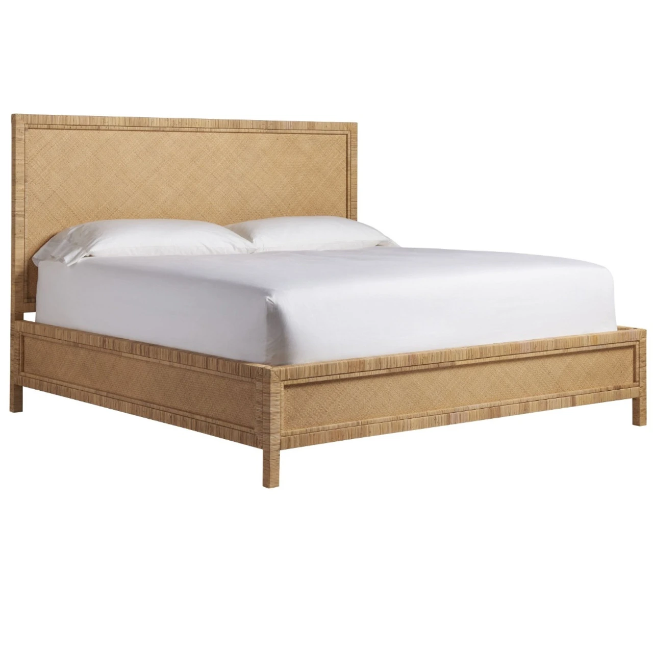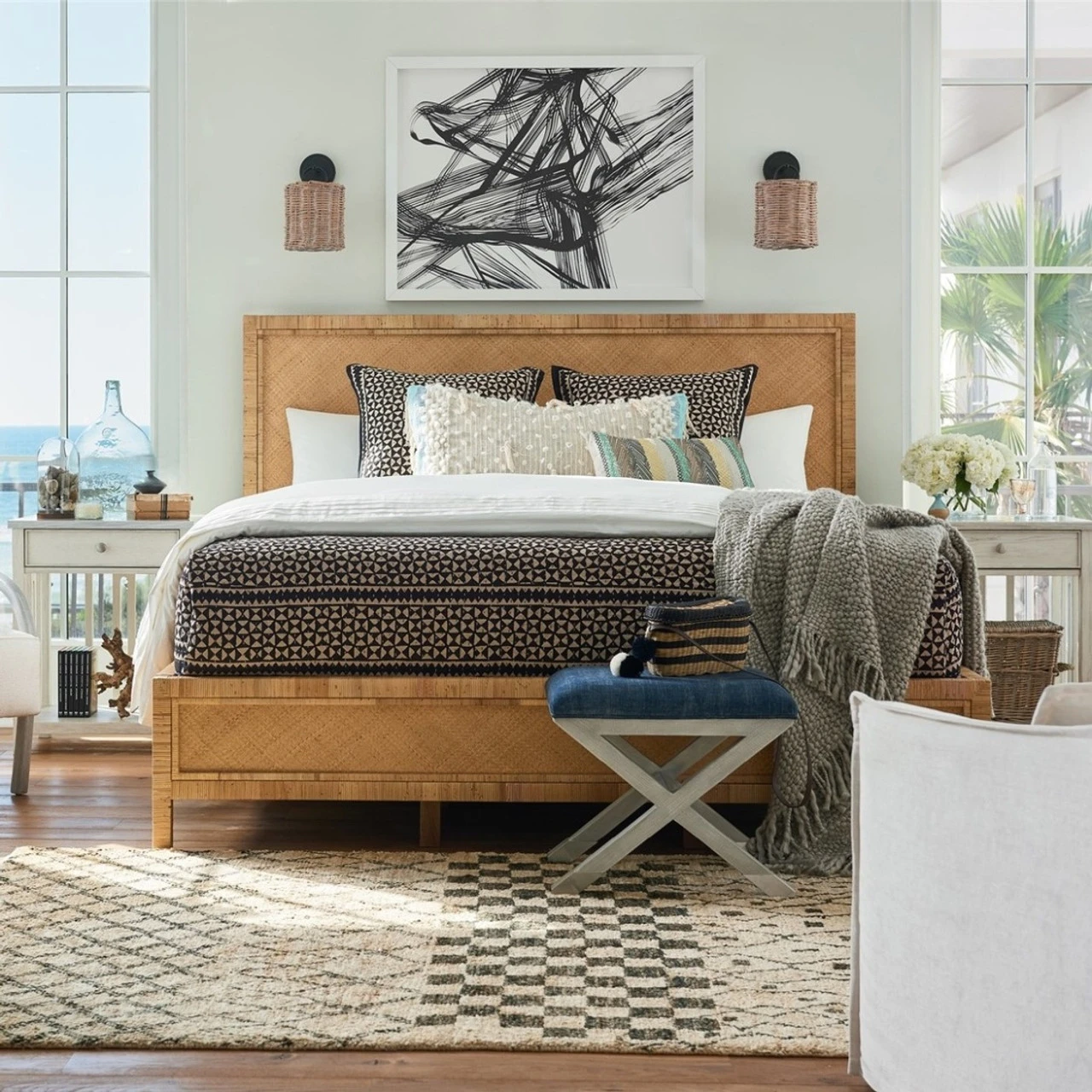Invite casual composure into spaces with the Long Key Woven Cane Bed, a stunning bedroom furnishing crafted with layers of natural rattan and raffia displayed in a series of striking angles. Our Long Key Woven Cane Queen Bed brings a relaxed coastal beach look to any bedroom decor.