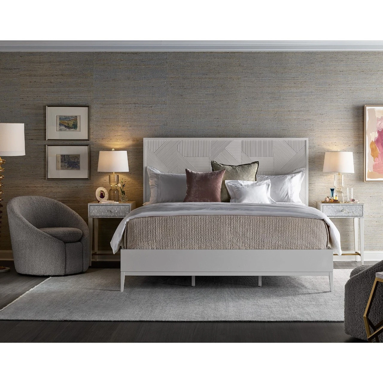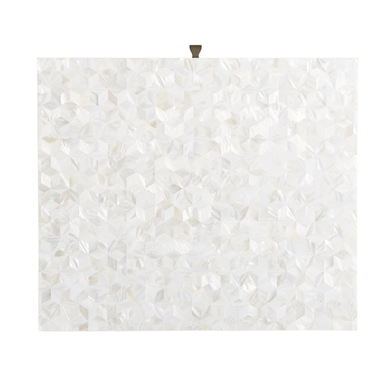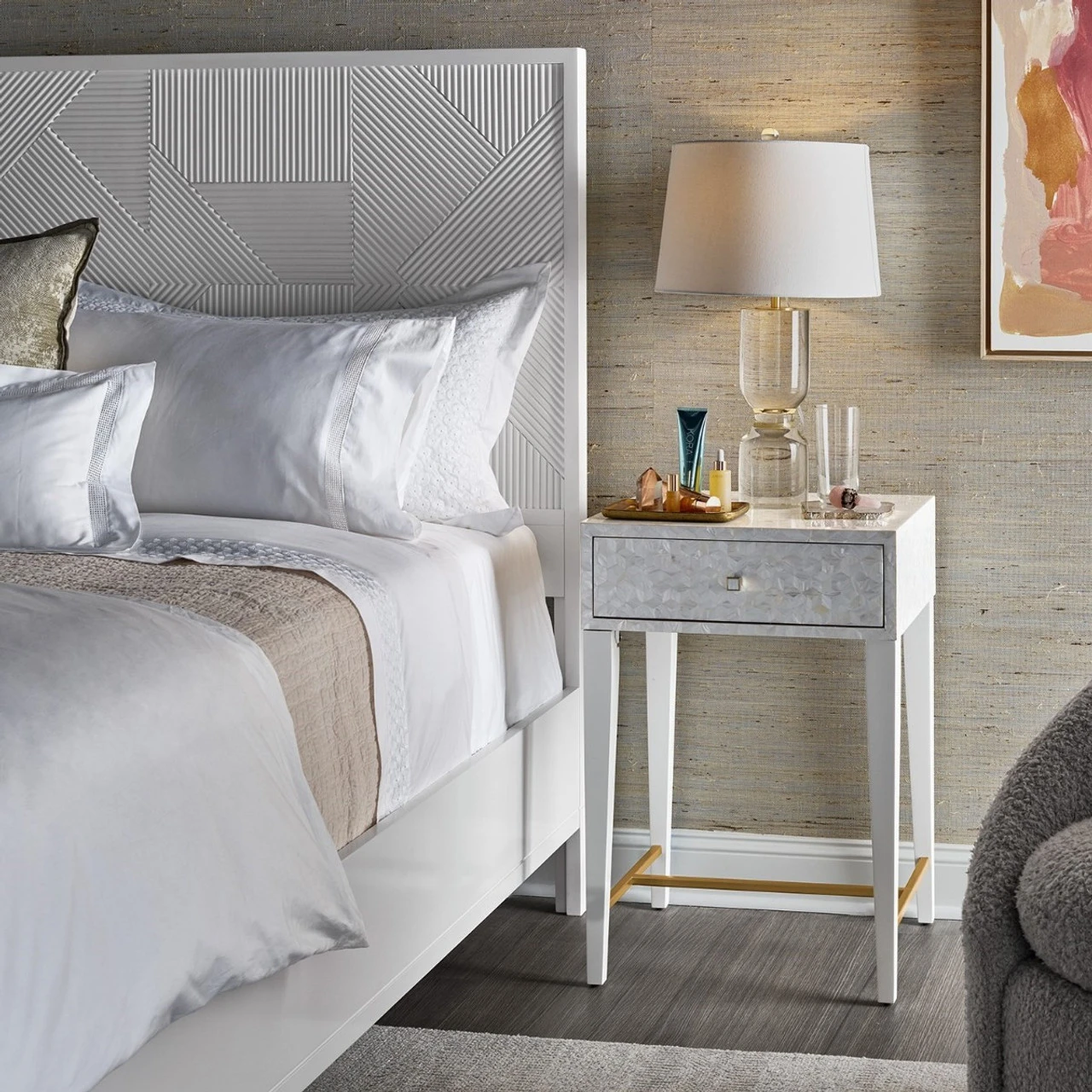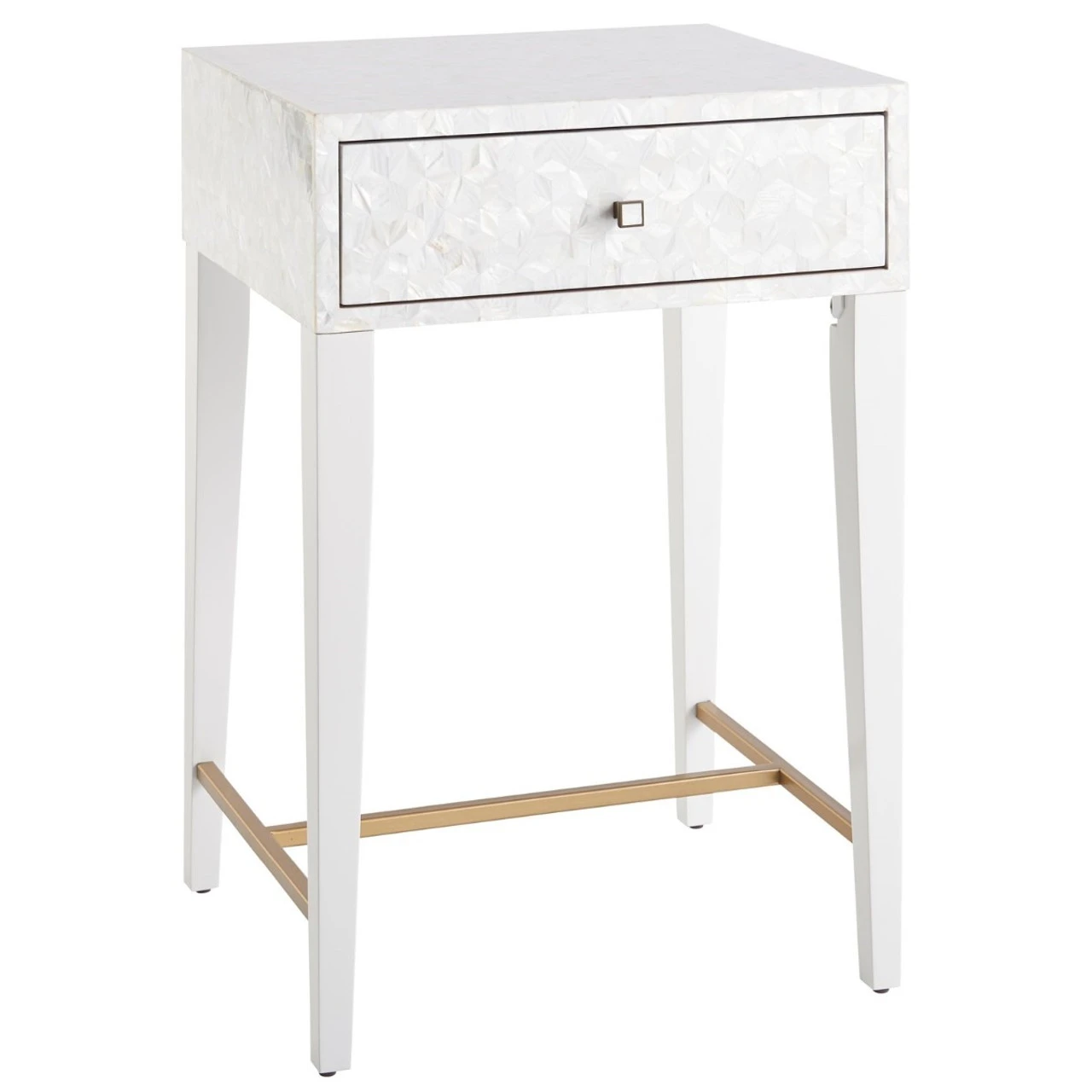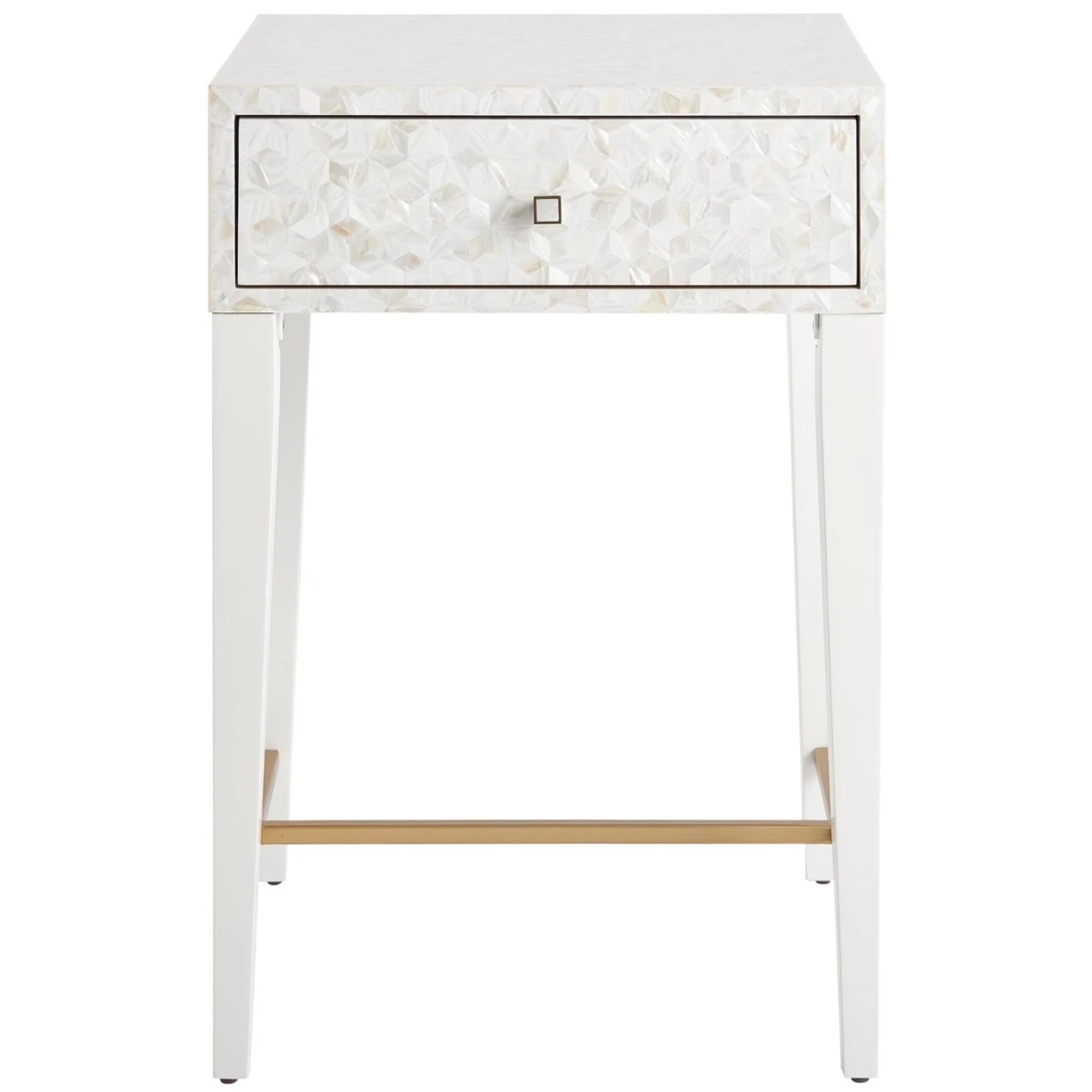 The Love Joy Bliss Bedside Table harmoniously exudes a perfect pairing of textures, with a mother of pearl overlay on the tabletop and drawer front, paired with a complementing white lacquer base. A sleek, linear design in soft gold metal adds additional interest and style at the base.