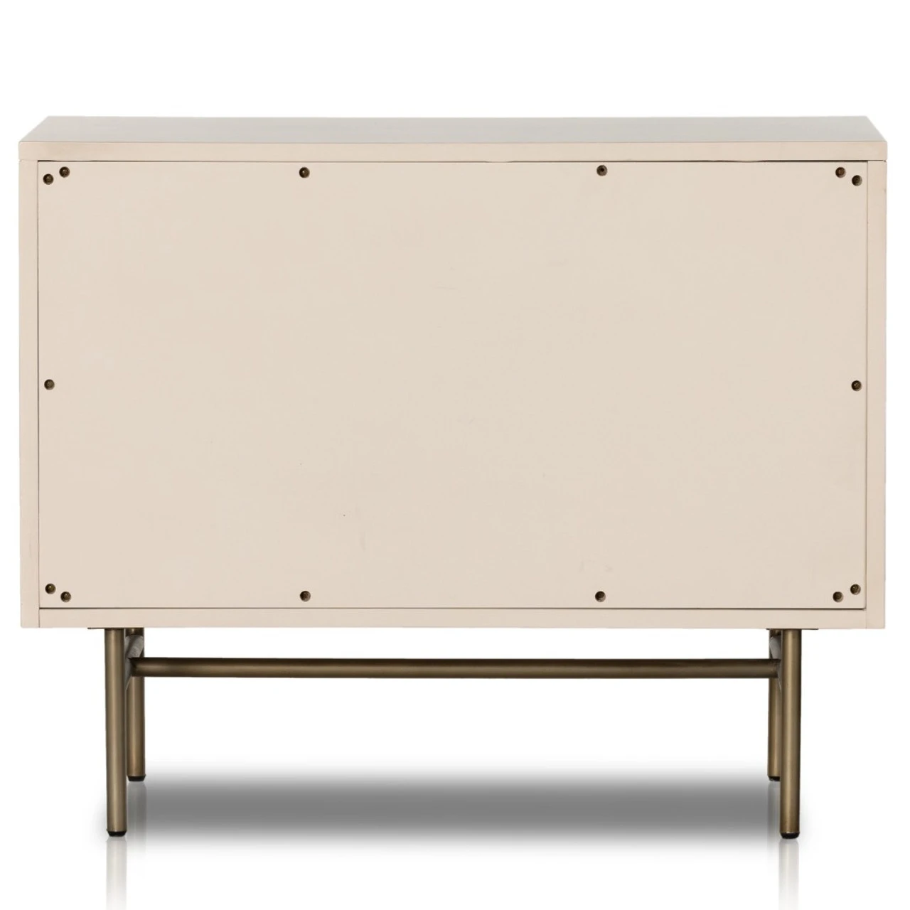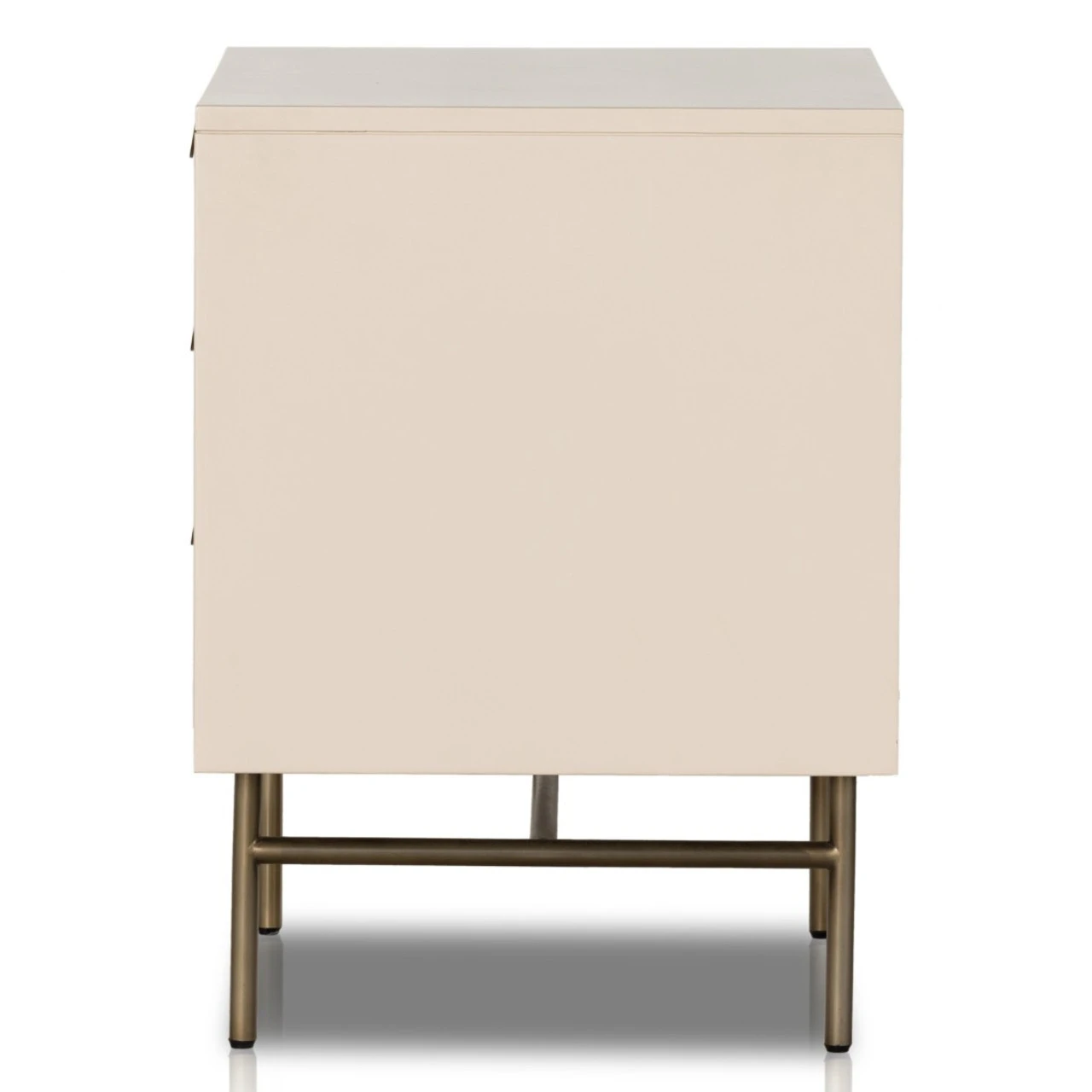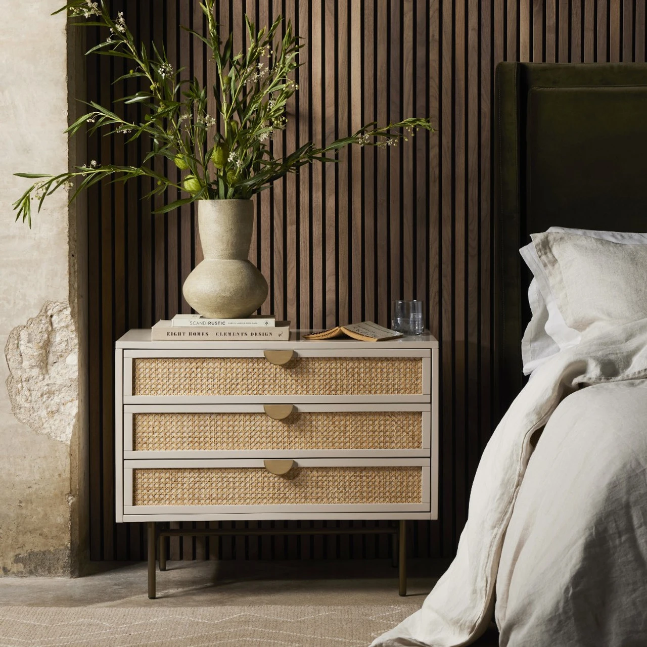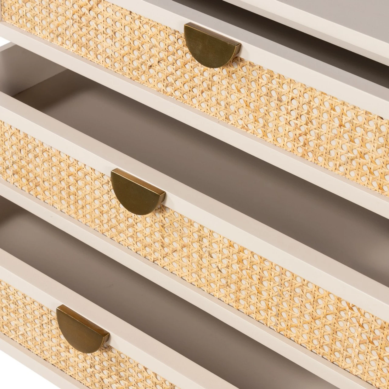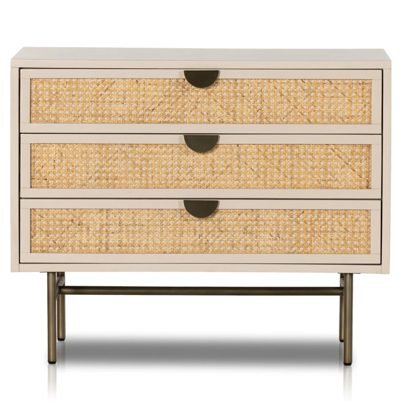 Bring a light, textural look to bedside storage. A lacquered three-drawer nightstand features woven cane panels and half-moon hardware finished in an aged brass.