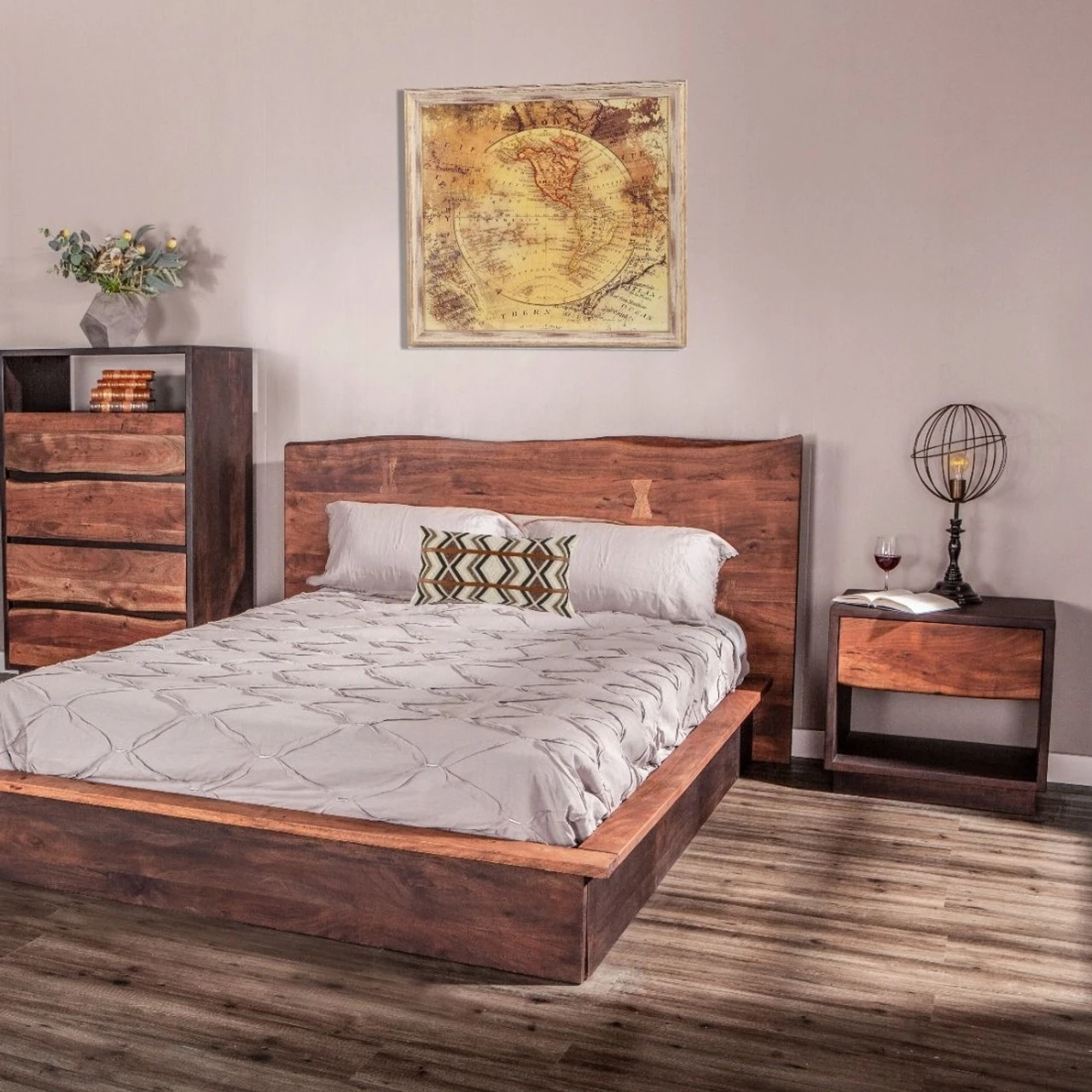 Made from solid and sustainable acacia wood, our Malibu Live-Edge 1 Drawer Nightstand is sanded and sealed by hand to preserve its raw edge and rustic wood grain. Featuring uneven edges on the drawer that contrast nicely with the clean, straight lines of the dark brown frame and base. With one open shelf area across the base and one drawer on the top, this bed side table provides plenty of room for housing all your night-time essentials Thanks to natural variations and the handcrafting process, each dresser’s beautifully-finished wood is one-of-a-kind.