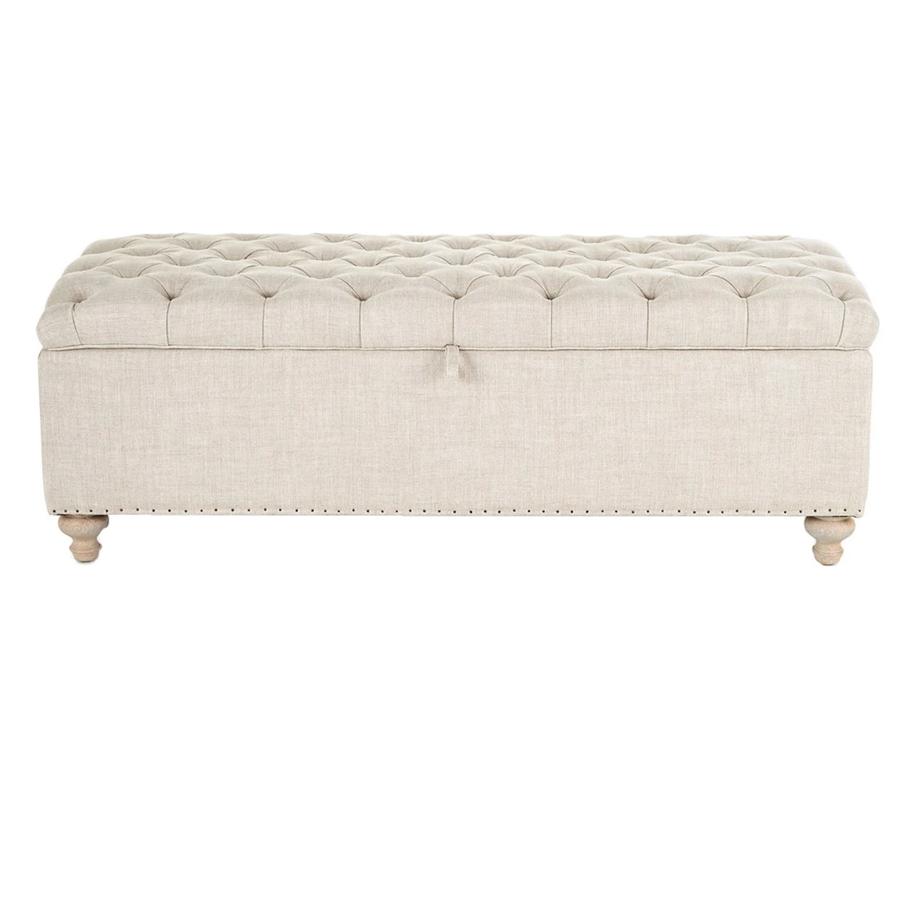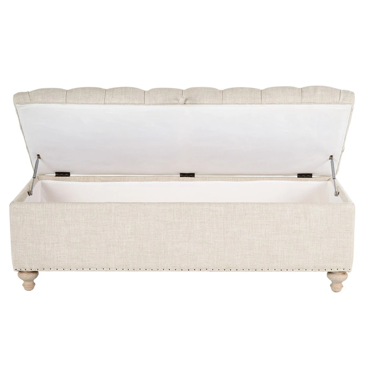 Inspired by the libraries of turn-of-the-century British aristocracy, timeless elegance and classic Chesterfield design are the hallmarks of the Marian Beige Belgian Linen Tufted Storage Bench. Crafted from luxurious beige Belgian linen with hand-hammered shoe nails and wood frame in Weathered Oak Finish. With its tufted lift top our Marian Tufted Storage Bench an all-in-one solution to the triple challenges of seating and storage. Perfect as a bed end bench.