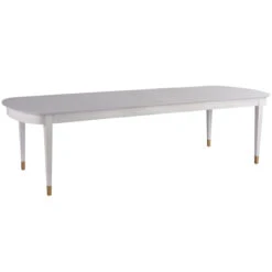 Add a warm and welcoming energy into your dining space with the Marion Dining Table, a gorgeous statement furnishing in an Alabaster finish that is embellished with soft gold metal caps on each leg. It comes with two 18-inch leaves that extend its width from 78 to 114 inches, making it well suited for family meals and festive gatherings alike.