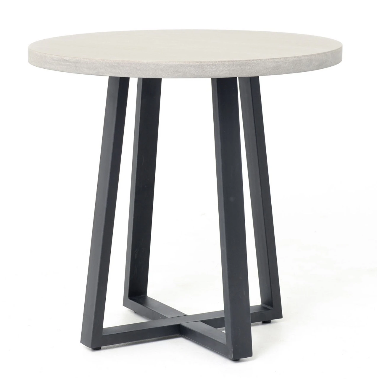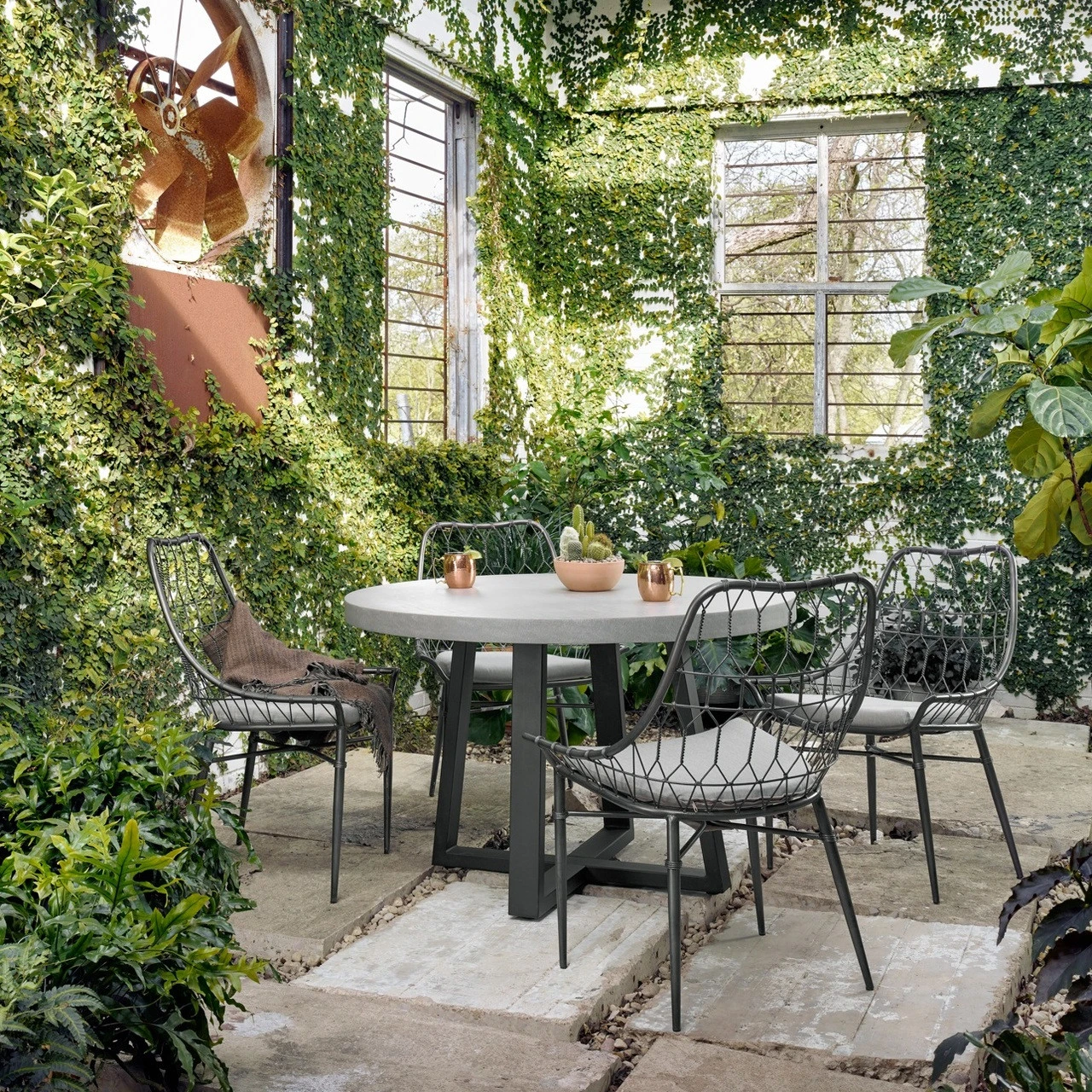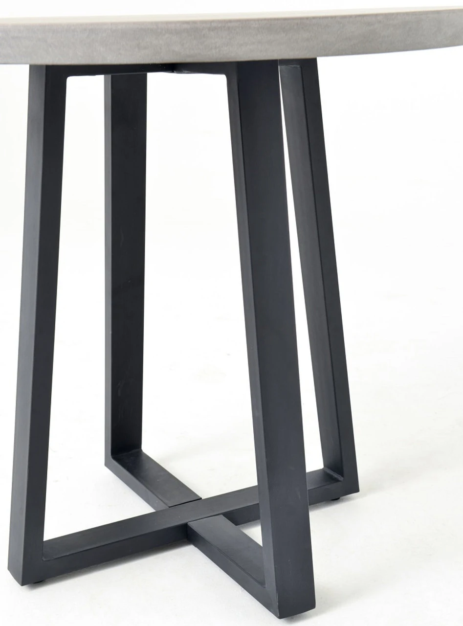 Inspired by Ancient Roman Masonry, construction, architecture, and design. A strikingly simple, poly-resin top derived from river sand is polished to a smooth sheen. The angled, matte black iron base adds architectural appeal to this round dining table. Great indoors or out — cover or store indoors during inclement weather and when not in use.
