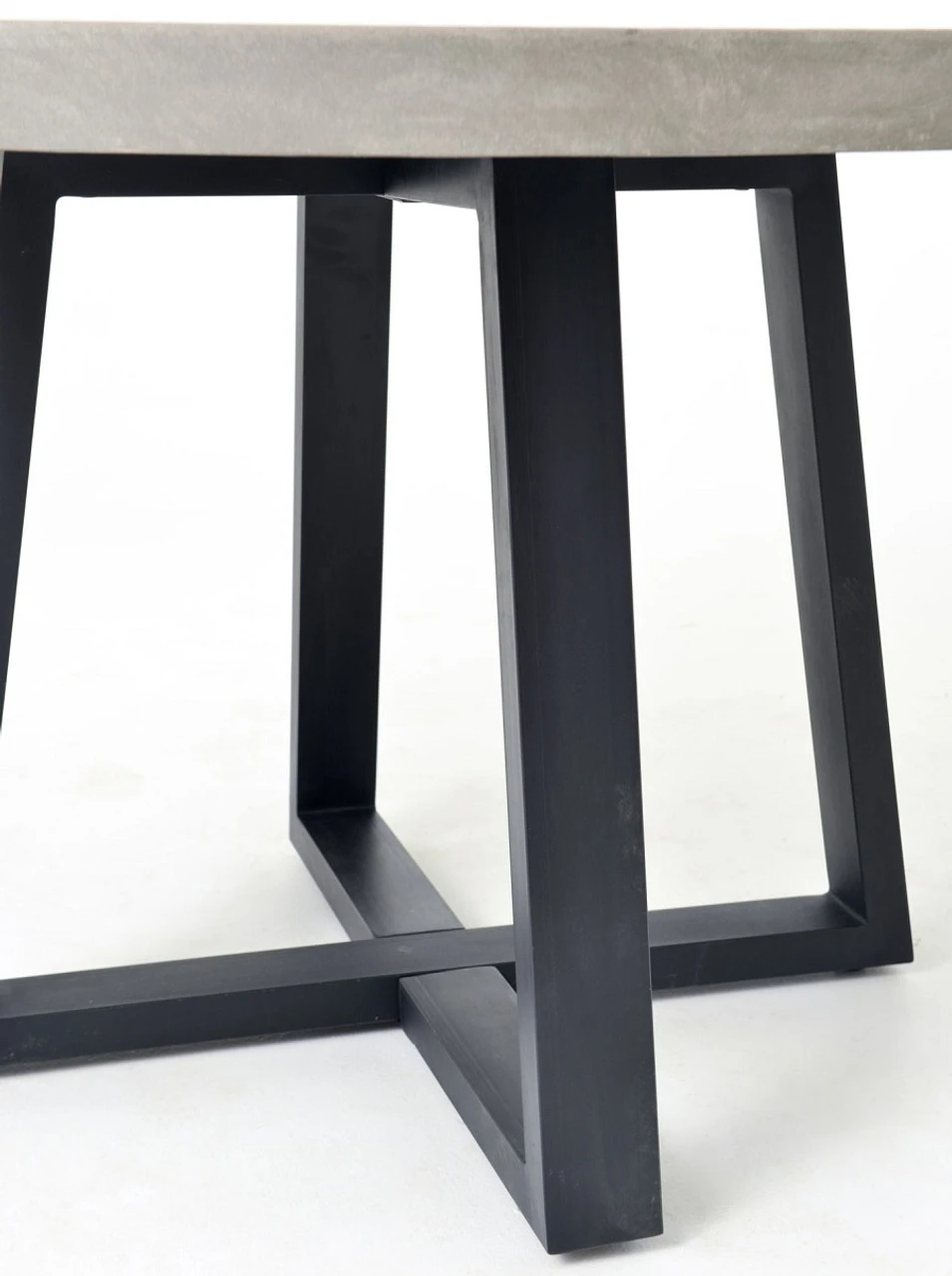 Inspired by Ancient Roman Masonry, construction, architecture, and design. Our new Masonry furniture collection makes concrete even more modern. Made from smooth layers of concrete over a honeycomb core and matte black iron base. Polystone offers the strength, character and depth of traditional concrete at an effortless weight. These dining room tables retain an industrial appeal while adding a sophisticated, urban edge to any space.The angled, matte black iron base adds architectural appeal to this round dining table. Great indoors or out — cover or store indoors during inclement weather and when not in use.