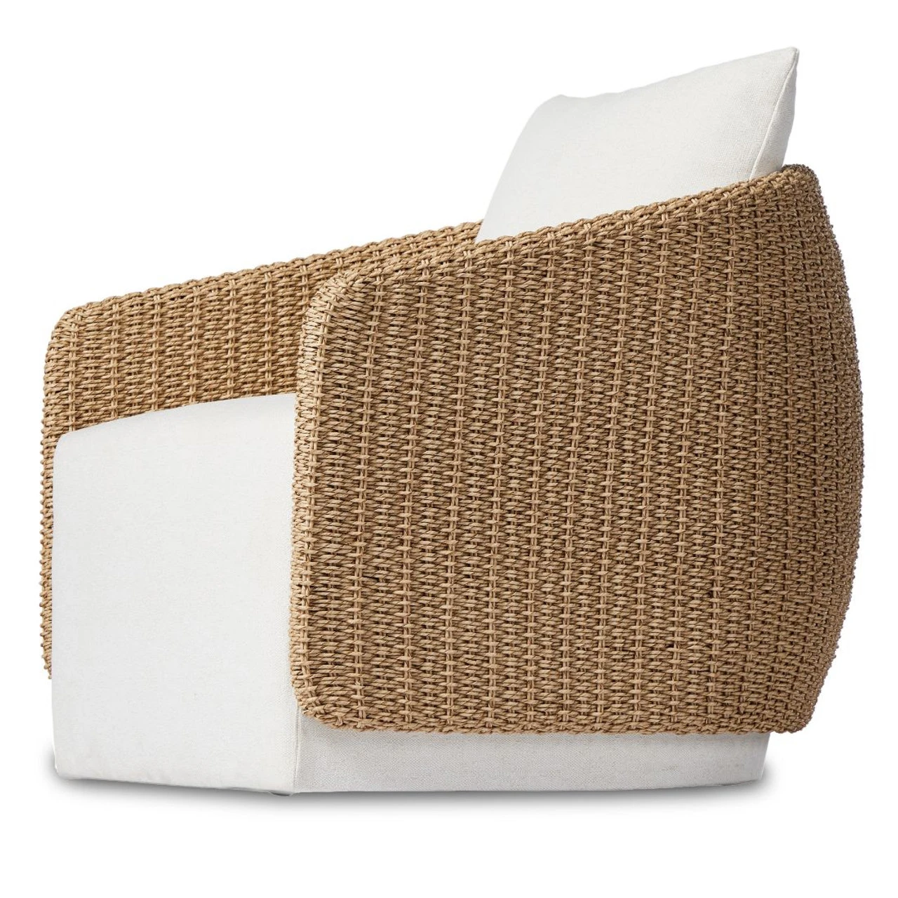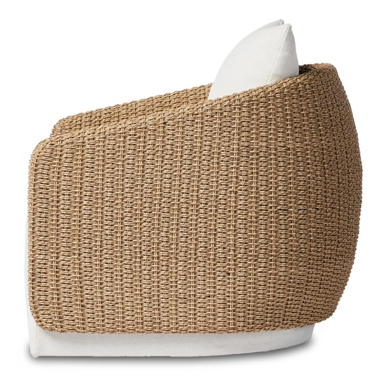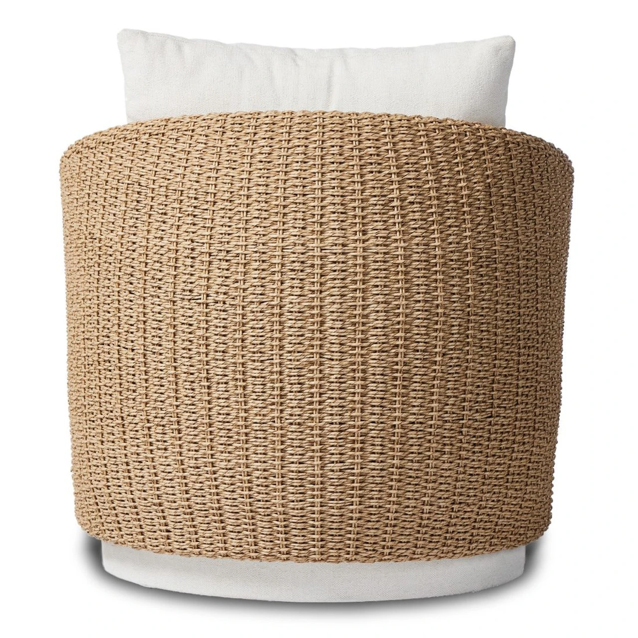Sustainably made with zero waste, luxurious Italian upholstery places a new and unique spin on indoor/outdoor seating, offering soft, durable fabric that’s highly resistant to sun, stains, mold and abrasion. Shell framing of faux hyacinth weaves for extra texture atop a 360-degree swivel. Cover or store indoors during inclement weather and when not in use.