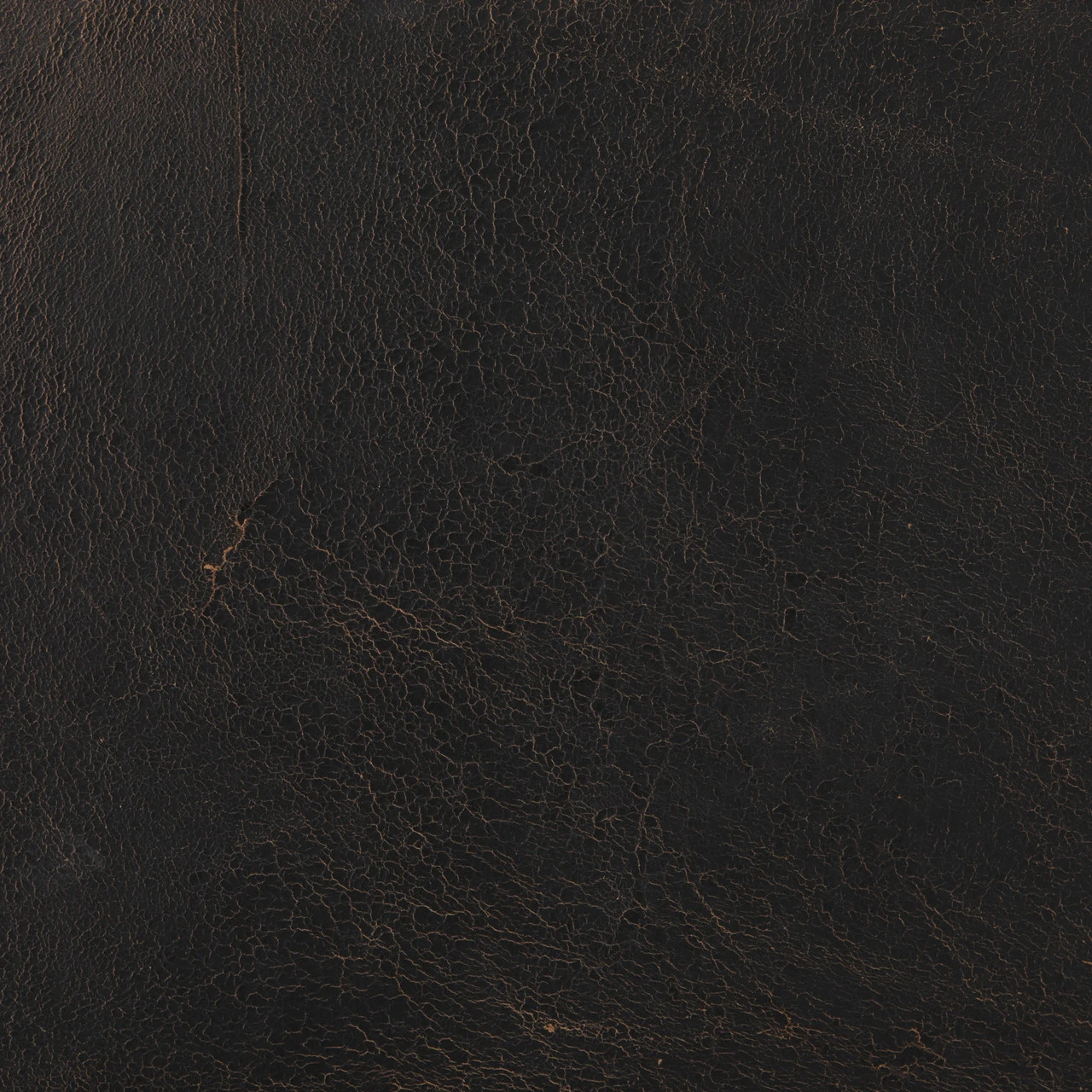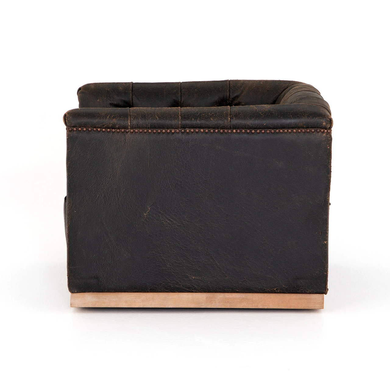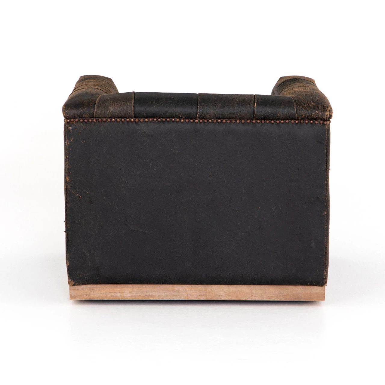 Clean straight lines mixed with traditional elements like deep tufting feel richly stylized yet casually inviting. This modern take on the classic library chair is upholstered in distressed black top-grain leather with deep tufting, nailhead trim and mounted on a smooth swivel base of weathered oak legs.