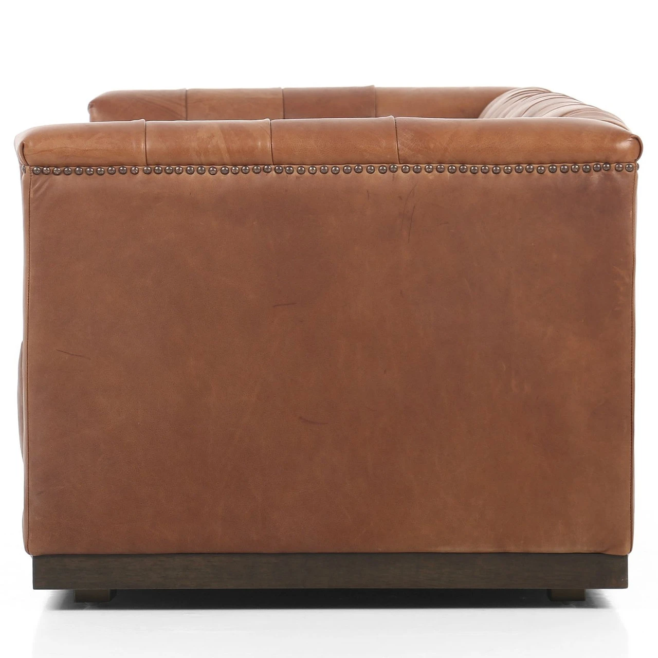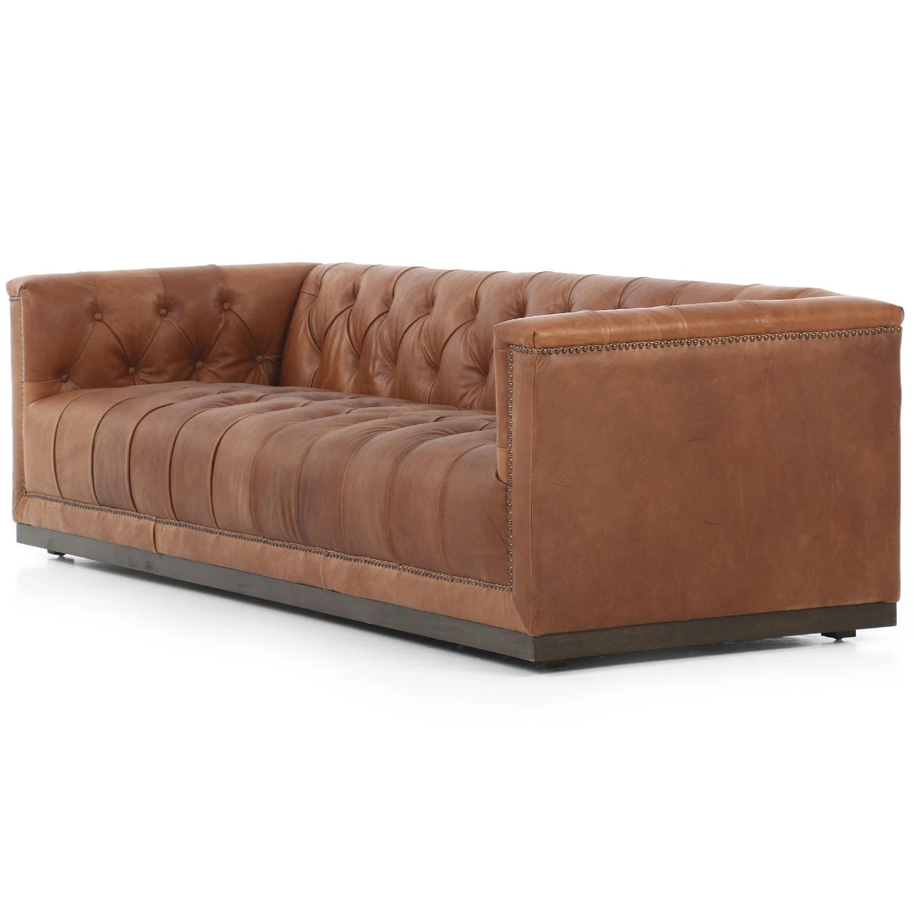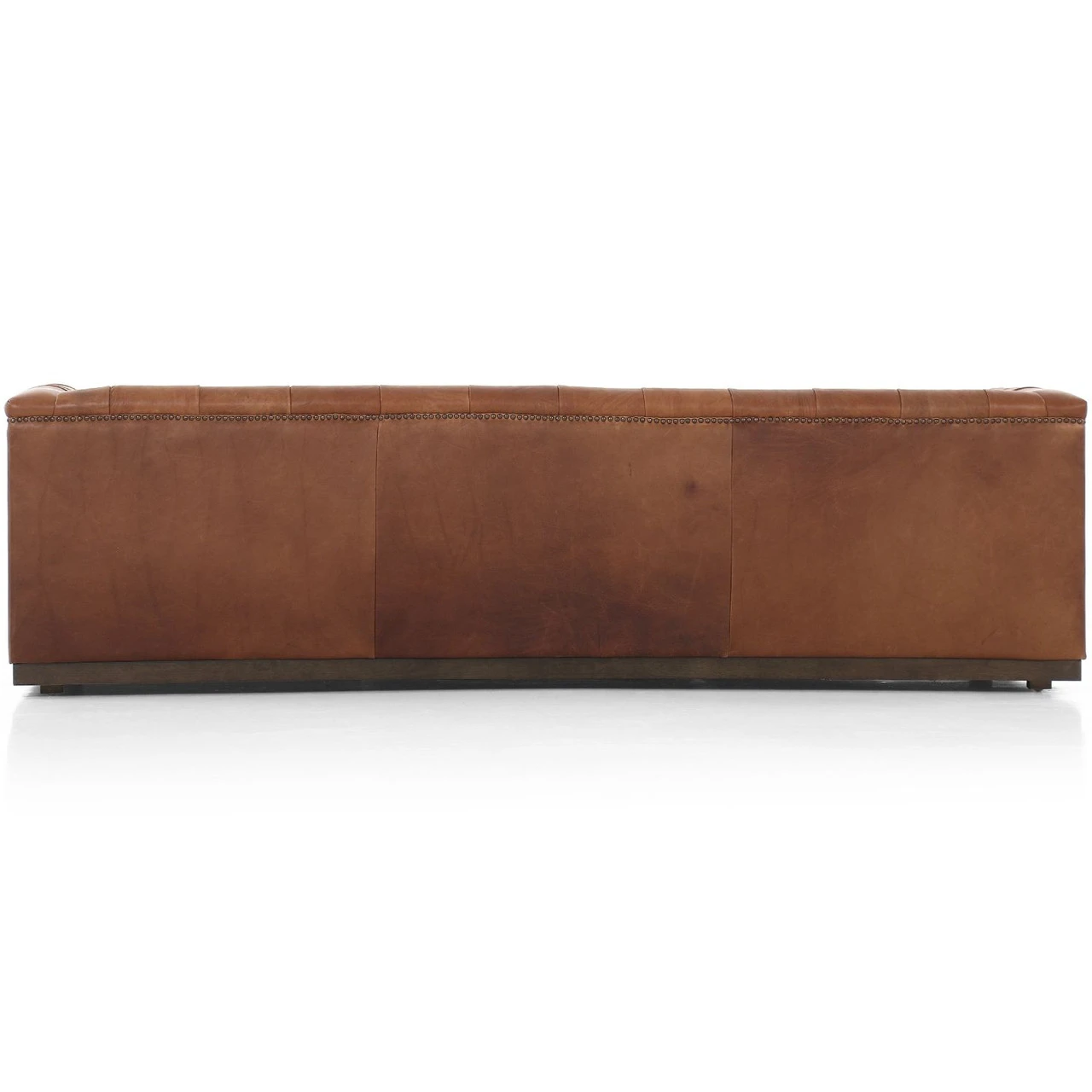 This creative take on the classic library sofa is covered in a slightly distressed top-grain leather in warm brown tones and is mounted on a solid wood base. Aged bronze nailheads add modernity. Finished with a specially designed formula that creates intentional cracking and distressing for a naturally aged look.