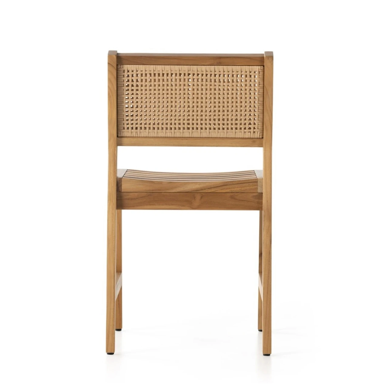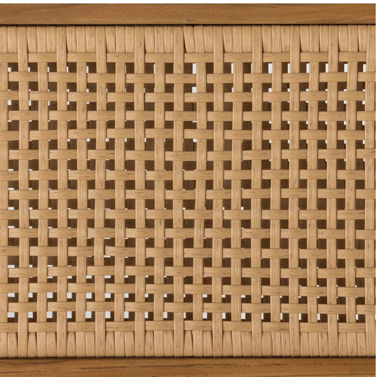 The cane trend moves outdoors. FSC-certified teak frame is detailed with a rattan-inspired woven panel on the sides for a breezy, crafted minimalism take on the outdoor dining table. Cover or store indoors during inclement weather and when not in use.