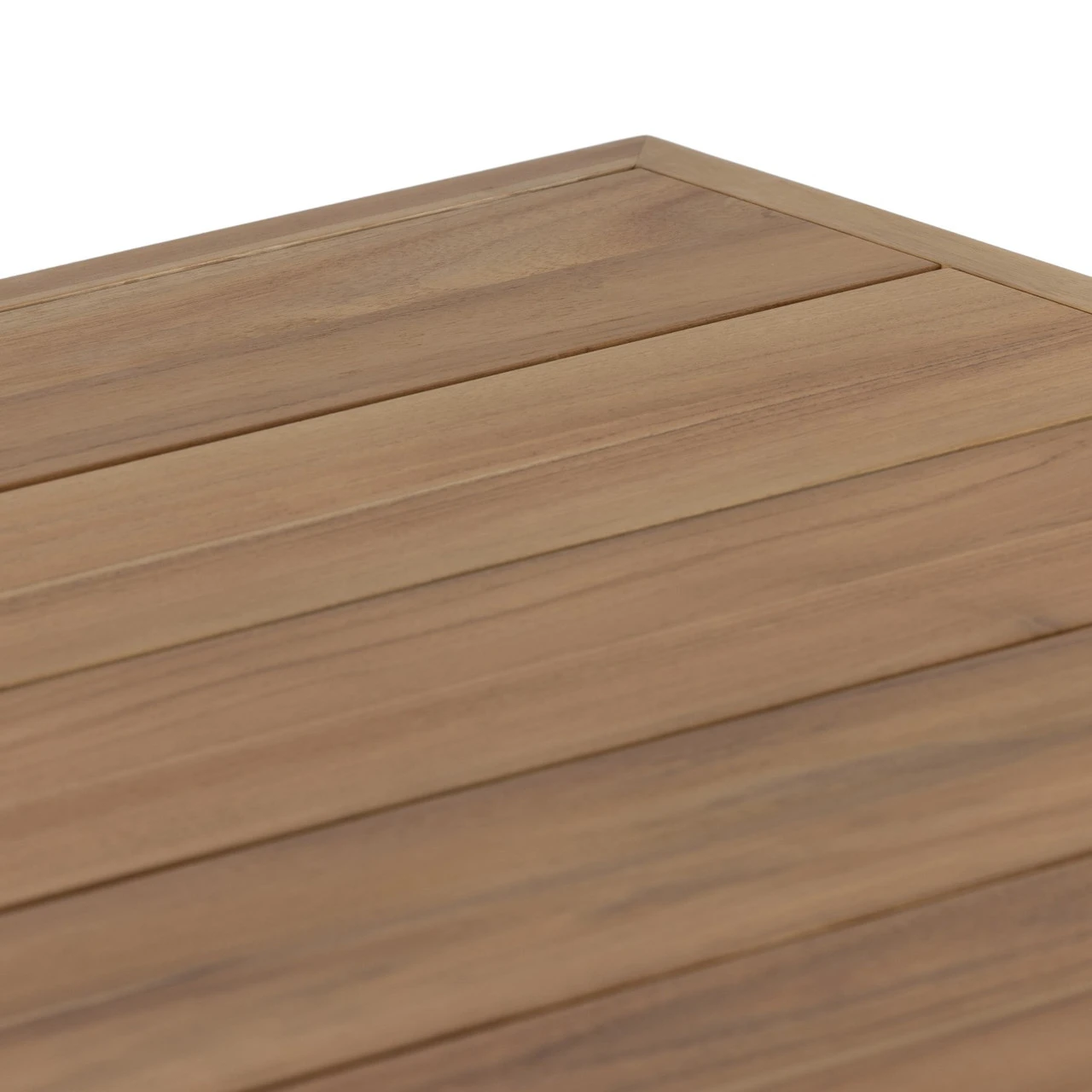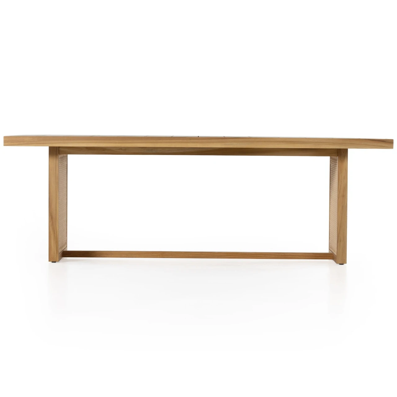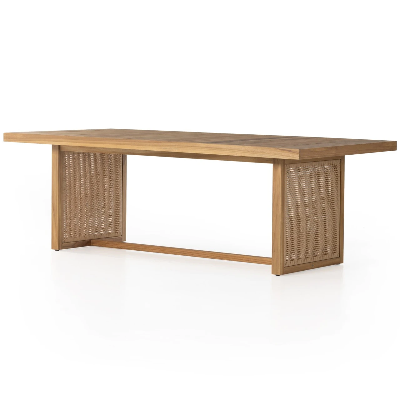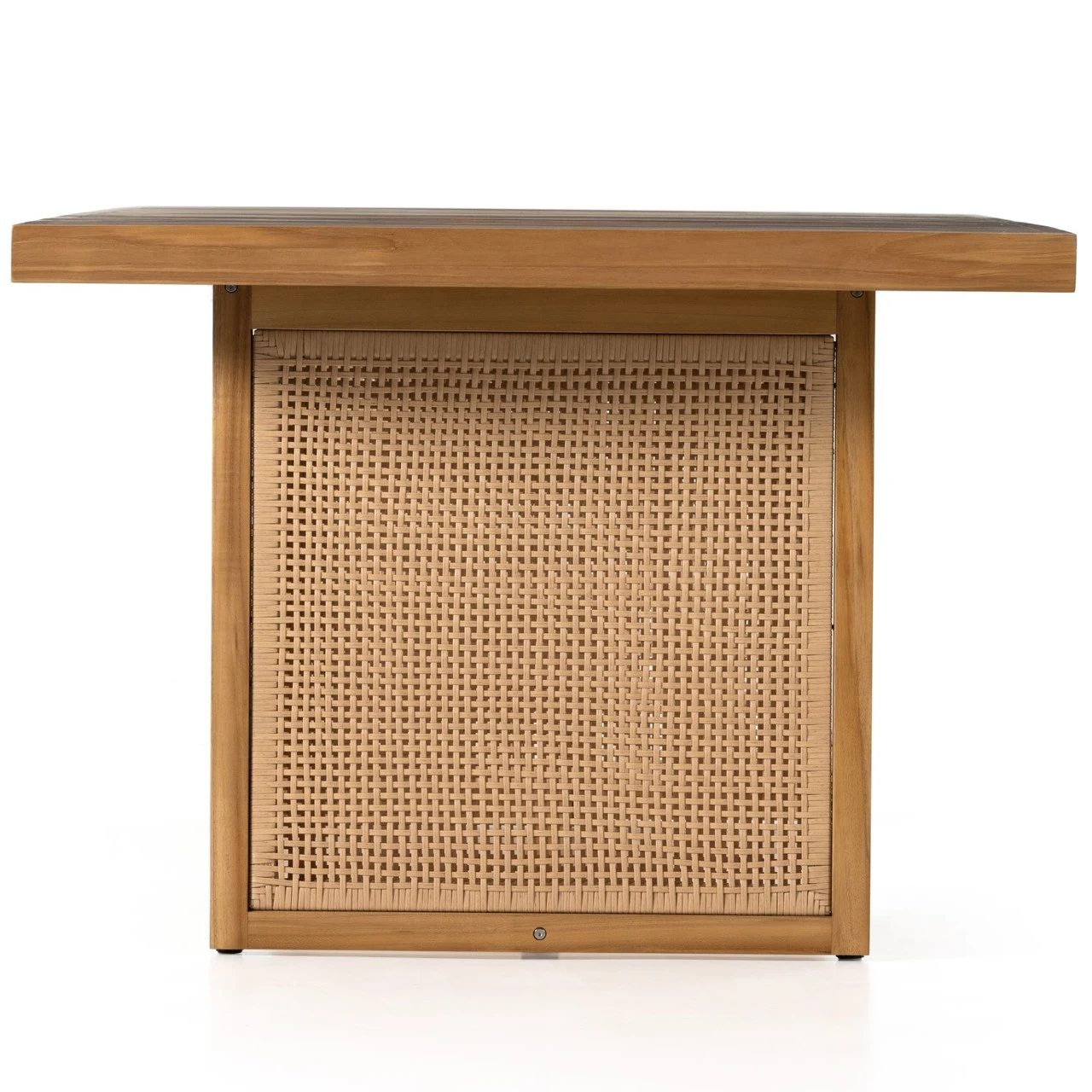 The cane trend moves outdoors. FSC-certified teak frame is detailed with a rattan-inspired woven panel on the sides for a breezy, crafted minimalism take on the outdoor dining table. Cover or store indoors during inclement weather and when not in use.
