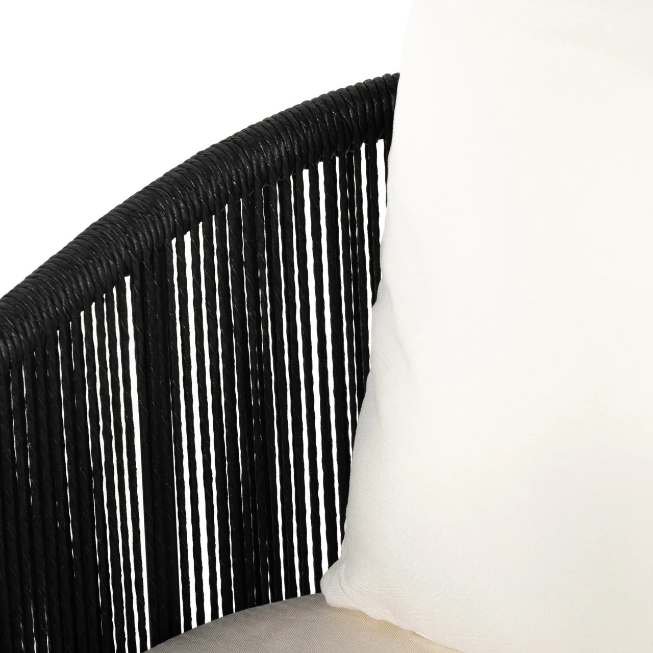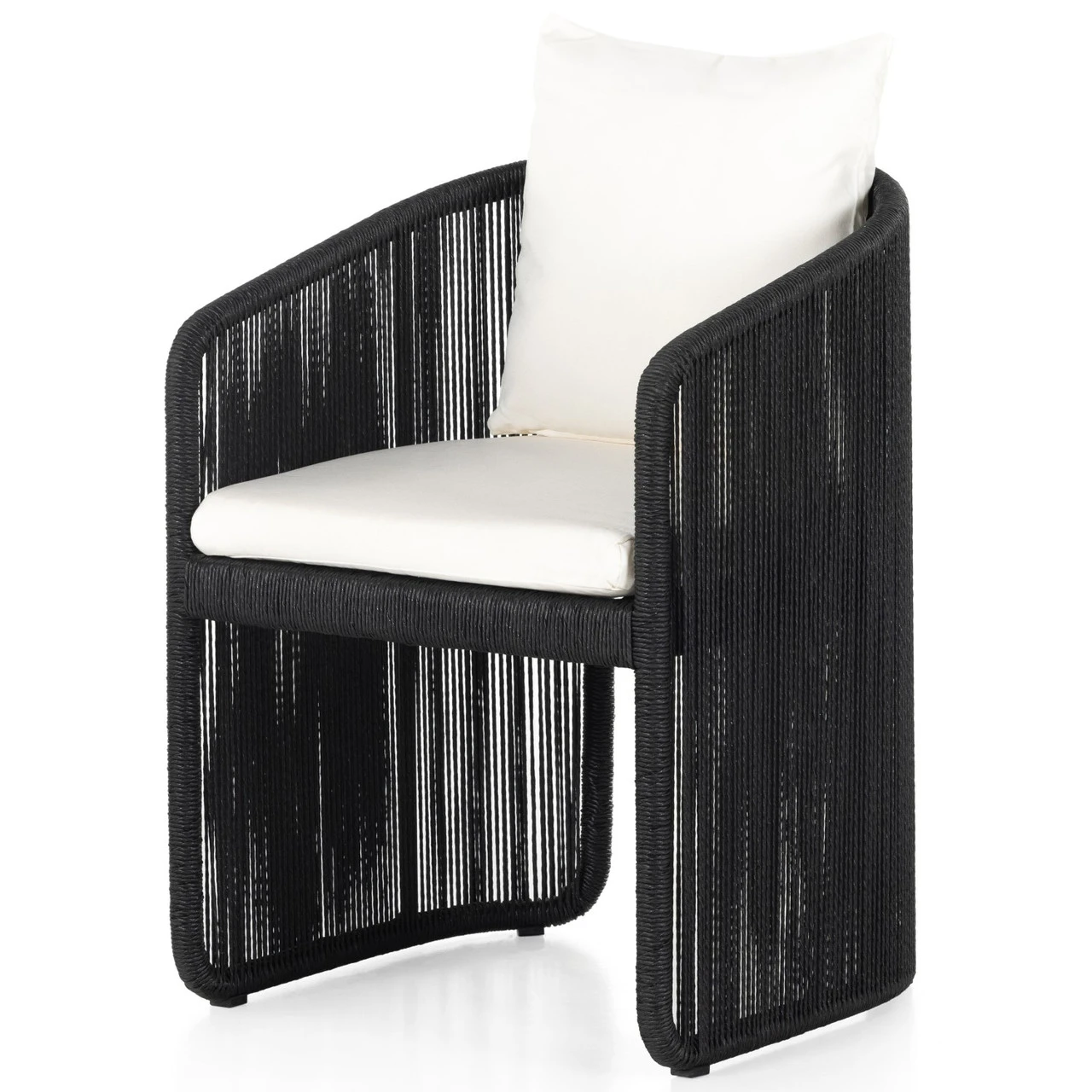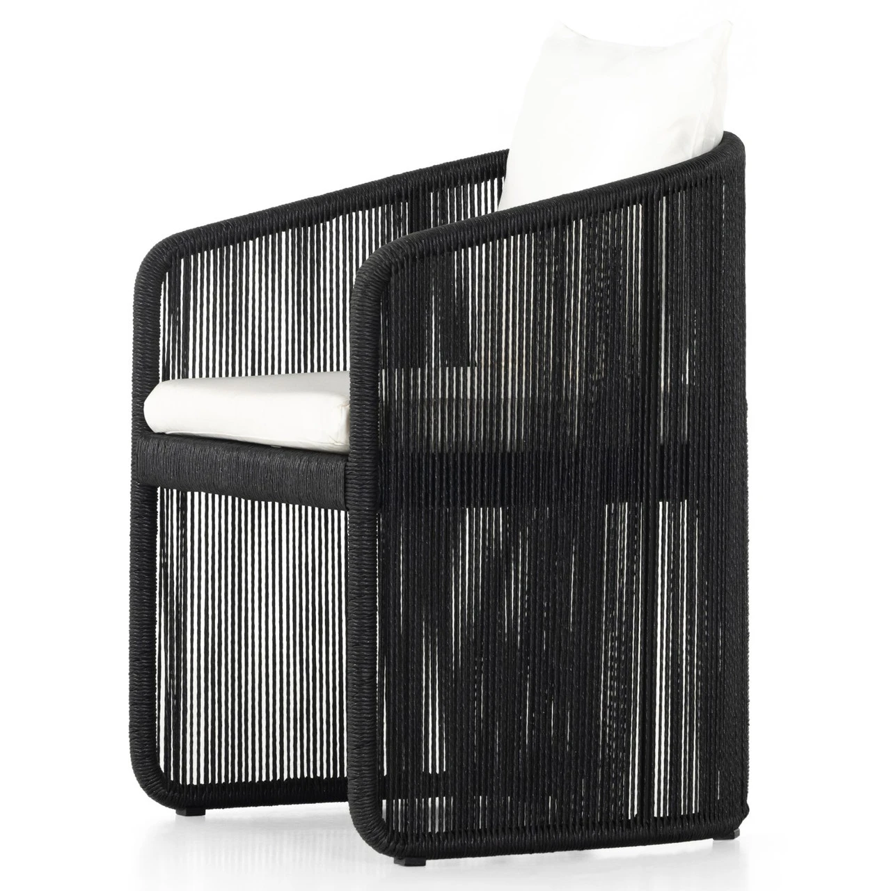 A modern take on barrel-shaped seating. A linear weave pattern adds lightness to the design and a beautiful open back with a dowel connection makes this outdoor dining chair stunning from every angle. Seat cushion and back pillow are covered in 100% Olefin, known for its UV-resistant, water-repellent, quick-drying abilities. Cover or store indoors during inclement weather and when not in use.