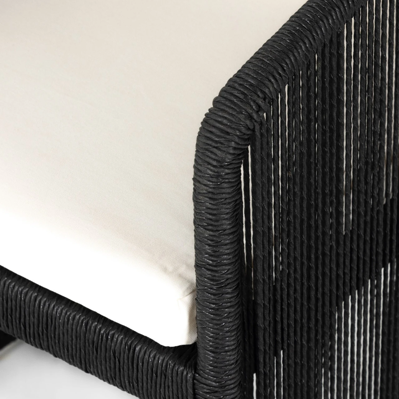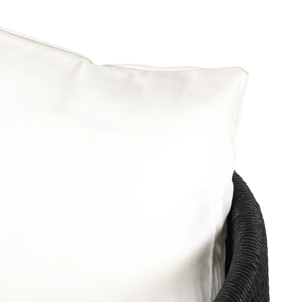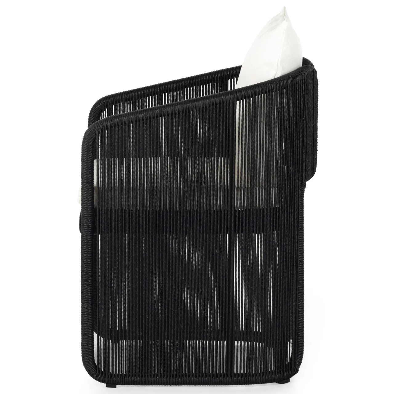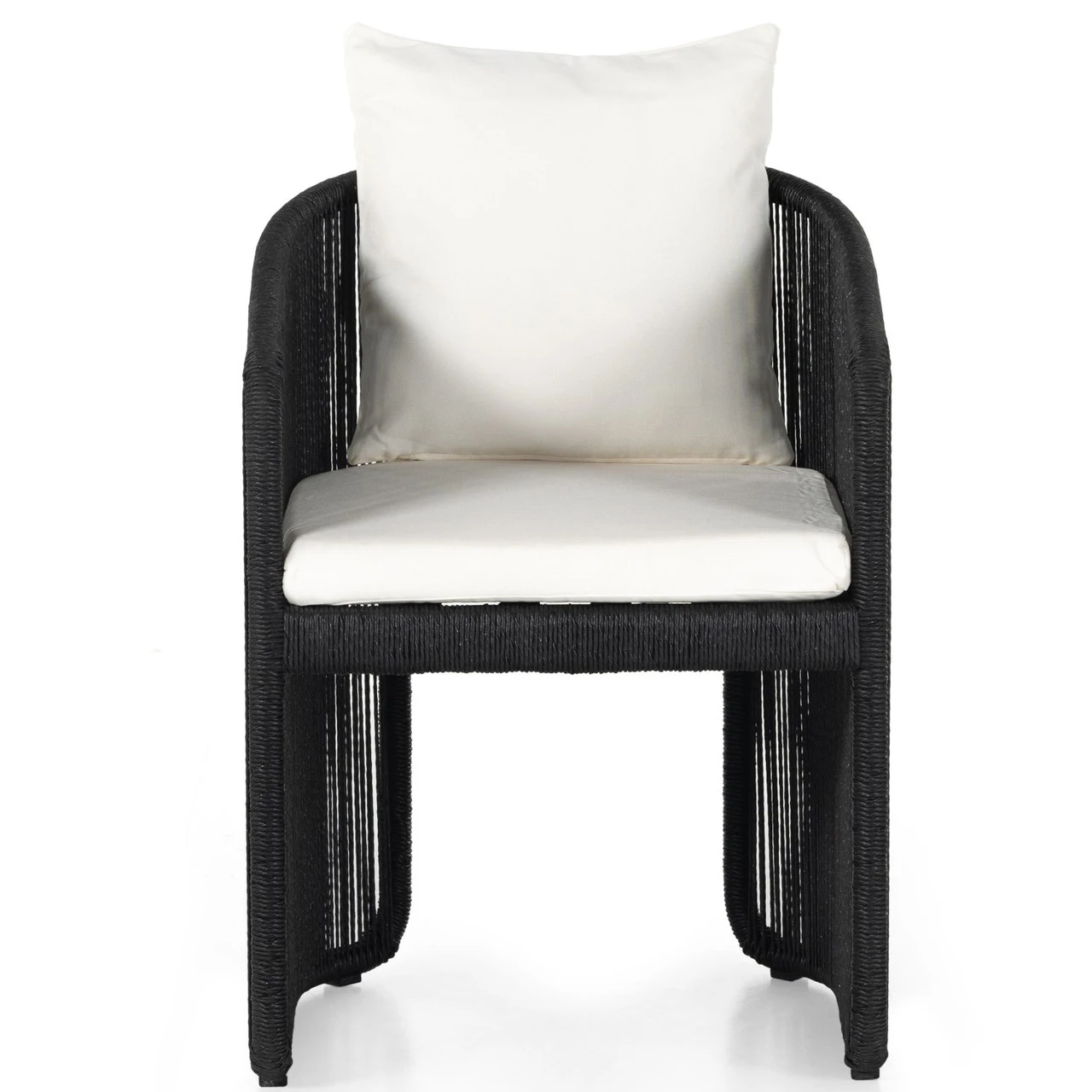 A modern take on barrel-shaped seating. A linear weave pattern adds lightness to the design and a beautiful open back with a dowel connection makes this outdoor dining chair stunning from every angle. Seat cushion and back pillow are covered in 100% Olefin, known for its UV-resistant, water-repellent, quick-drying abilities. Cover or store indoors during inclement weather and when not in use.