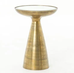 Unique geometric lines entertain the eye and give a room depth. The result is a space as beautiful to be in as it is to look at. Our Mod Brass Pedestal Side Table with Mirrored Top is a fashion forward style with a vintage-inspired personality. Each Round Side Table is made from recycled aluminum and mirror top with sand-casted brushed brass finish. Add any room just the right amount of pop and glam with our brass side table!