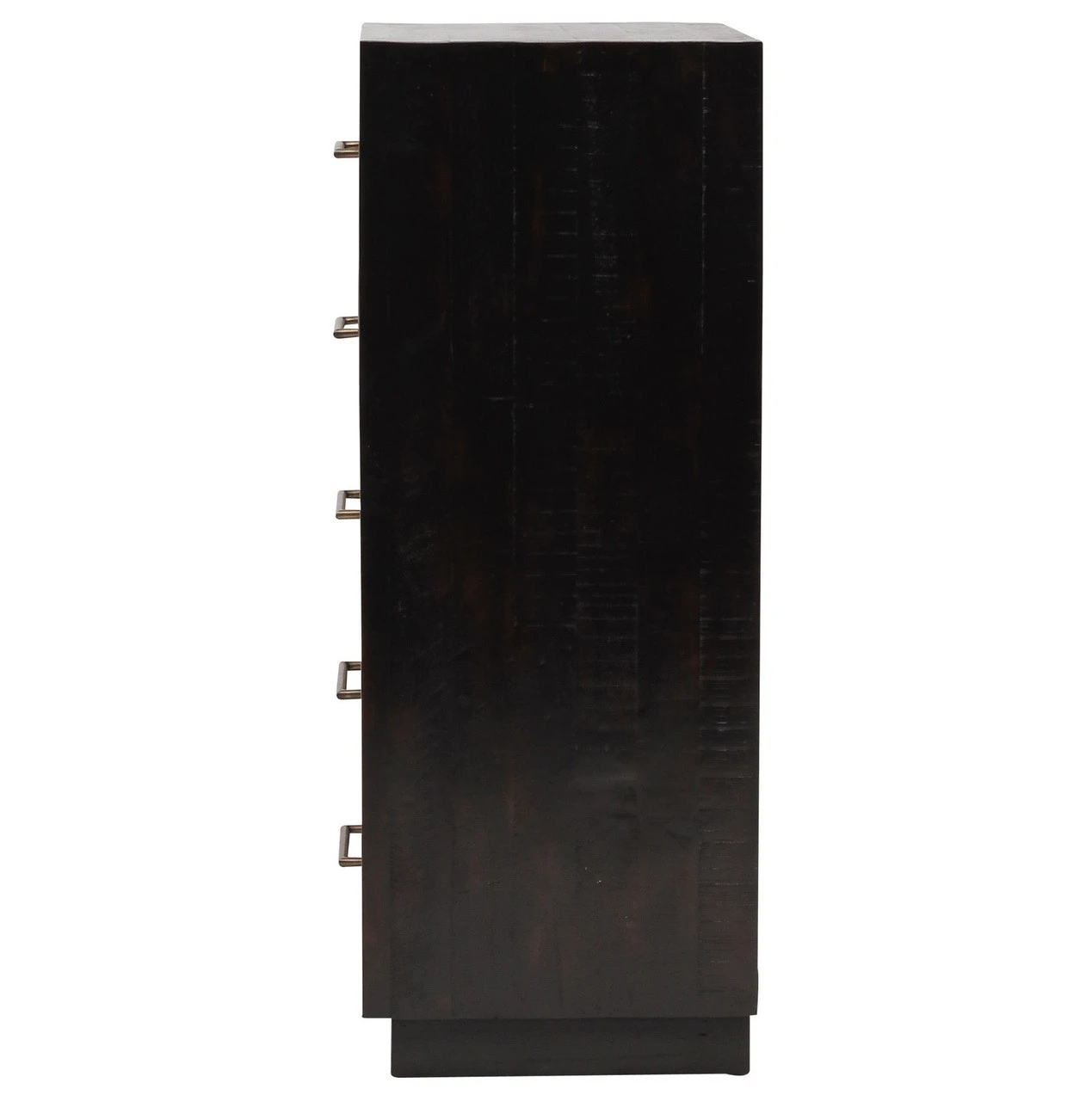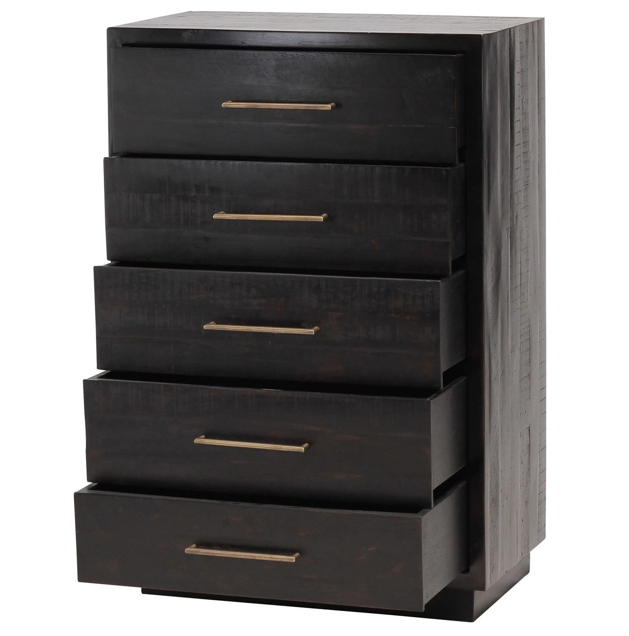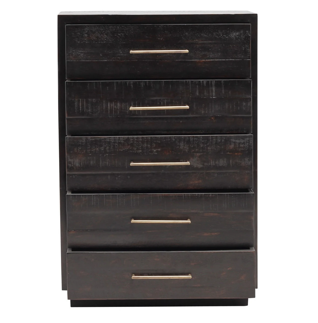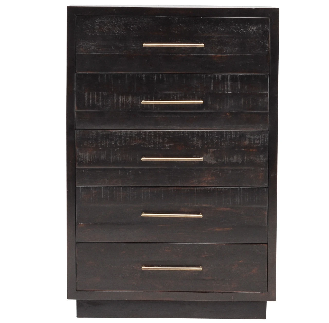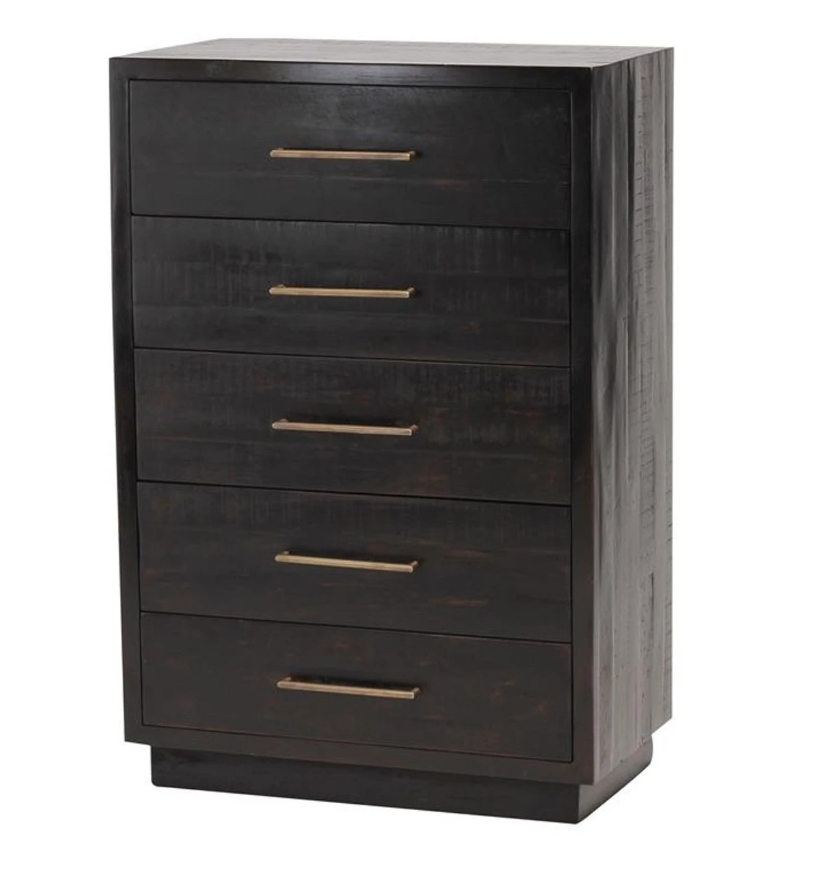 From contemporary to farmhouse to traditional grand gestures, all are re-imagined for the modern home. Inspired by mid-century modern shaping, angular lines are offset by distressed finishes and a burnished, rubbed-black finish. Hand finishing creates rich visual interest along with matte black and antiqued brass drawer pulls. This modern five drawer tall chest provides a fashionable yet functional look to any bedroom. Its deep drawers and burnished black finish makes this chest a truly sophisticated piece of furniture.