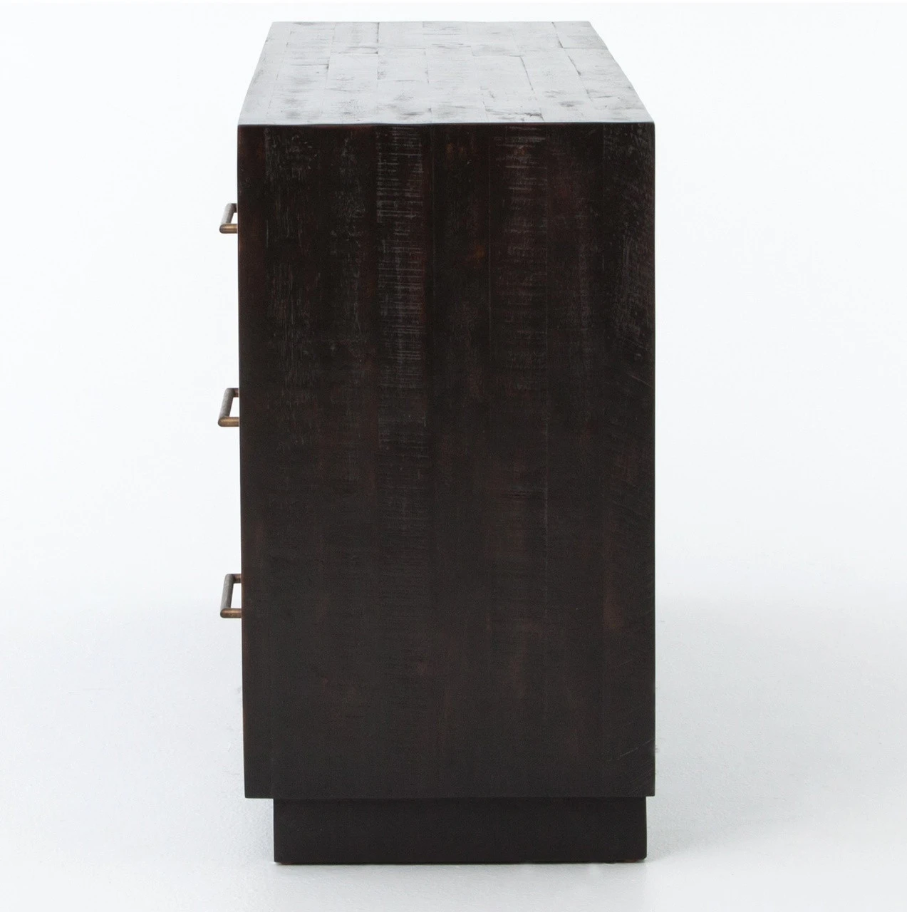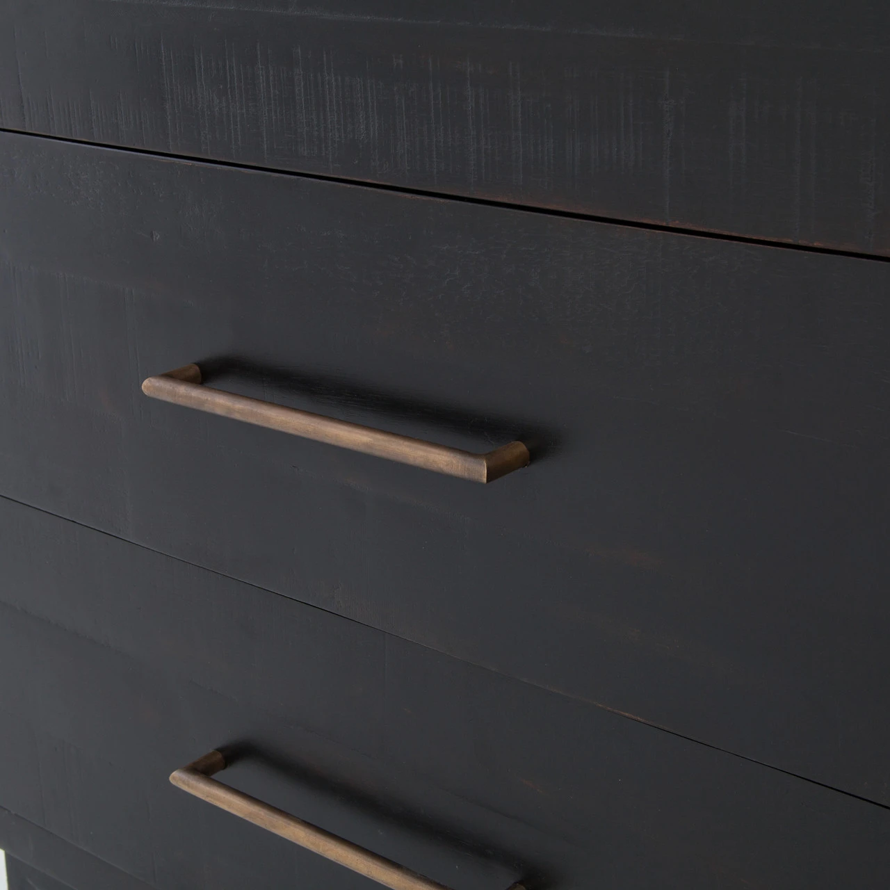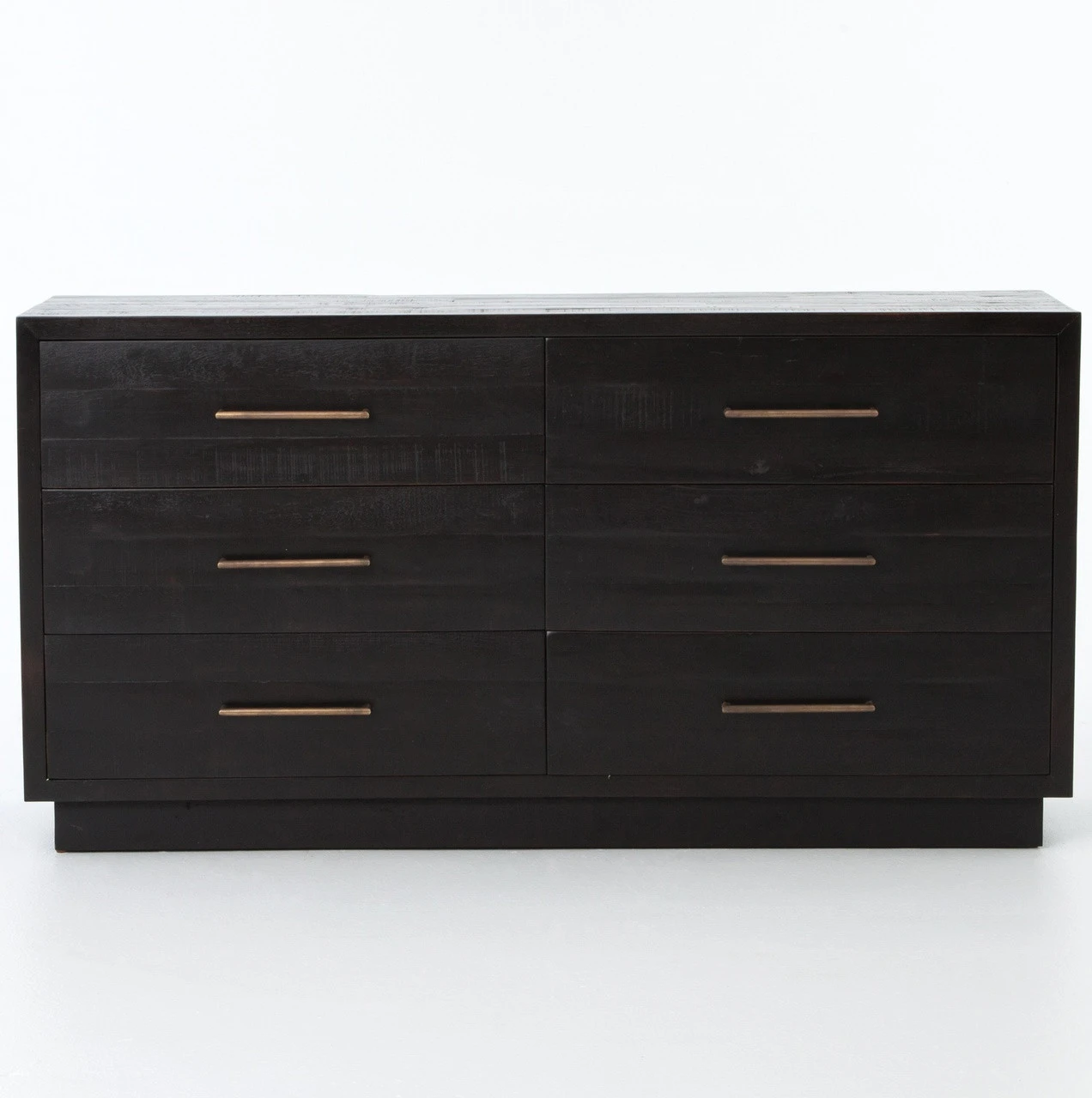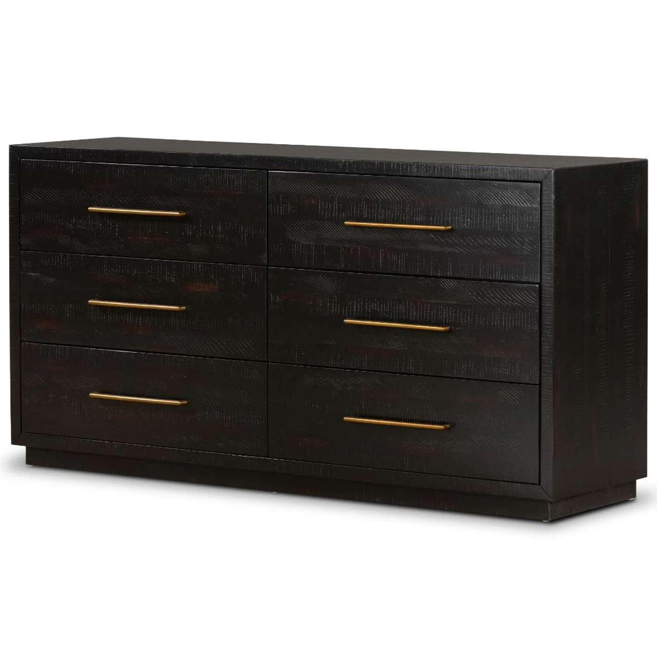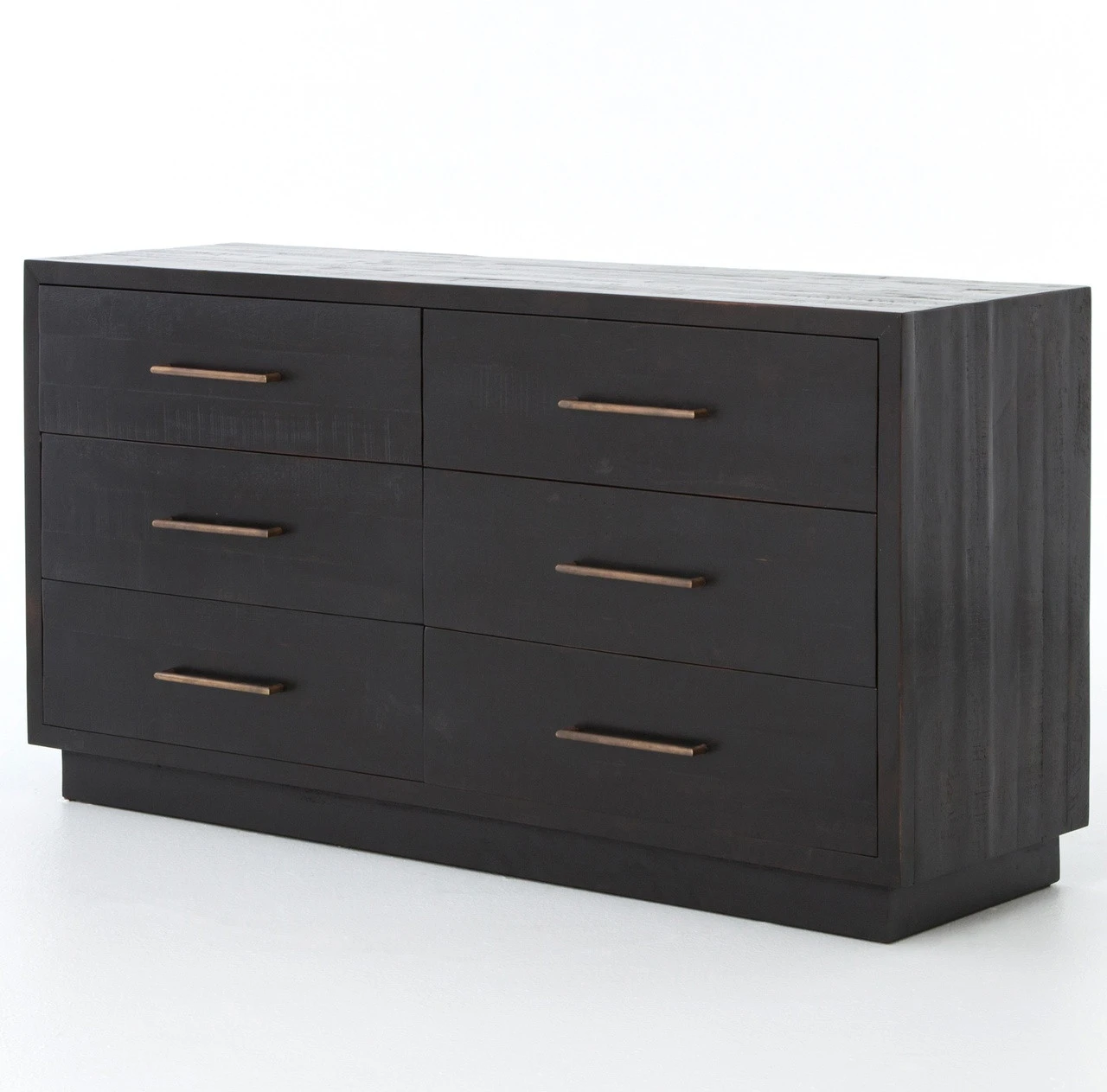From contemporary to farmhouse to traditional grand gestures, all are re-imagined for the modern home. Inspired by mid-century modern shaping, angular lines are offset by distressed finishes and a burnished, rubbed-black finish. Hand finishing creates rich visual interest along with matte black and antiqued brass drawer pulls. This modern six drawers double dresser provides a fashionable yet functional look to any bedroom. Its deep drawers and burnished black finish makes this wood dresser a truly sophisticated piece of furniture.