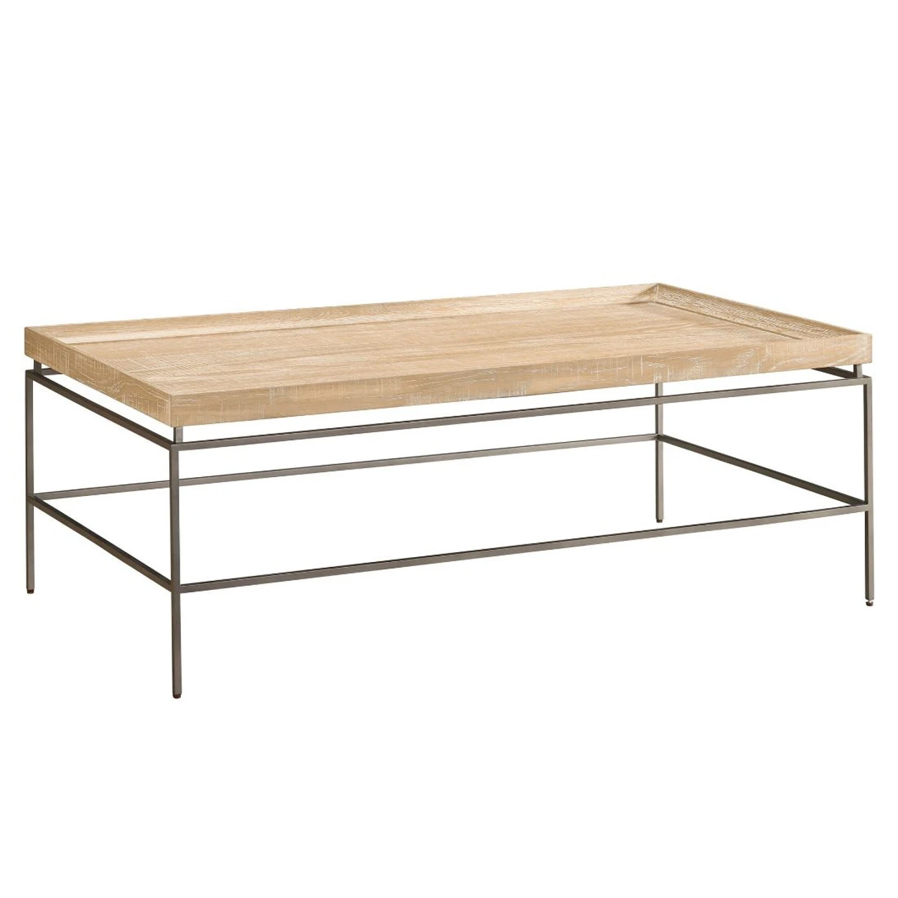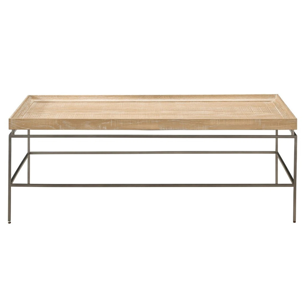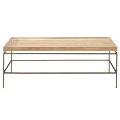 The pairing of a tabletop with a rustic natural oak finish and a sleek metal base defines the Preston Cocktail Table, a simple yet chic living room furnishing.