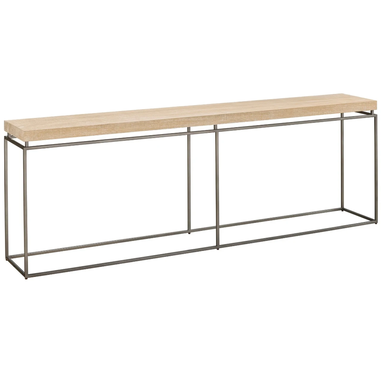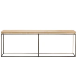 Boasting a chic and narrow silhouette, the Console Table showcases a perfect blend of modern farmhouse style with a rustic natural oak finish tabletop on a sleek metal base.