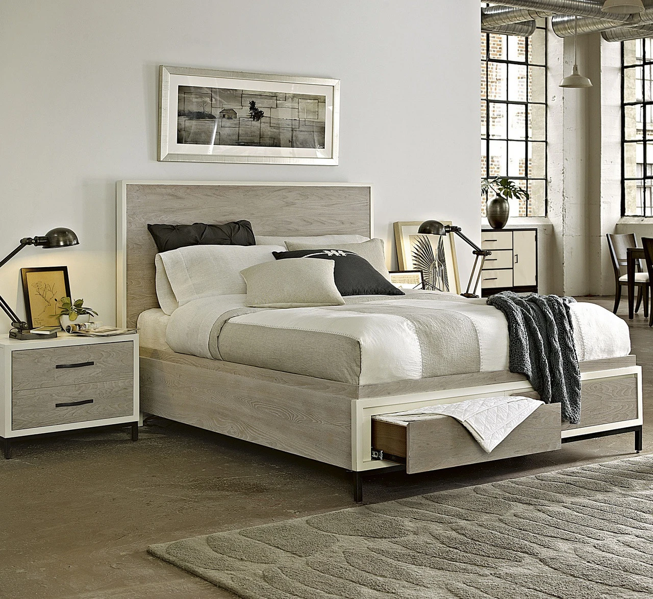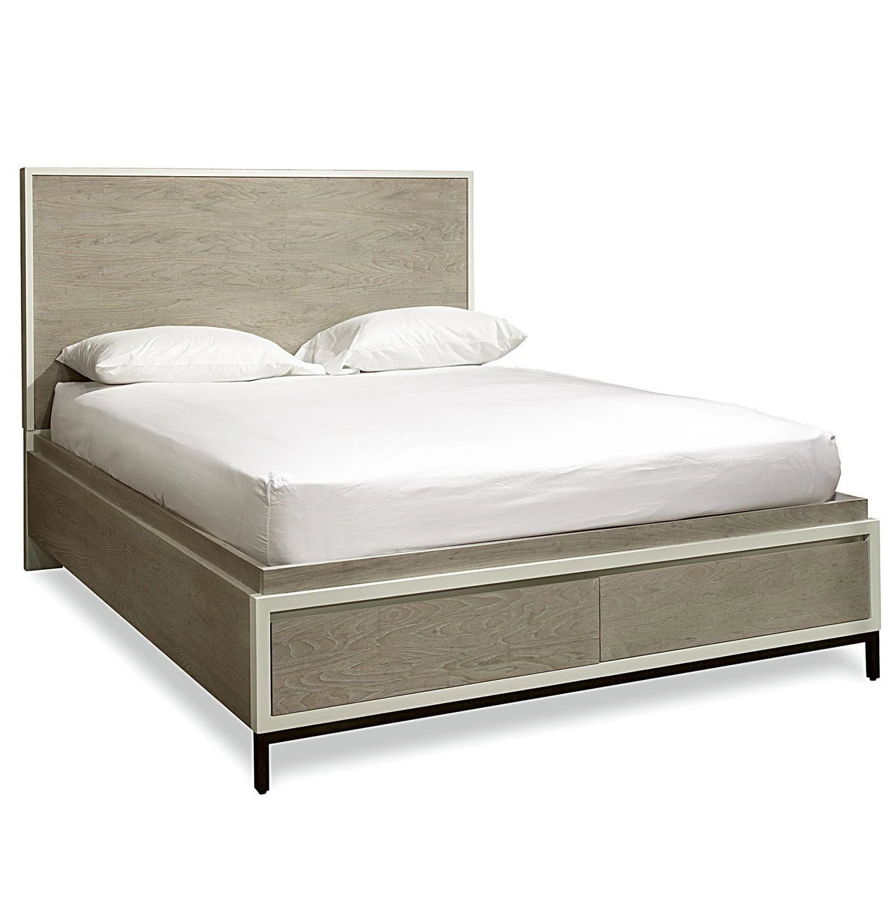 Featuring a clean, crisp, minimalist design, the Metropolitan Modern Gray Queen Storage Bed Frame offers plenty of storage space for linens and clothing with two large drawers concealed in the footboard. This modern platform storage bed is crafted of solid hardwoods, Birch and Elm Veneers. Featuring an eye-catching two tone Gray and Parchment finish. The queen size storage bed stands on a sleek, black metal legs creating a lofty feel for the modern bedroom.