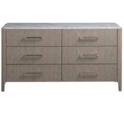 Add depth and intrigue to spaces with the Soren Dresser, a neutral-hued storage piece featuring a smooth stone top and six spacious drawers accented by sleek bar hardware.
