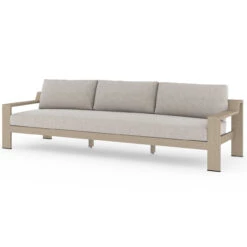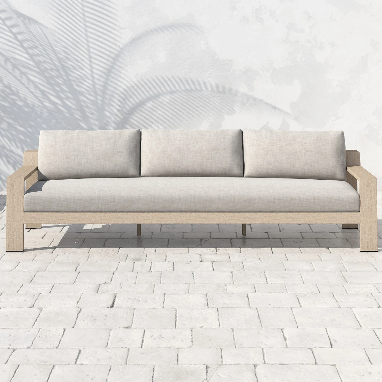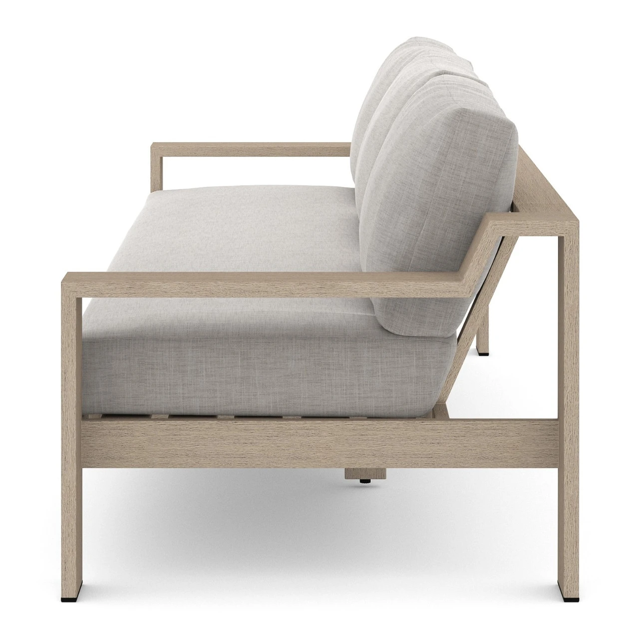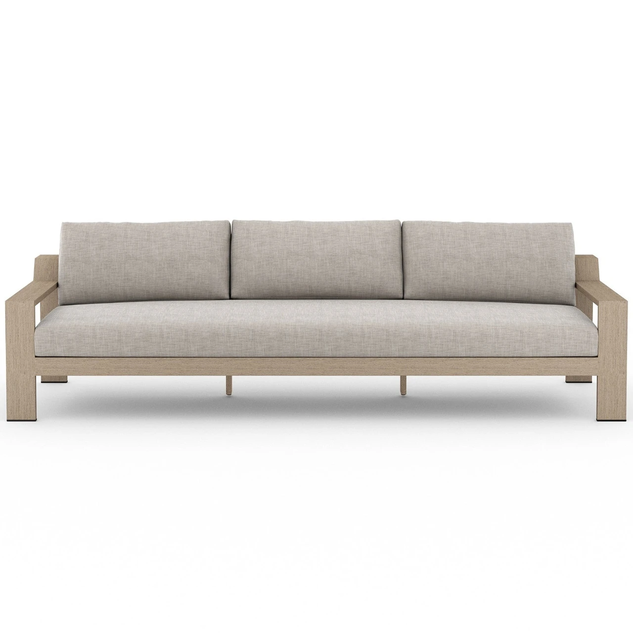 Modern materials ready a stylish silhouette for the outdoors. Washed brown teak forms a clean two-seat frame for UV-resistant and water-repellent Sunproof fabric in stone grey. Architectural arms andย midcentury modern design add intrigue to our modern wooden outdoor couch.ย Ourย Monterey Natural Teak Outdoor 2 Seater Sofa isย built to last andย makes a stunning yet comfortable addition to anyย luxurious loungingย outdoor space.