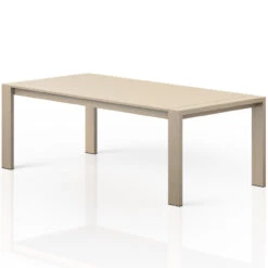 Architectural lines bring modern minimalism to this outdoor suite. Solid FSC-certified teak forms the wide, clean frame of this stylish outdoor dining table. Wirebrushed and fully sealed in a finish designed to mimic the natural aging process of teak. Cover or store indoors during inclement weather and when not in use.