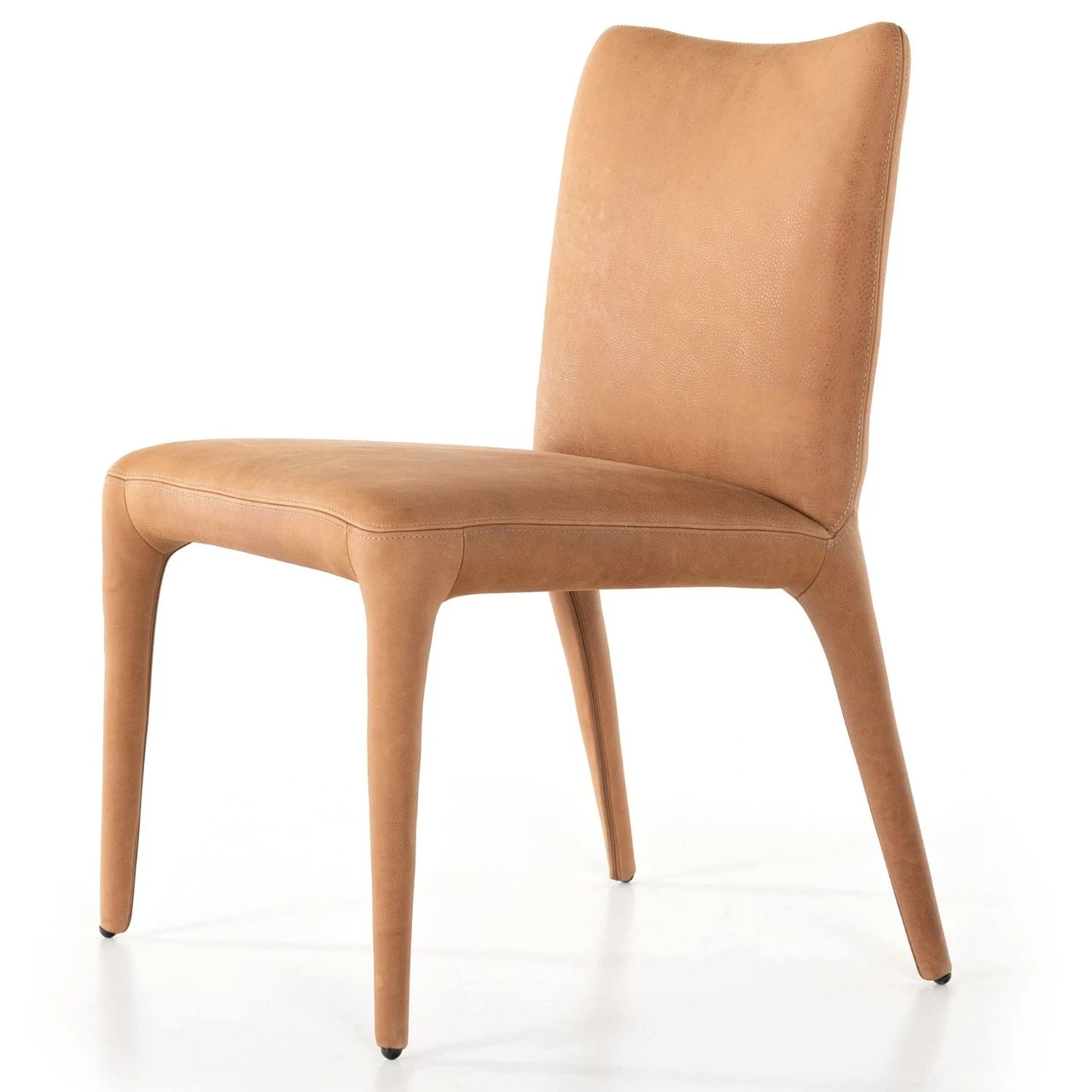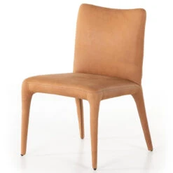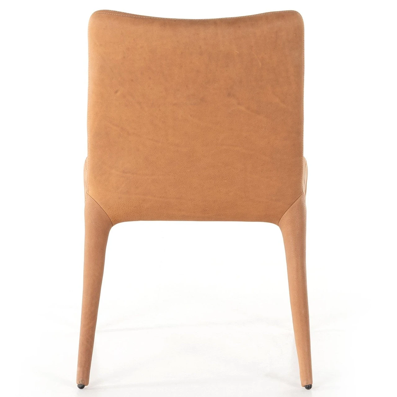Shapely and sleek, with a scooped back and tapered legs, camel top-grain leather brings total sophistication to the dining table.