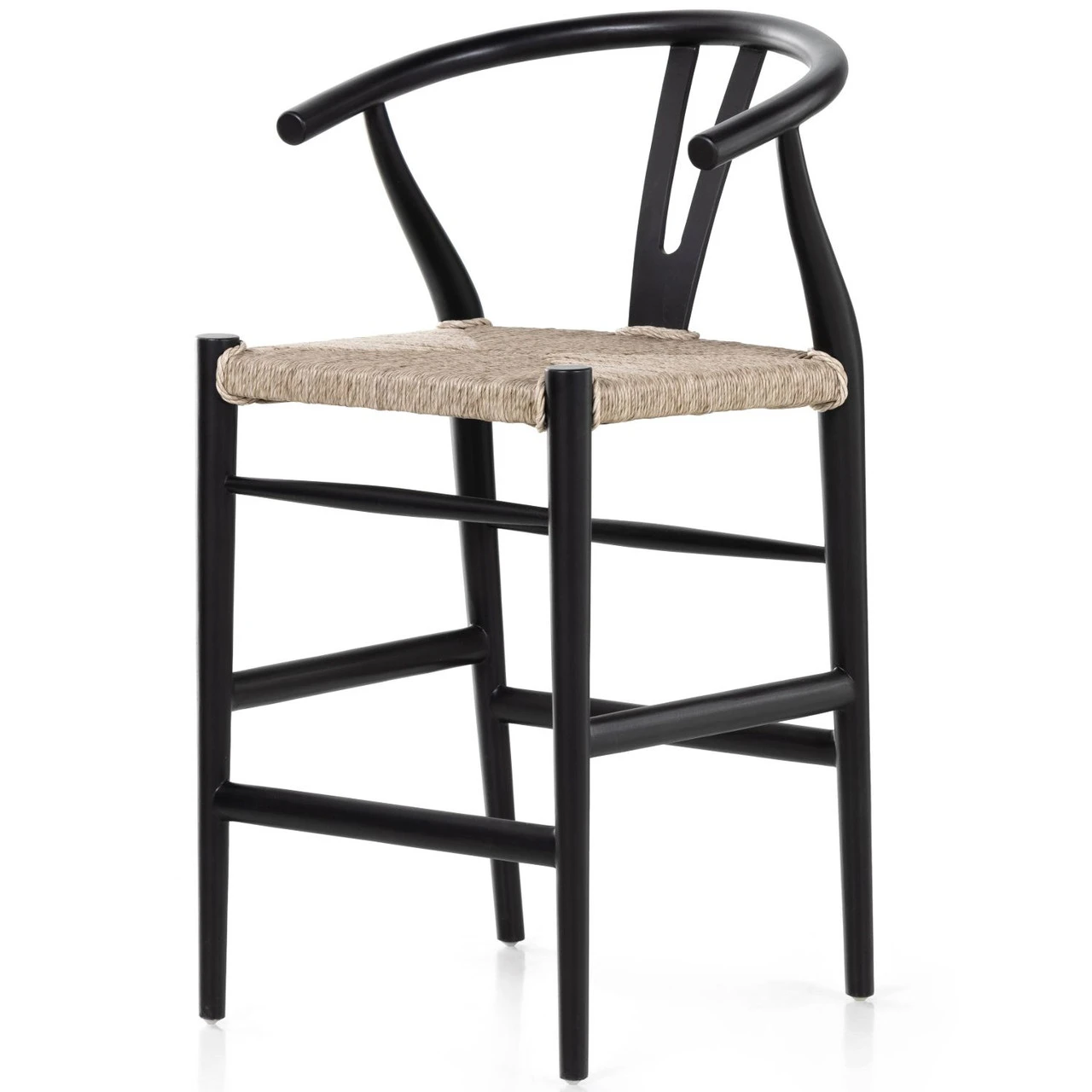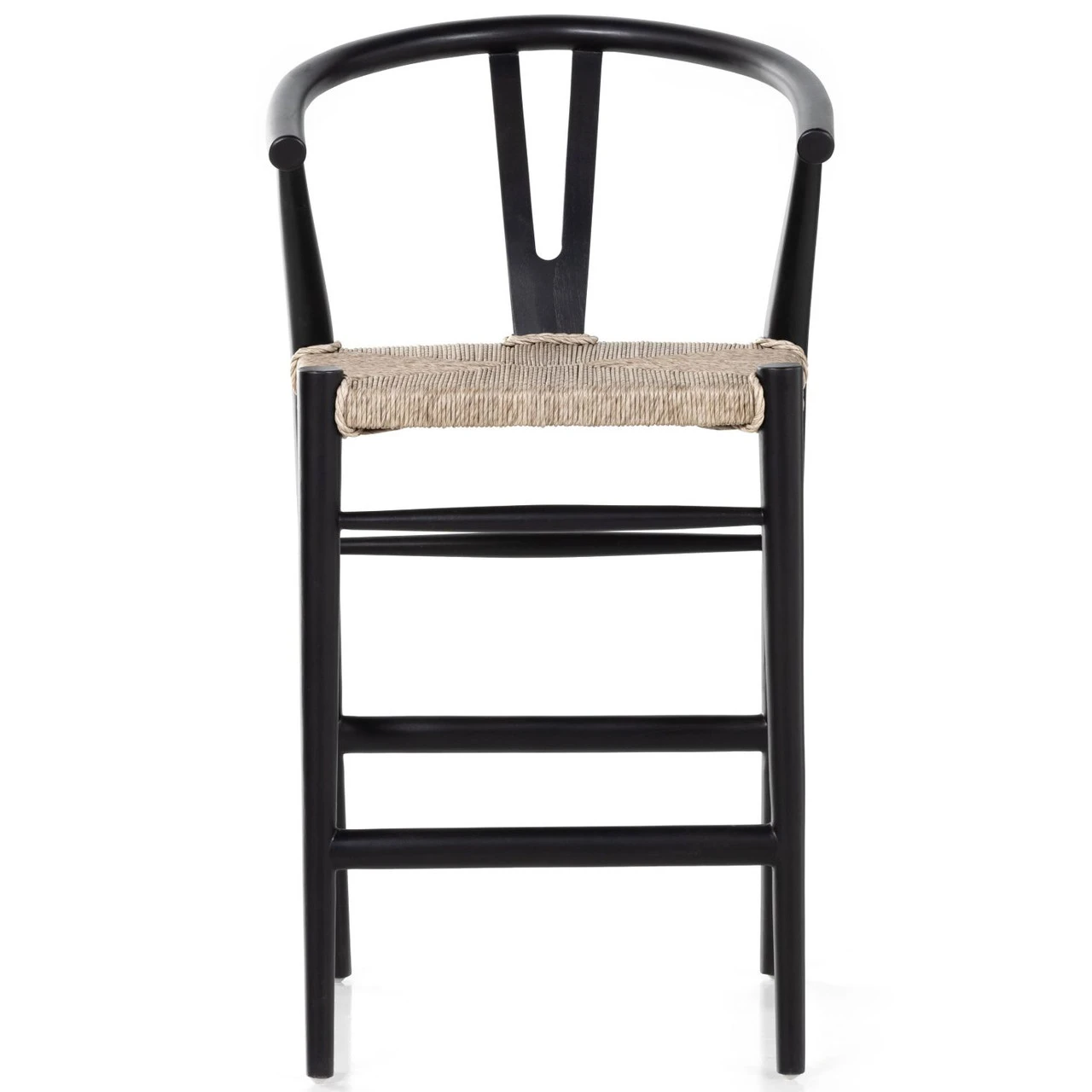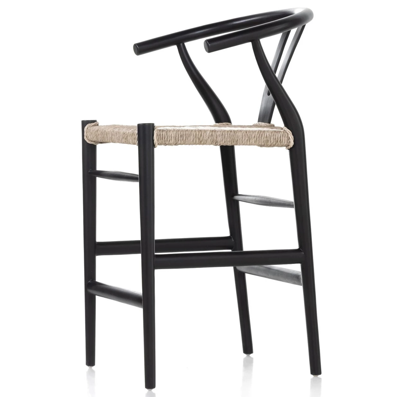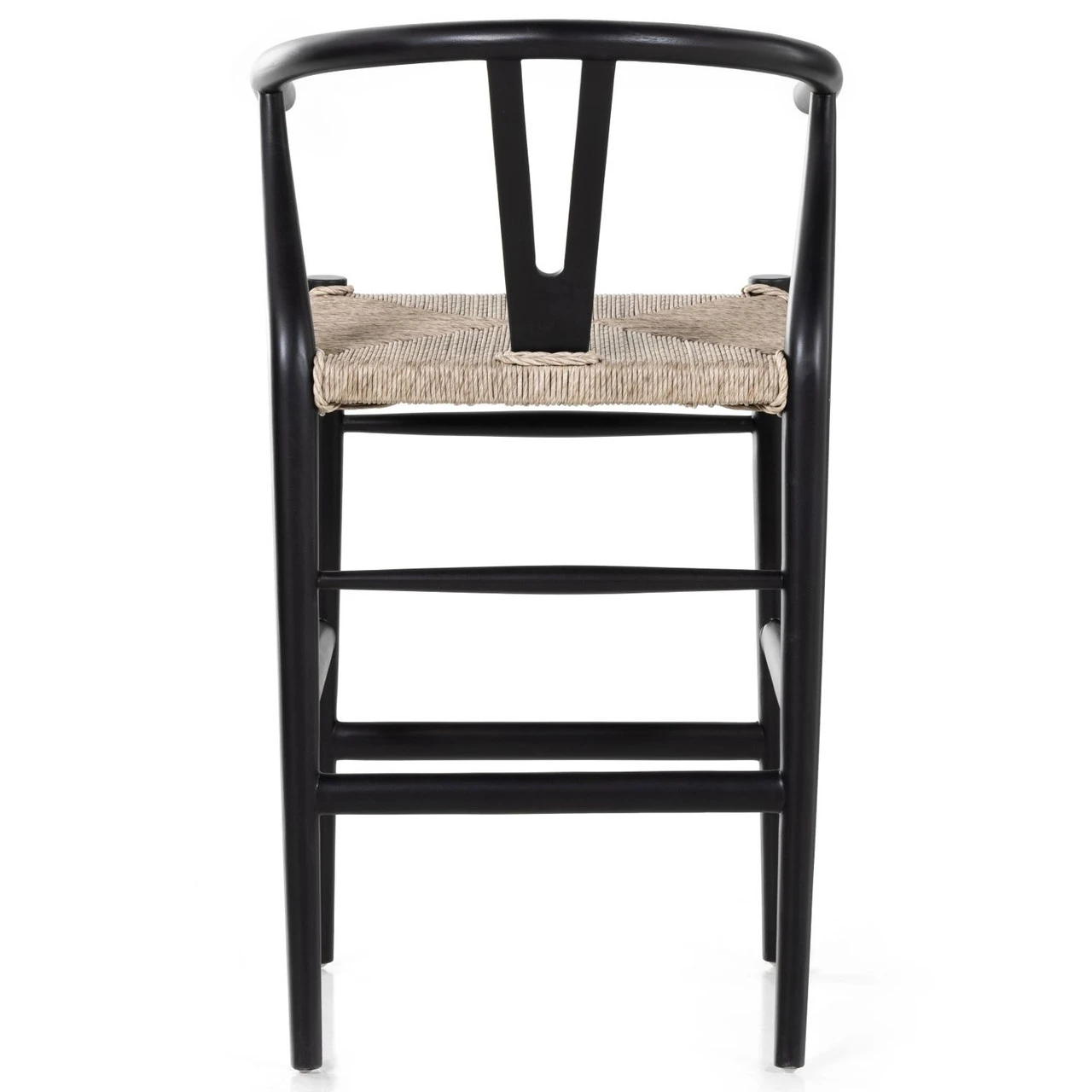 Modern curves redefine the classic wishbone-style counter stool. Vintage white all-weather wicker is woven for texture and contrast against black teak framing. For indoor use only.