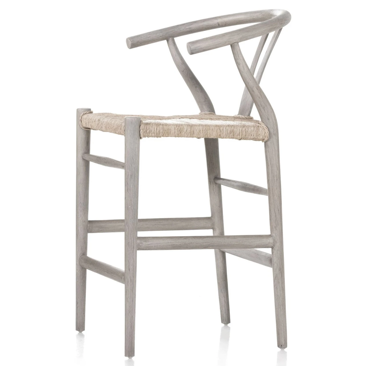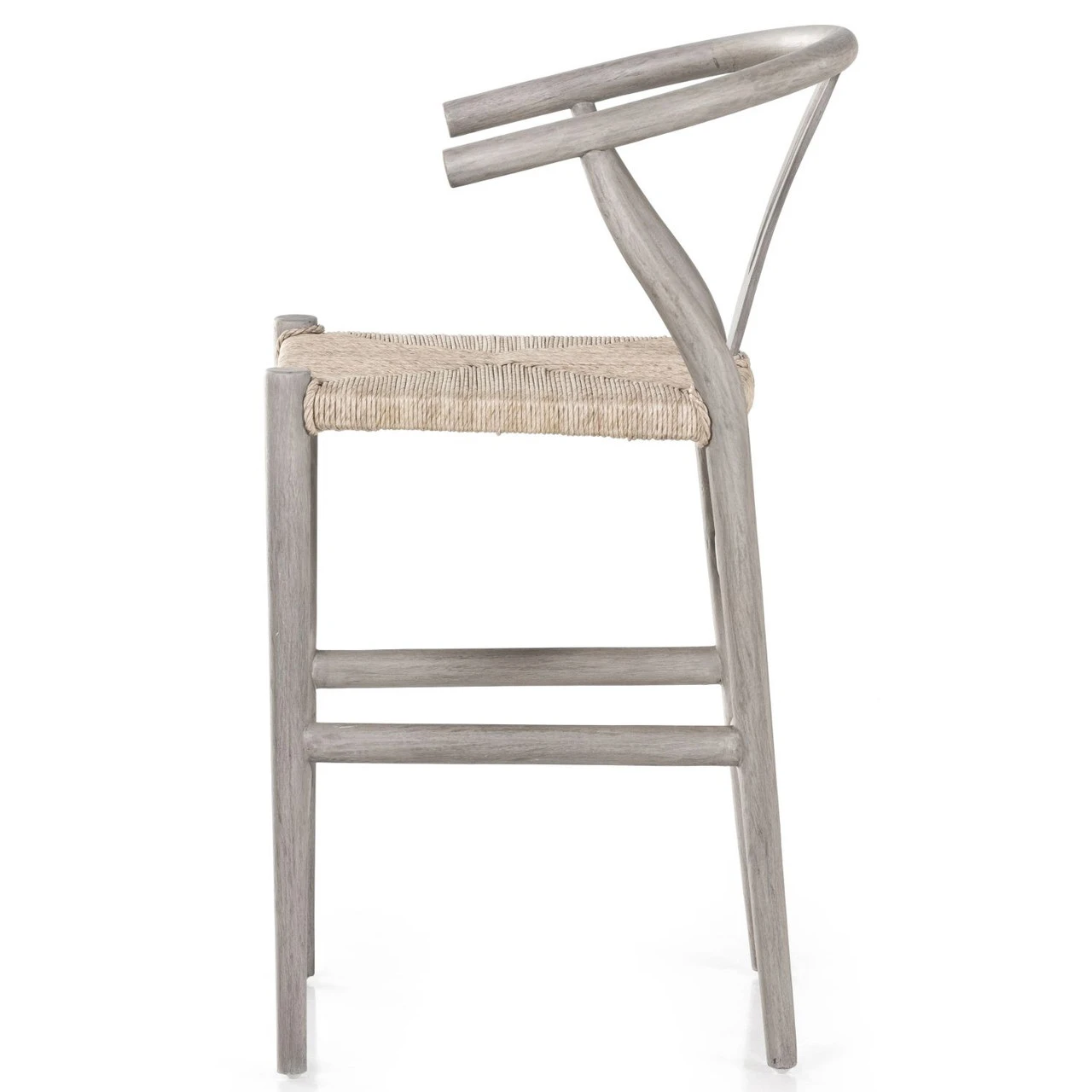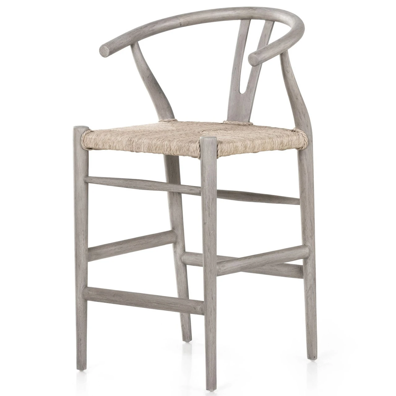 Modern curves redefine the classic wishbone-style counter stool. Vintage white all-weather wicker is woven for a dose of fresh texture within weathered grey teak framing. Cover or store indoors during inclement weather and when not in use.
