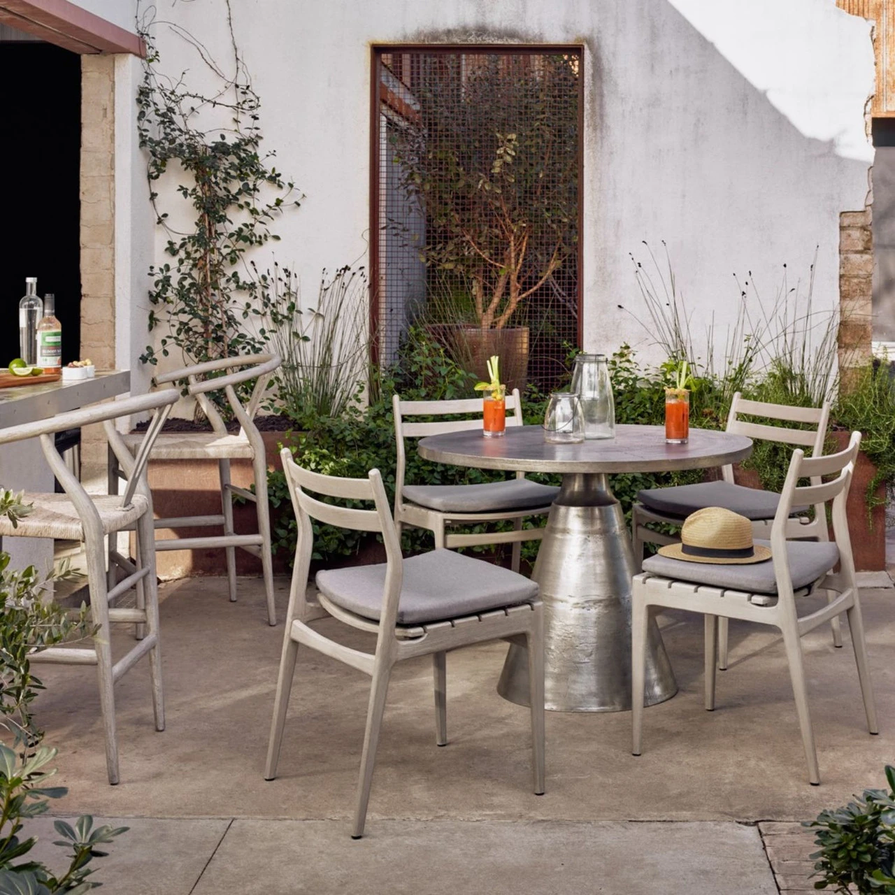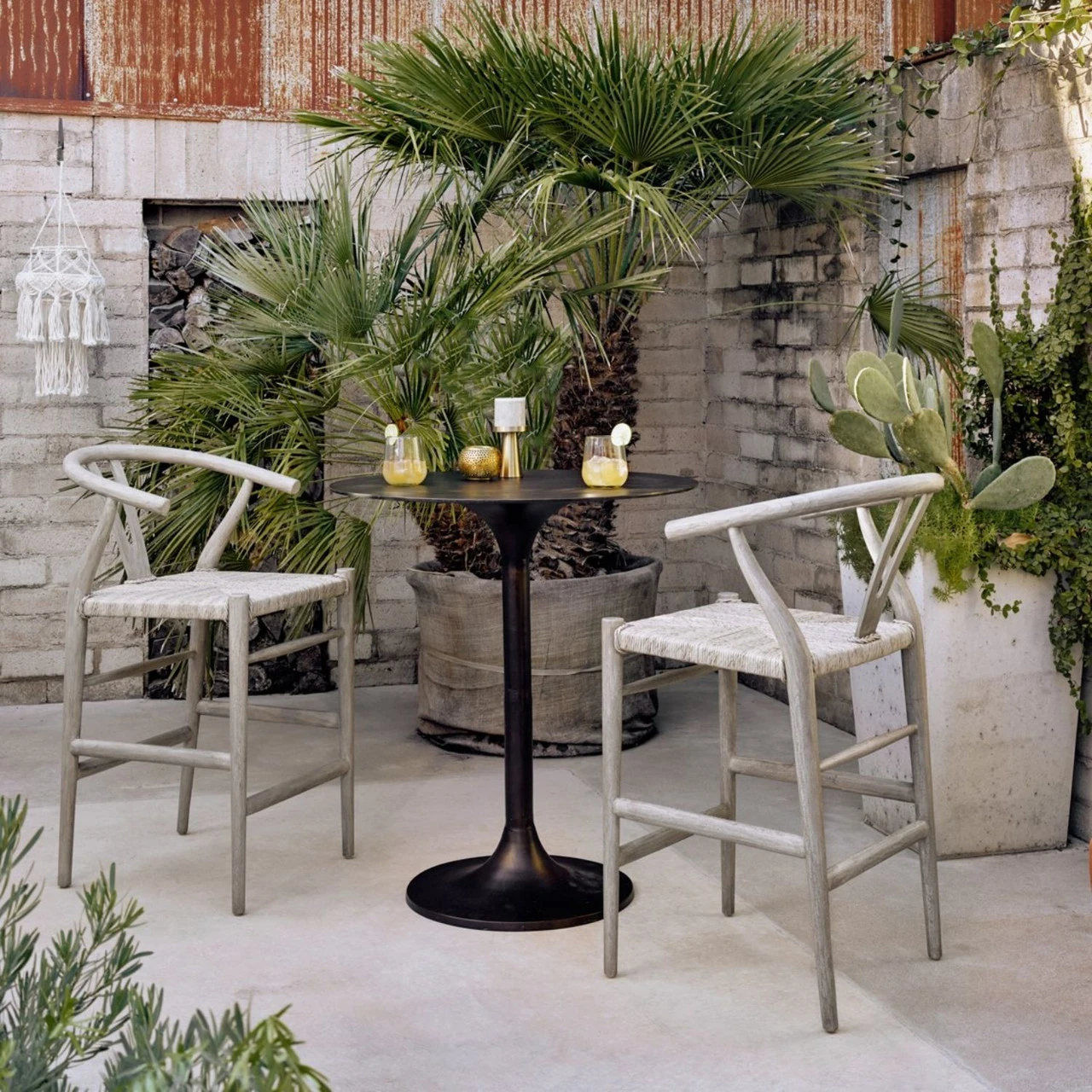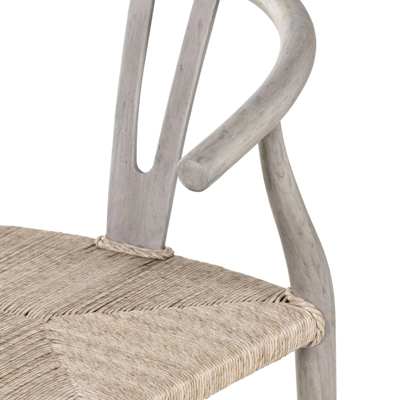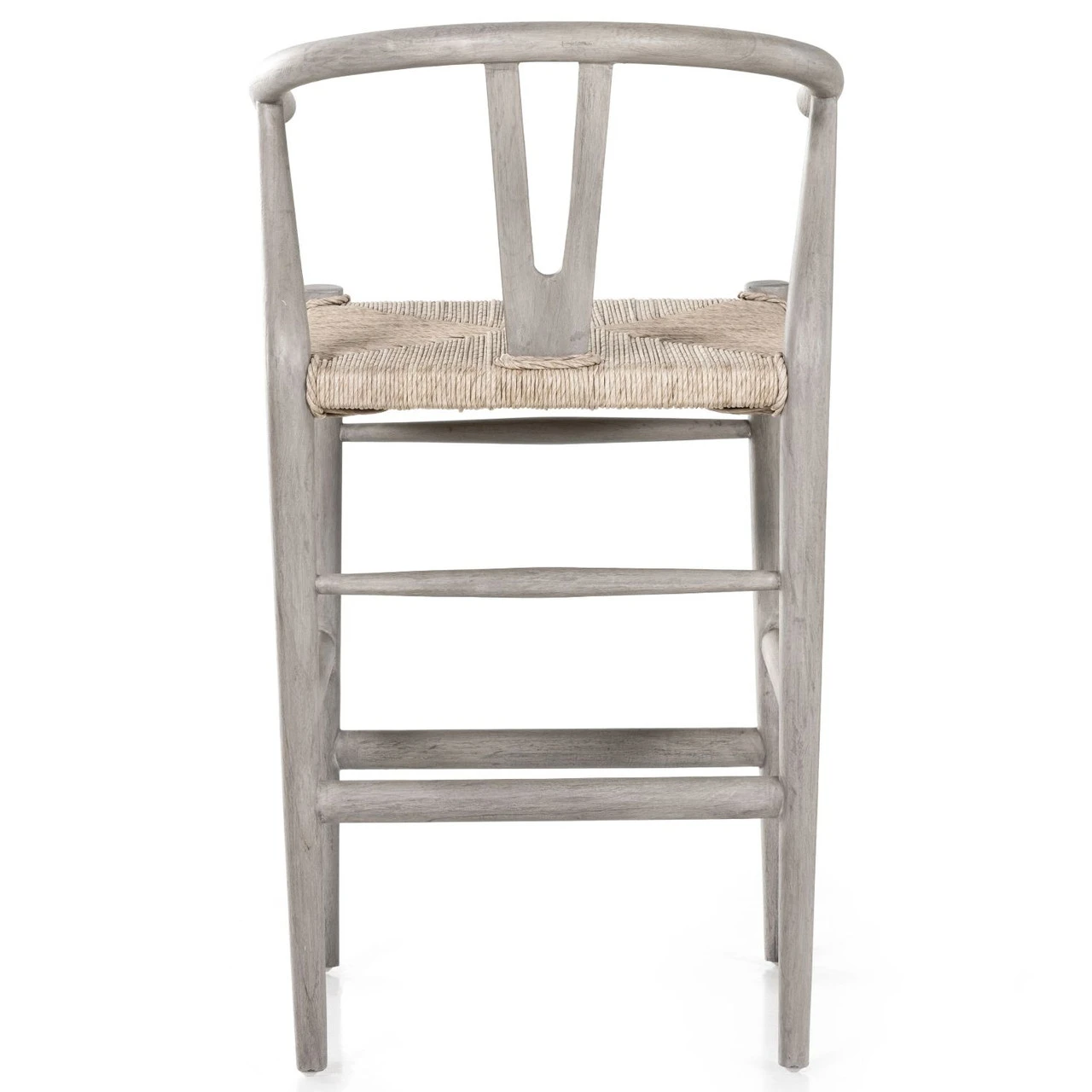 Modern curves redefine the classic wishbone-style counter stool. Vintage white all-weather wicker is woven for a dose of fresh texture within weathered grey teak framing. Cover or store indoors during inclement weather and when not in use.