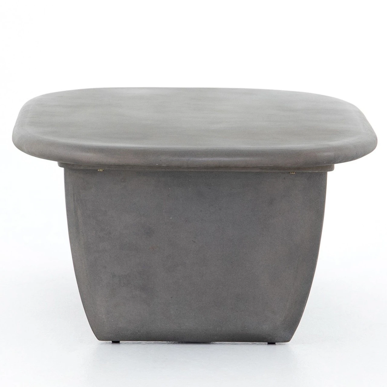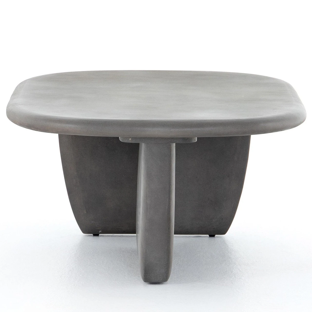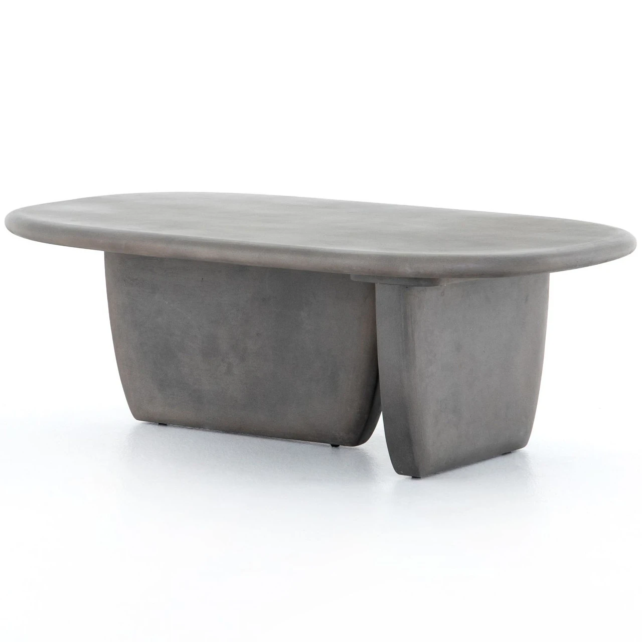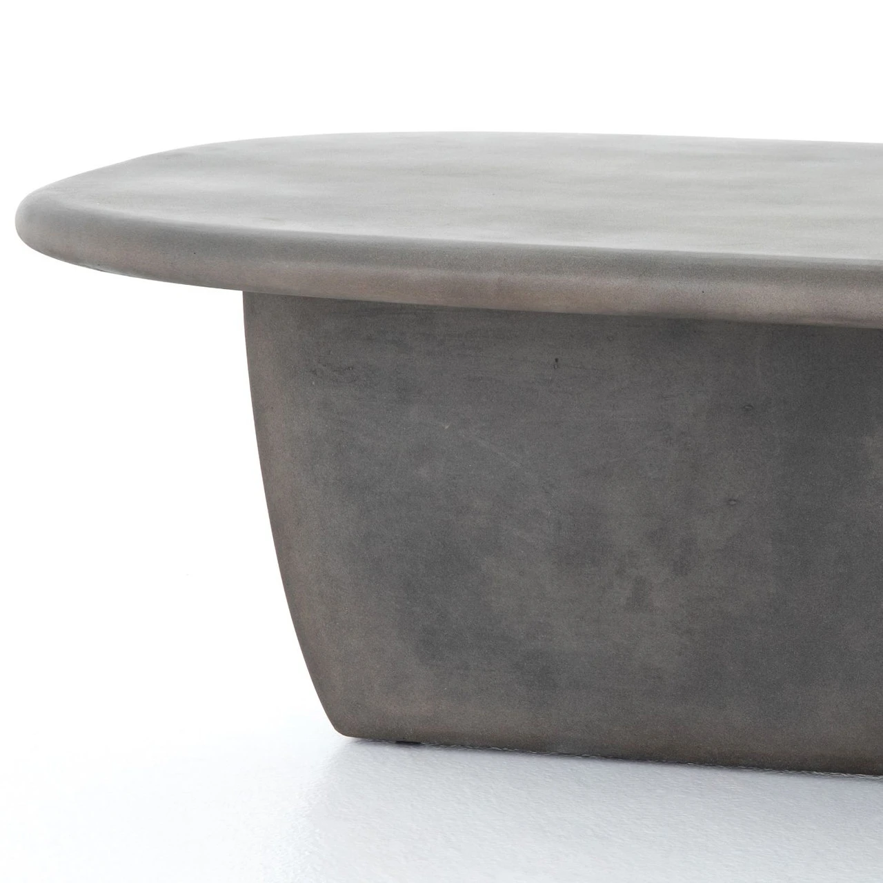 Modern and curve-driven. Dark grey concrete forms a rounded rectangle top with bullnose edging, reminiscent of a shapely surfboard. Perpendicular bases bring eye-catching interest to outdoor lounging. Cover or store inside during inclement weather.