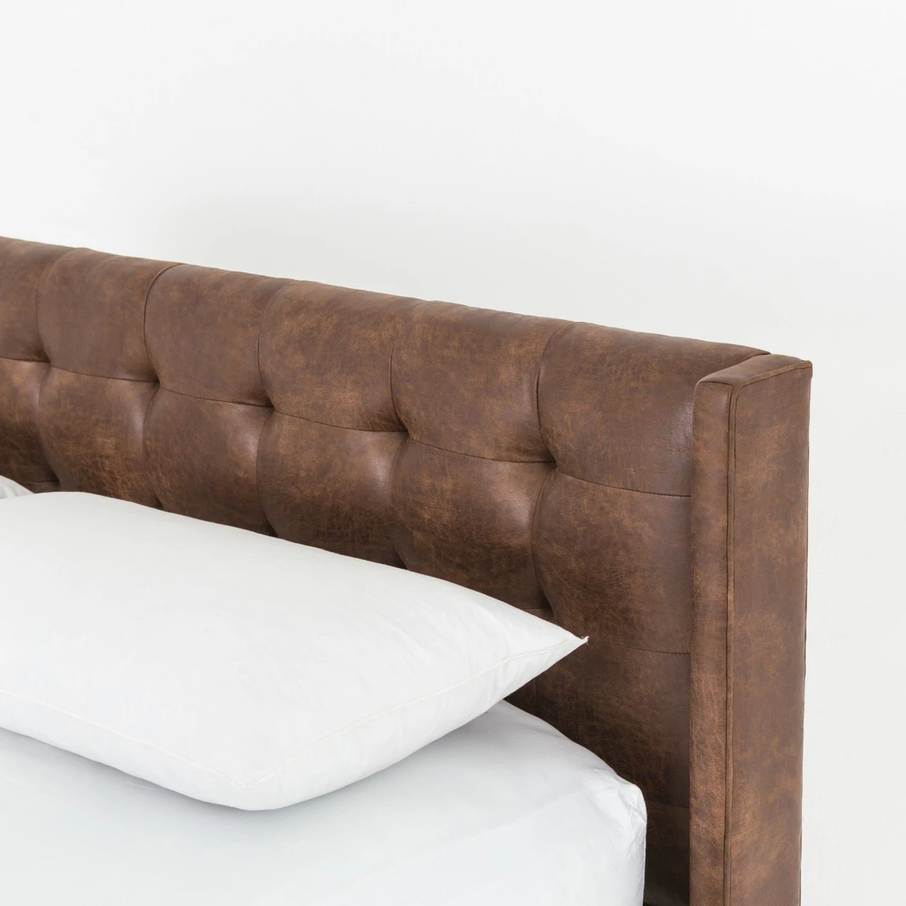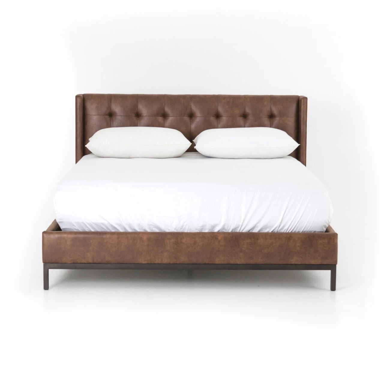 Subtle, modern elegance. A low profile modern Italian design pares with classic wingback tufted headboard to its modernist essence. Our box-tufted shelter leather beds combine the elegant symmetry of square button tufting with the luxurious comfort of an leather upholstered headboard that pairs with a simple gunmetal iron base. The Newhall Box-Tufted Shelter Leather Platform Bed in Queen size features Vintage Tobacco color leather upholstery and a sturdy mattress support system which eliminates the need for a box spring.