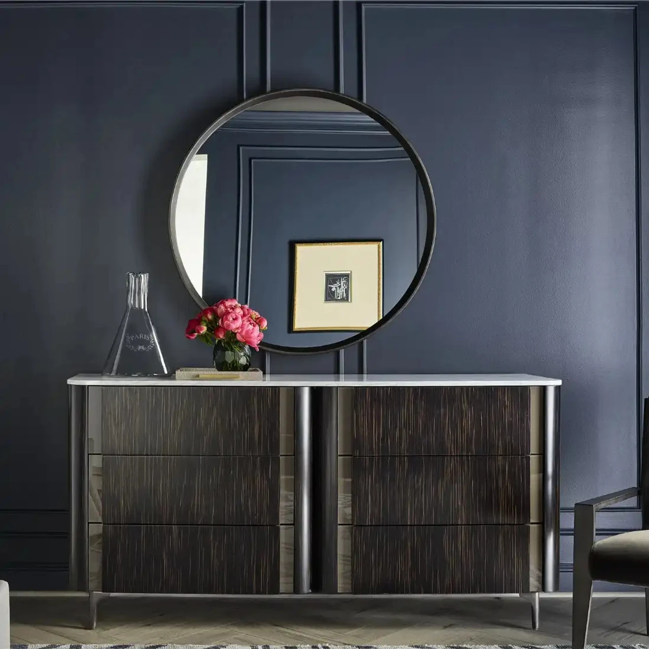 Lavish yet versatile, the Nina Magon Drawer Dresser is a full expression of modern European style, crafted with a deluxe white Carrara marble top, six spacious drawers, and a dark finish on the body.