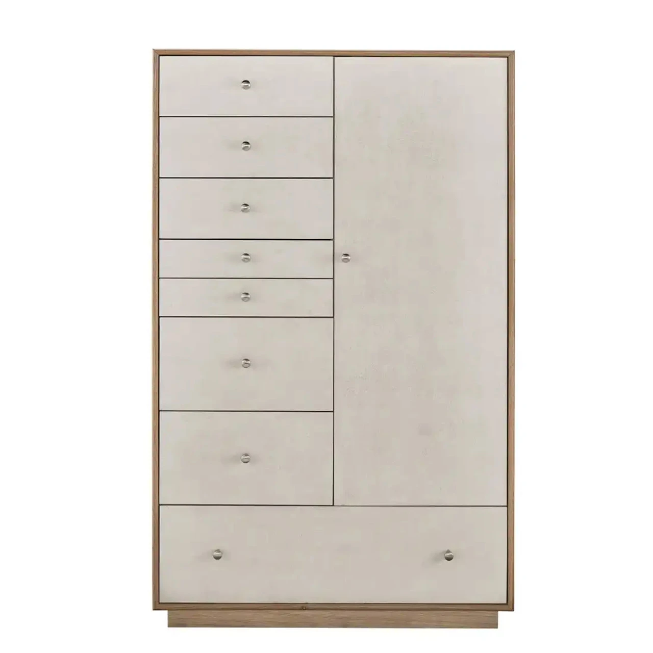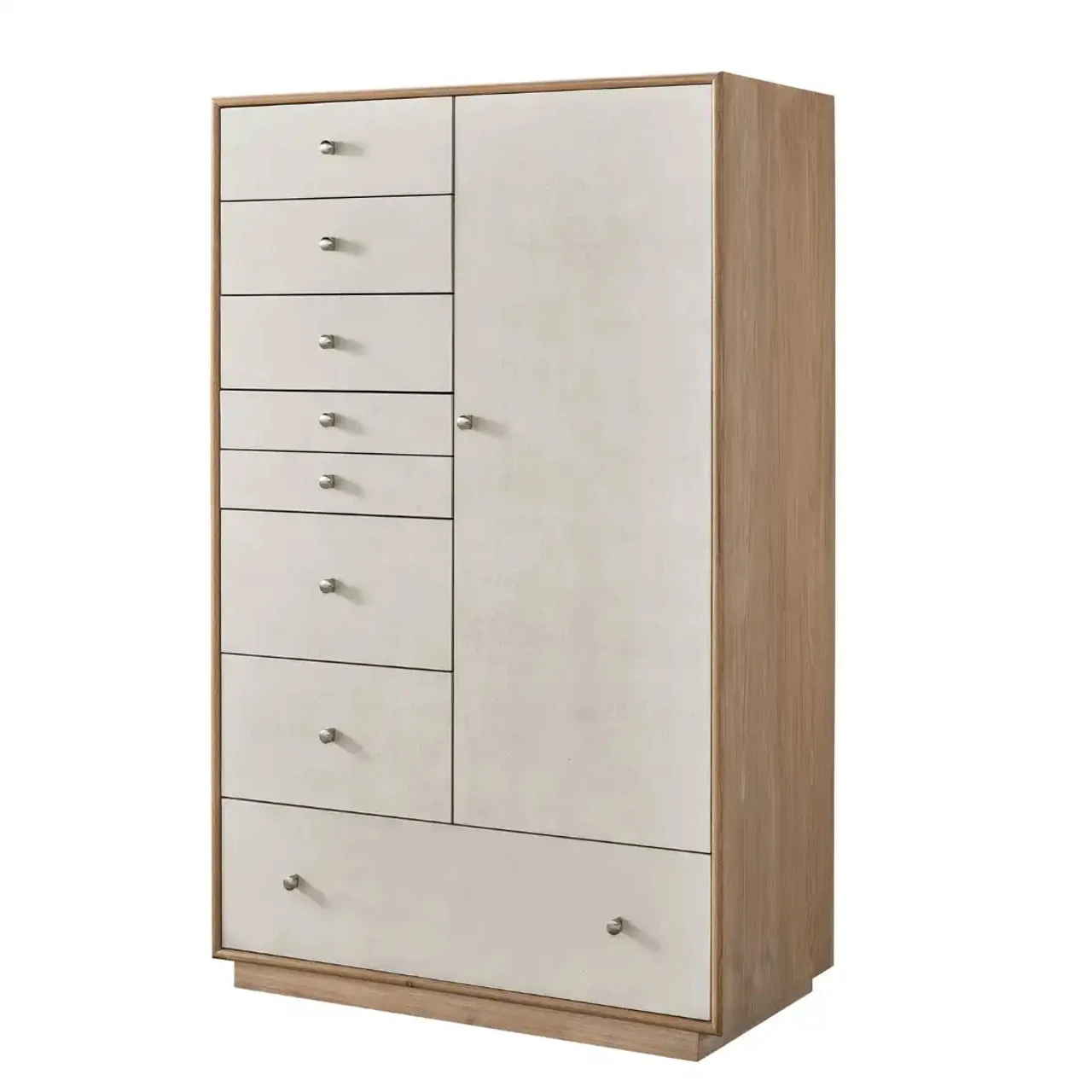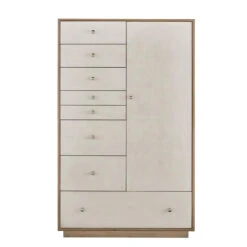 The fresh oak-finished Chifforobe forges its own path with a fully unique silhouette, featuring an abundance of storage space from drawers to an interior clothing rod, to enclosed jewelry trays and more.
