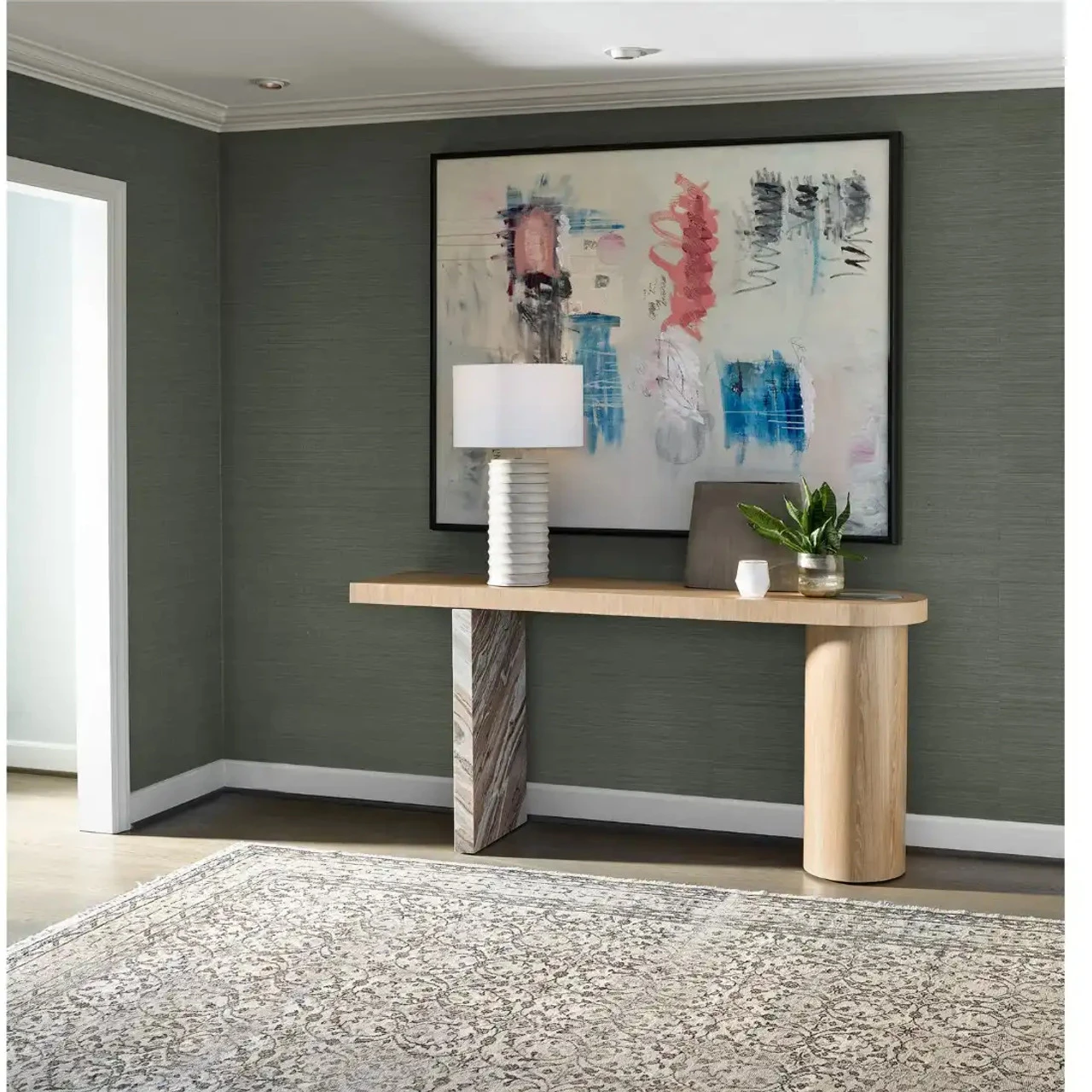 Imaginative and free-spirited, the Wood and Stone Console creatively marries an oak-finished silhouette with one marble pedestal leg offset by a petite marble tabletop accent.