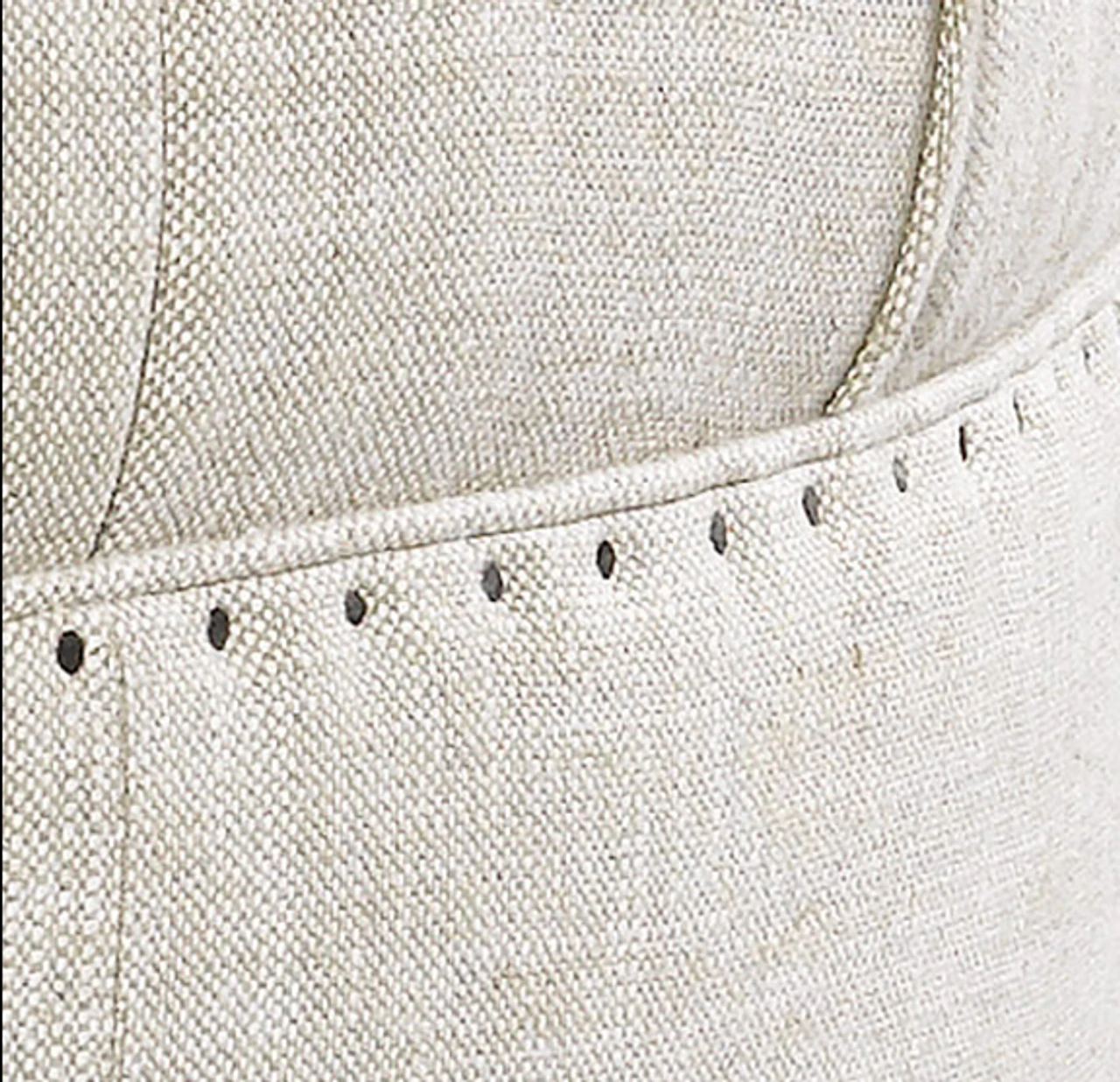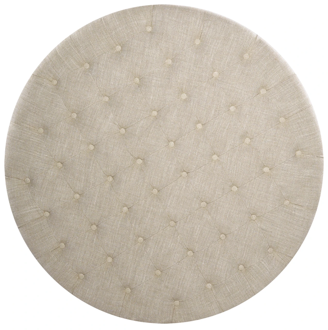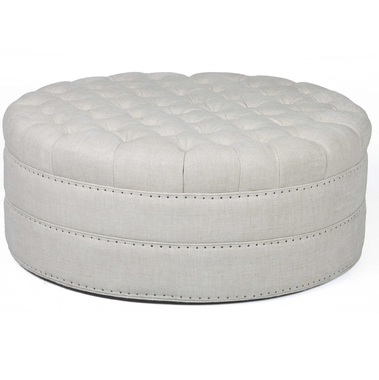 Insipired from classic Chesterfield design, grandly proportioned, with a low seat, plush padding and button tufting. Grand Linen Upholstered Round Tufted Ottoman is a new age style ottoman wraps of 100% beige linen with hand-hammered shoe nails and tufted top cushion.