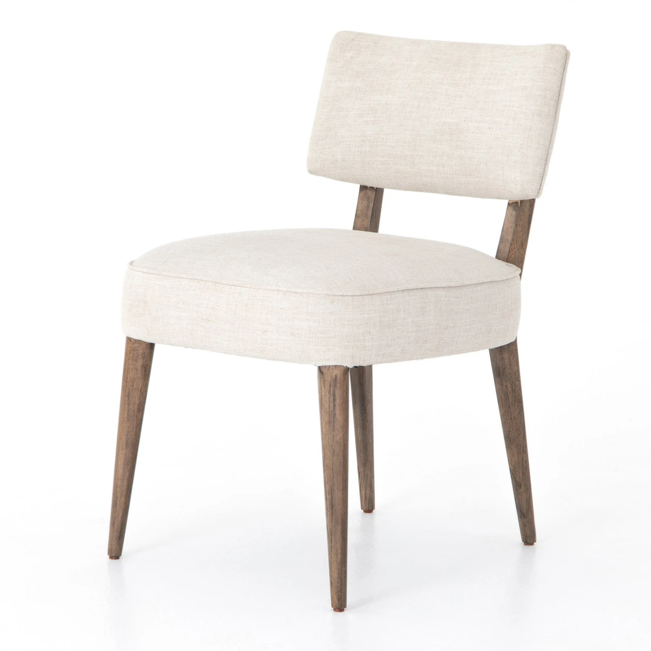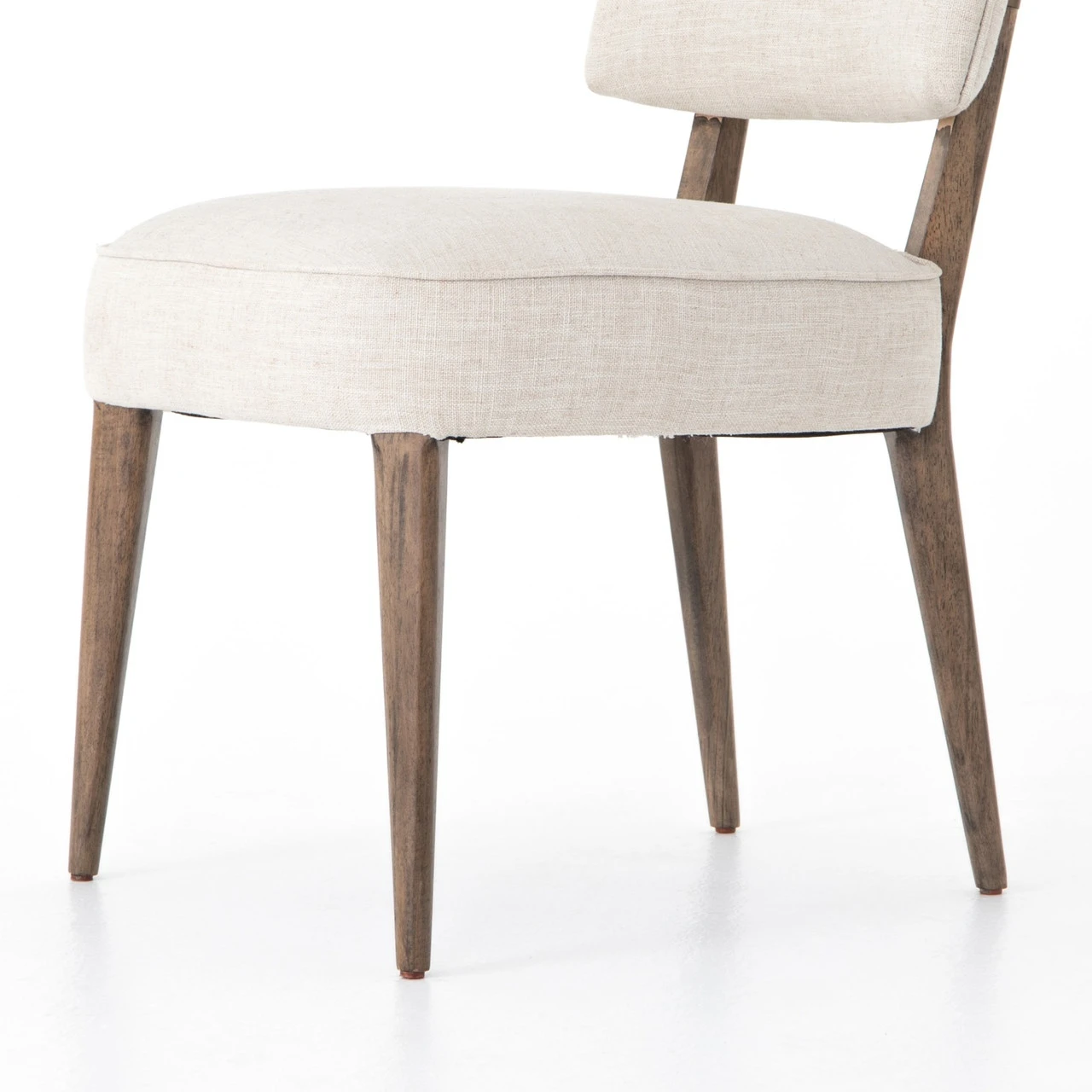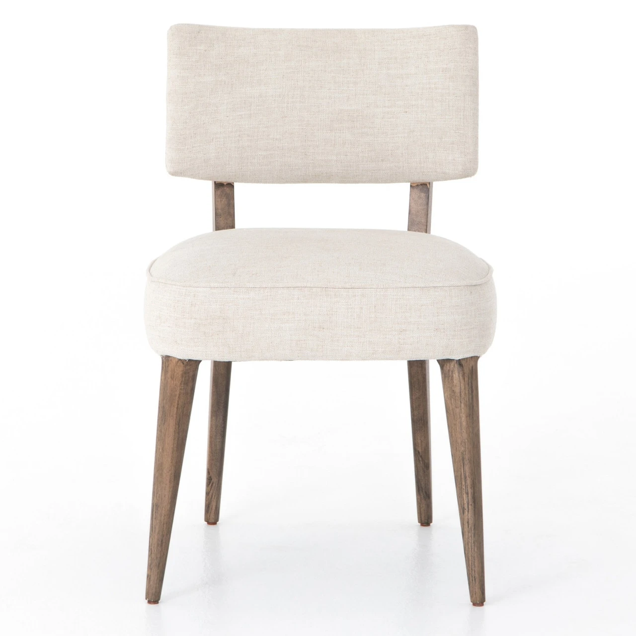 With cone-tapered parawood legs and ivory performance-grade seating of linen blend, this crisp, clean dining style is durably designed for dinners and parties alike.