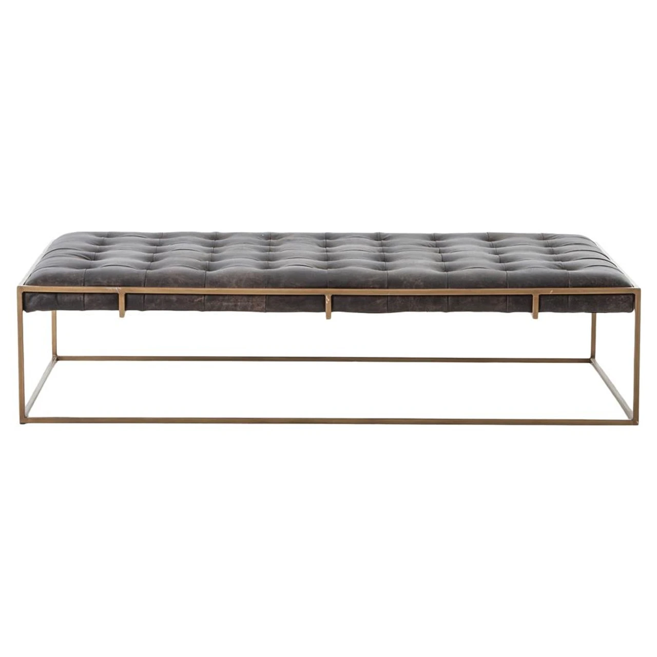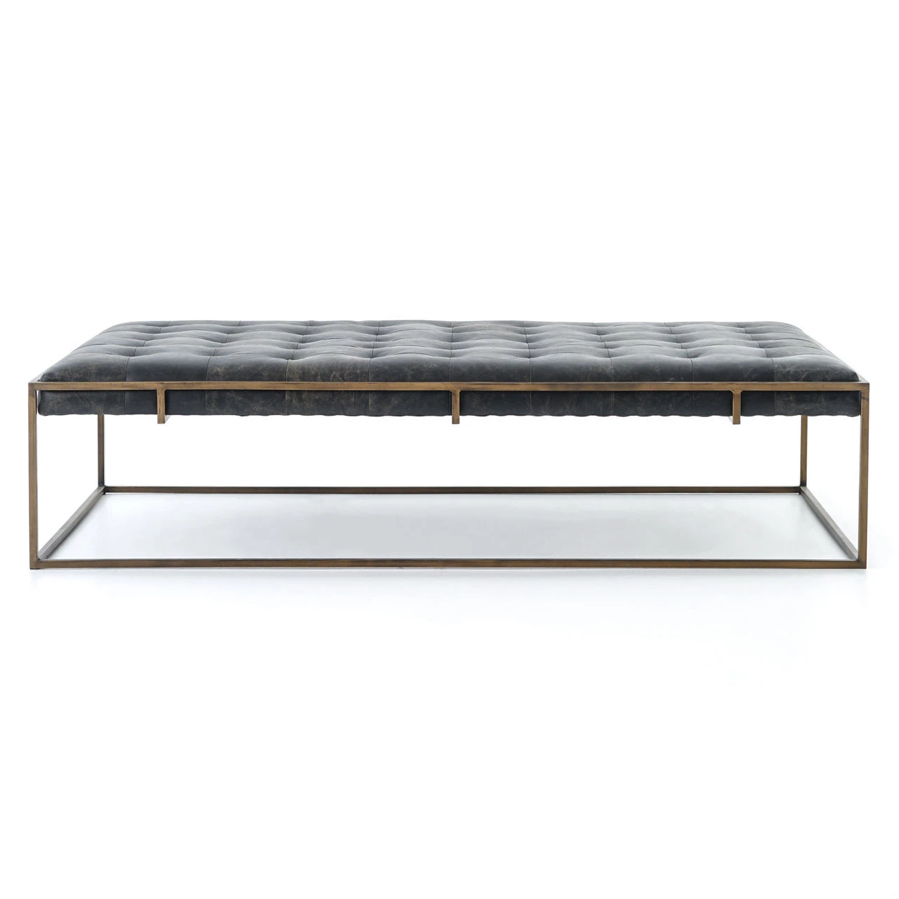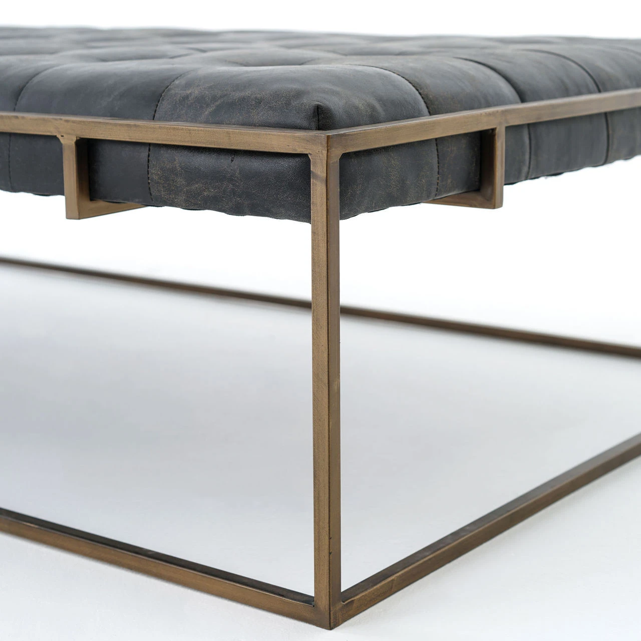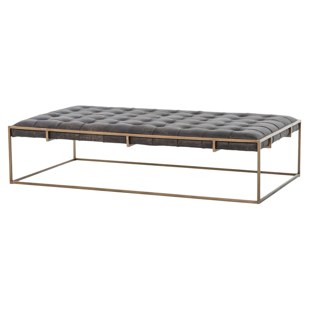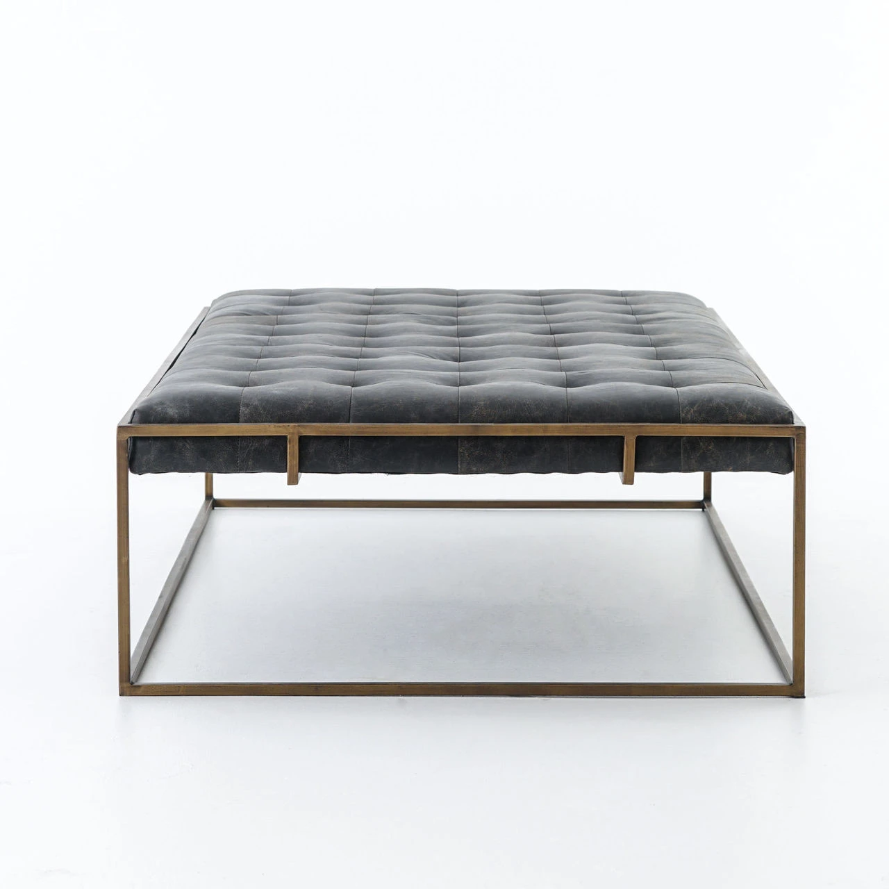 Traditional library furniture style meets modern sensibilities in our Oxford Tufted Black Leather Ottoman Coffee Table. Blind-tufted, top grain leather top floats inside an antiqued brass Parsons base with a cage-like detailing. This tufted cocktail ottoman is sure to be a stand-out in your living room.