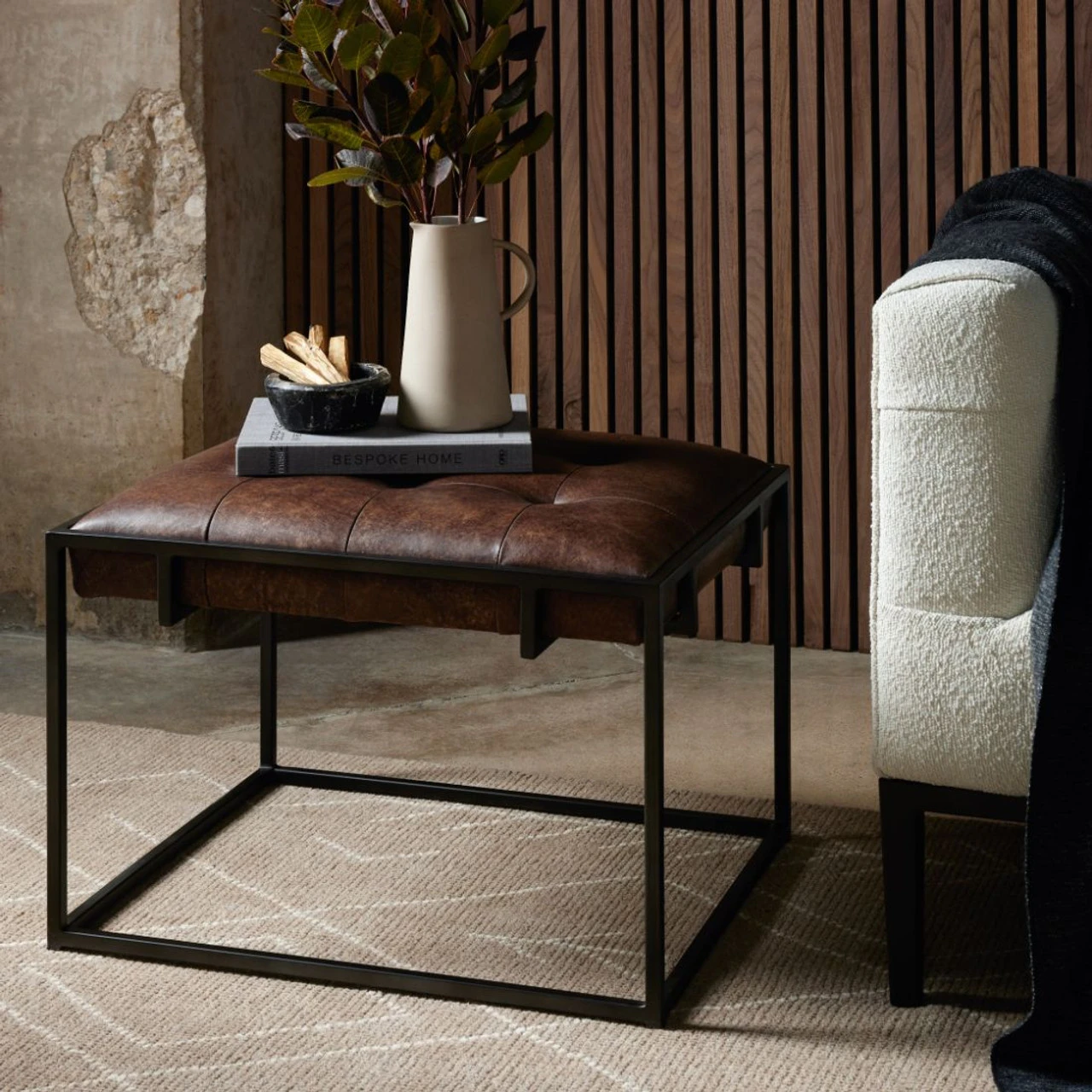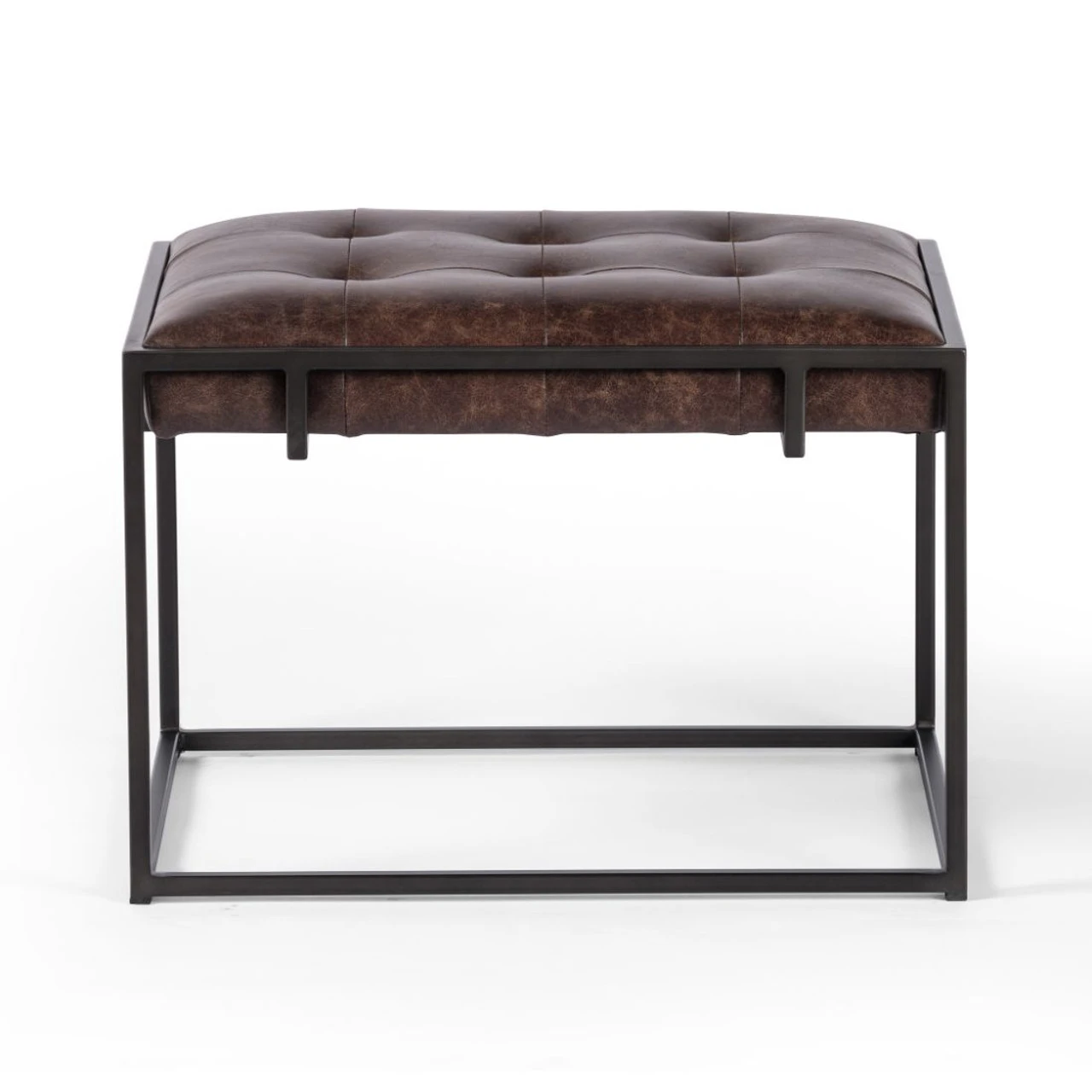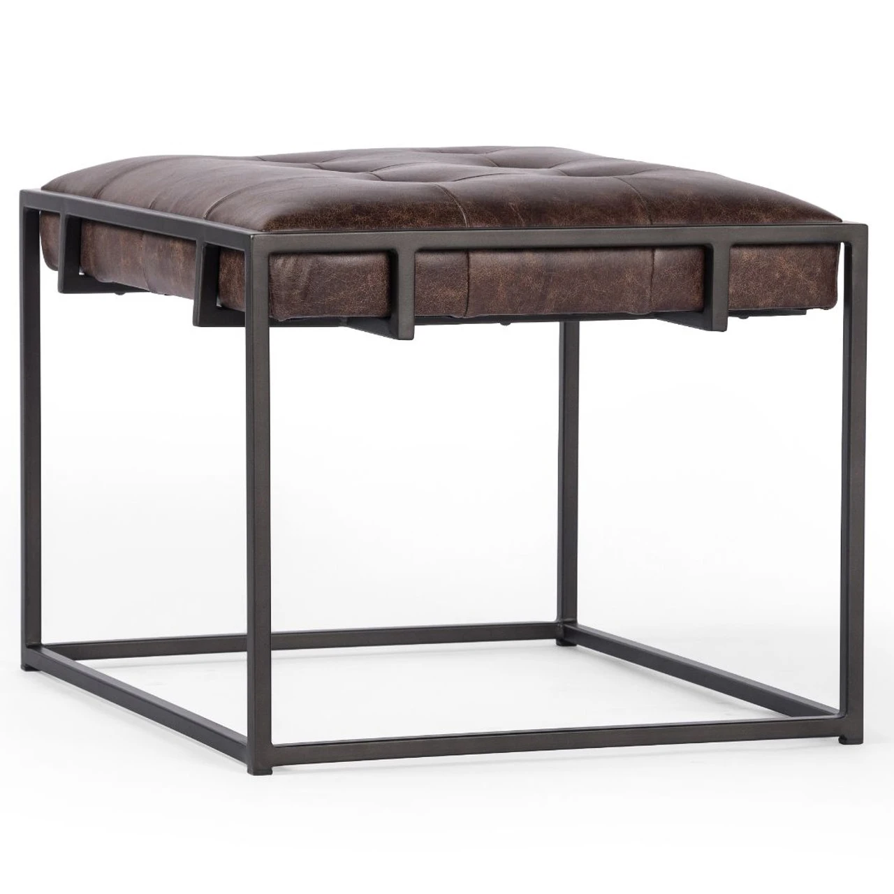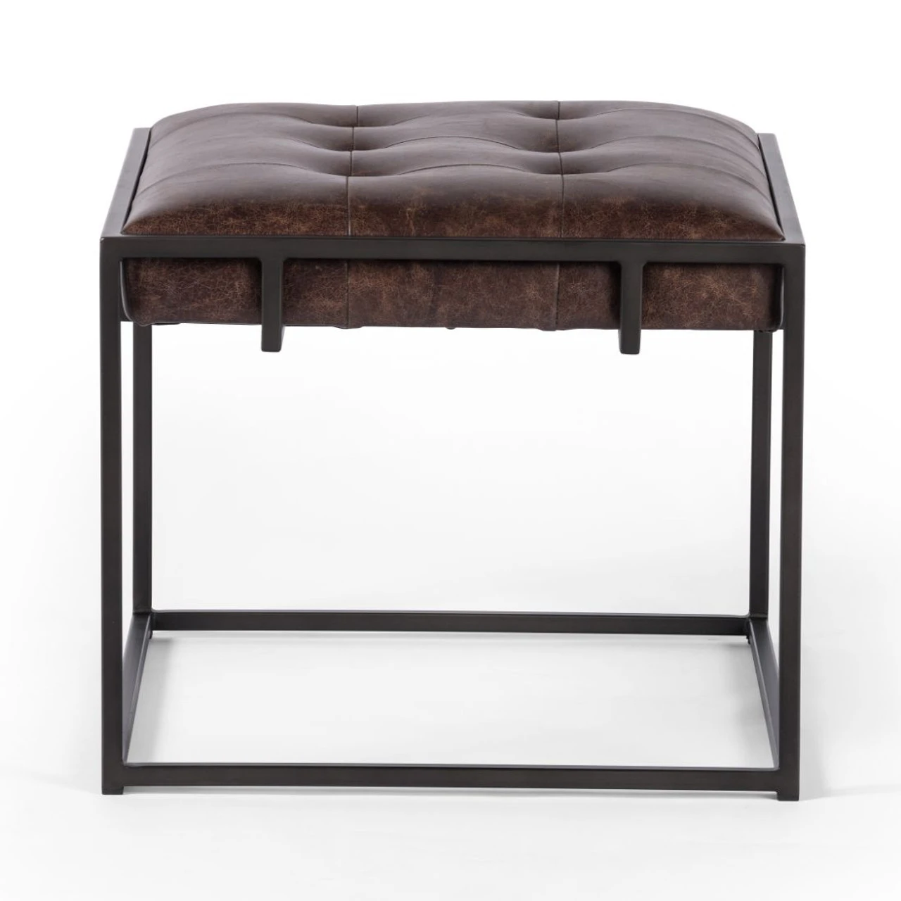 Traditional library style meets modern sensibilities. Blind-tufted, top-grain leather floats inside an iron Parsons base with cage-like detailing. This tufted side table ottoman is sure to be a stand-out in your living room.