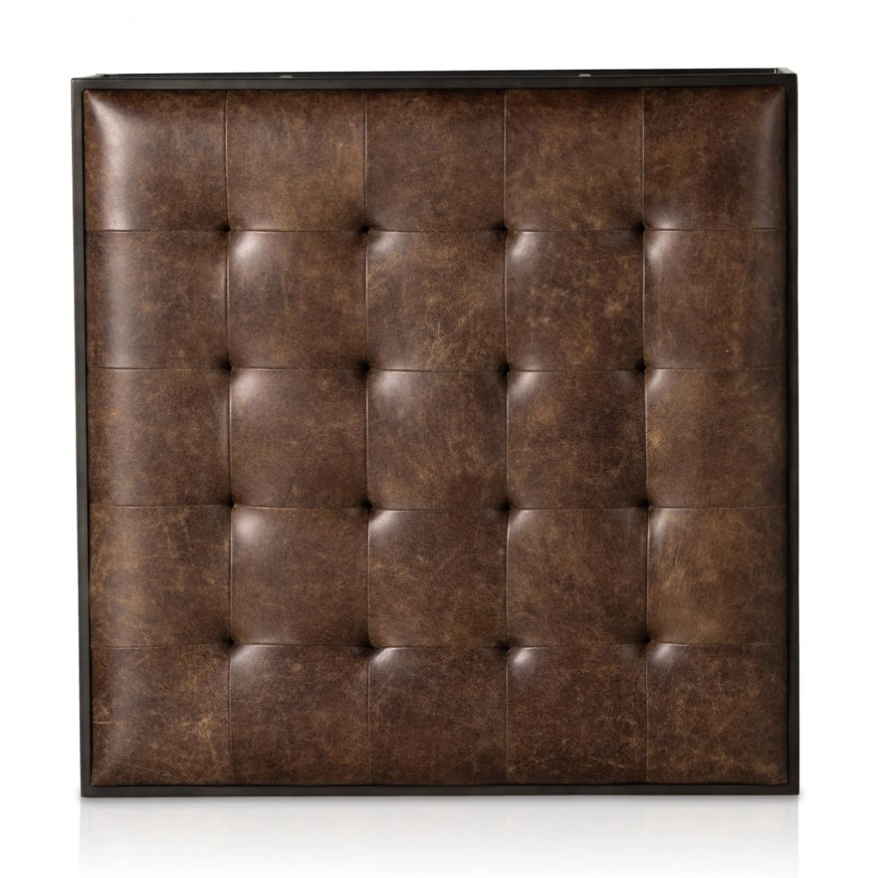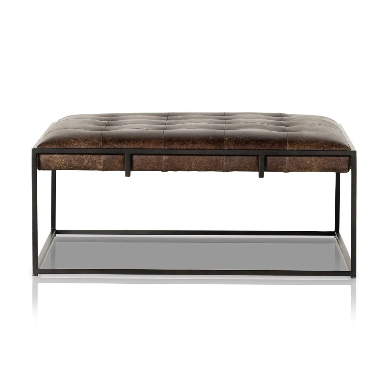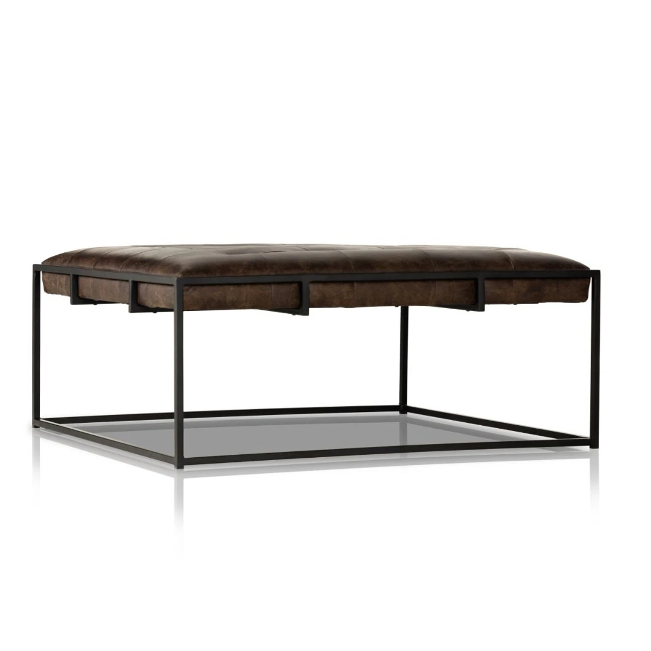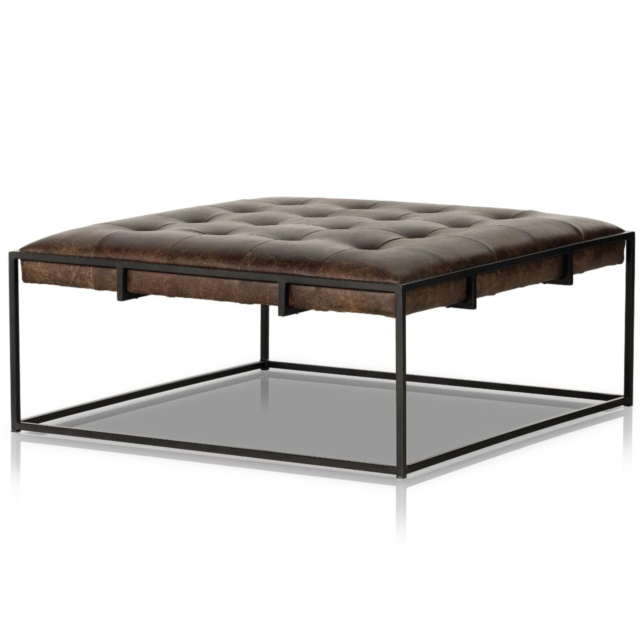 Traditional library style meets modern sensibilities. Blind-tufted top-grain leather floats within a square iron base in waxed black with cage-like detailing. This tufted square cocktail ottoman is sure to be a stand-out in your living room.