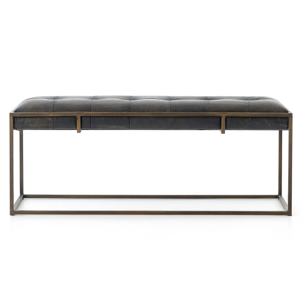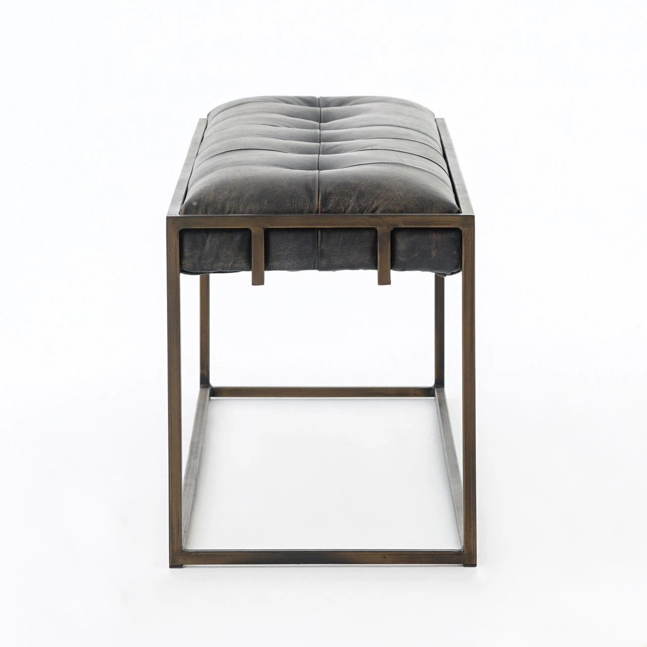 Traditional library furniture style meets modern sensibilities in our Oxford Tufted Black Leather Ottoman End Table. Blind-tufted, top grain leather top floats inside an antiqued brass Parsons base with a cage-like detailing. This tufted leather bench is sure to be a stand-out in your living room or bedroom.