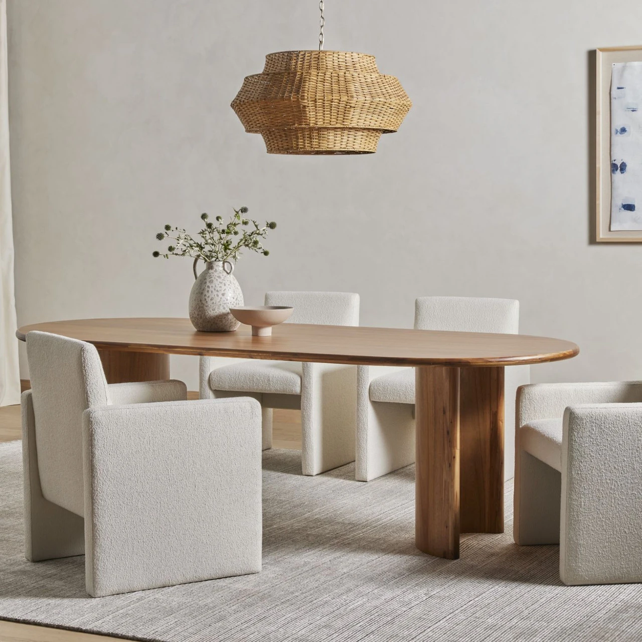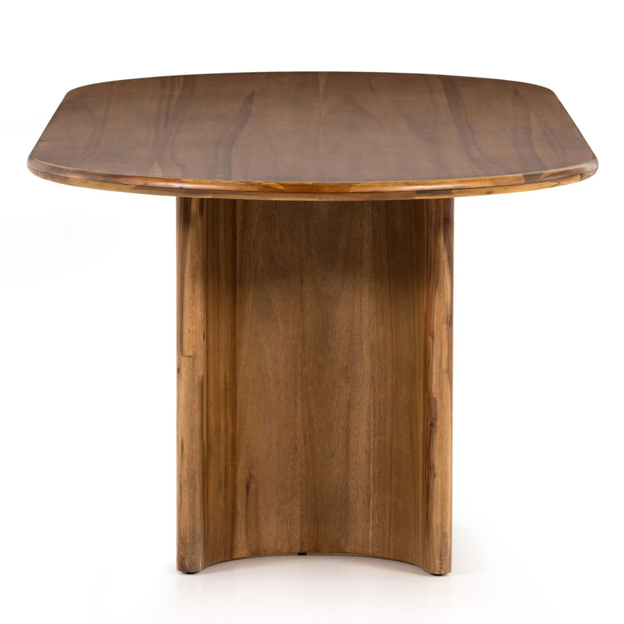 A study in shape. Sand-colored acacia forms crescent-shaped legs and a sprawling oval tabletop, bringing grand, organic-infused presence to the dining room.