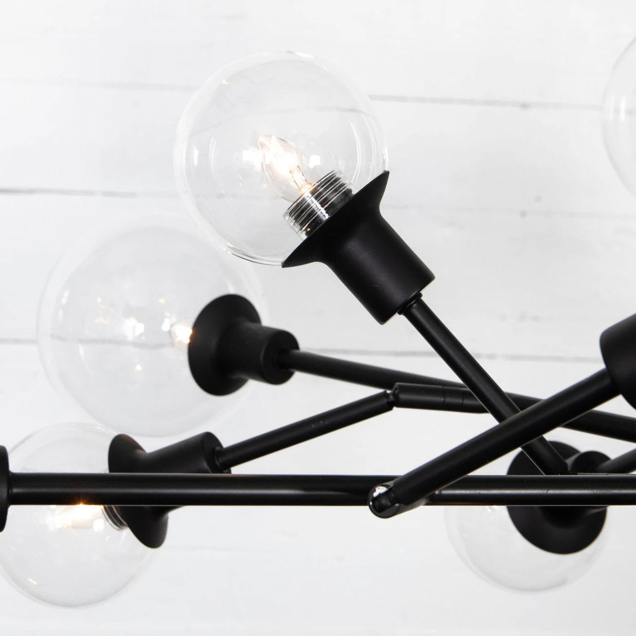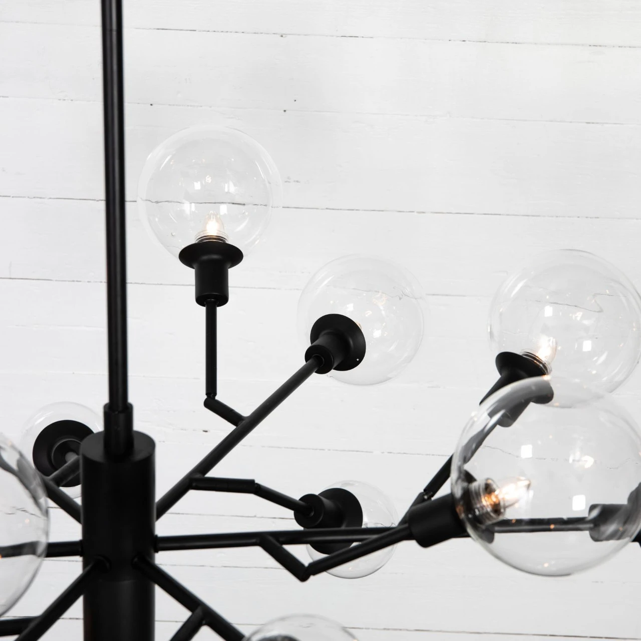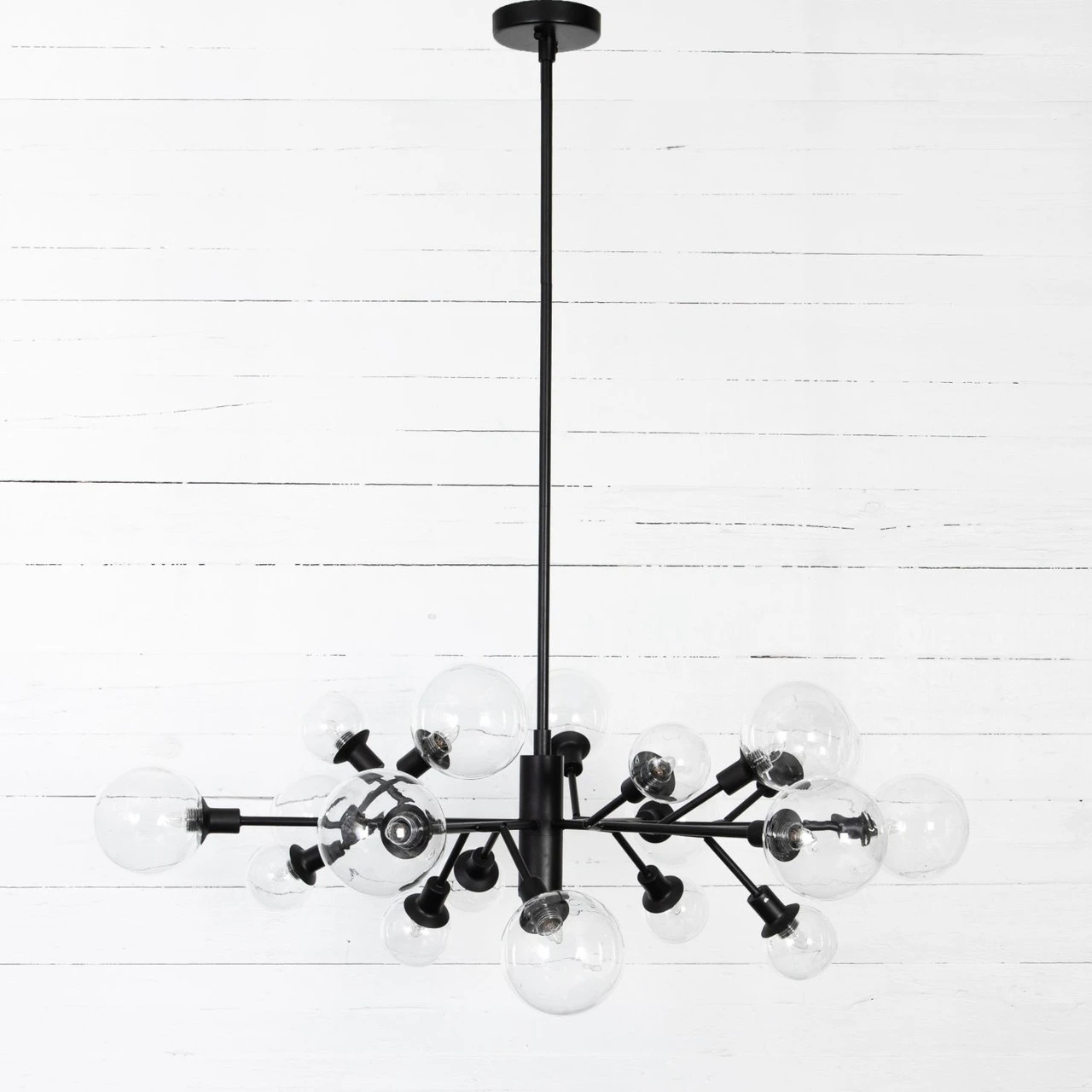 A unique cluster of sculptural iron arms are finished in a matte black for edgy elegance. Soft, mood-setting clear glass bulbs included plus three 12″ pipes. Body length adjustable from 9″ to “24”.